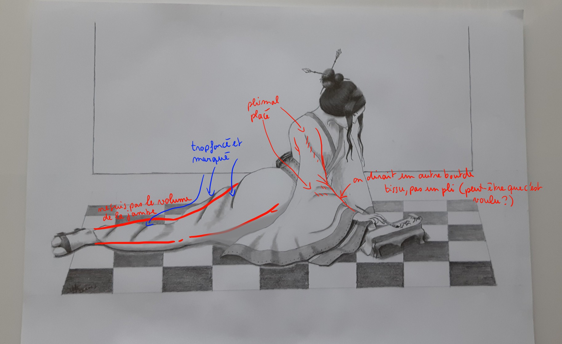 Lovely delicate work, the values are well achieved, and there are beautiful gradients. Especially nice hair. The values of the folds at the leg level are a bit too marked. I added a little shadow at the bottom of the kimono. To comment more broadly on the drawing, there is a bit of work to be done on the folds which are sometimes misplaced, but that will be addressed in a future lesson. Be sure to keep in mind the shape of the body under the clothes. Looking at references can help. The perspective of the flooring is not good but that will also be covered in lessons towards the end of the training. It might indeed be interesting to retry this drawing at the end of the training and see the improvement :) Beautiful drawing anyway!
