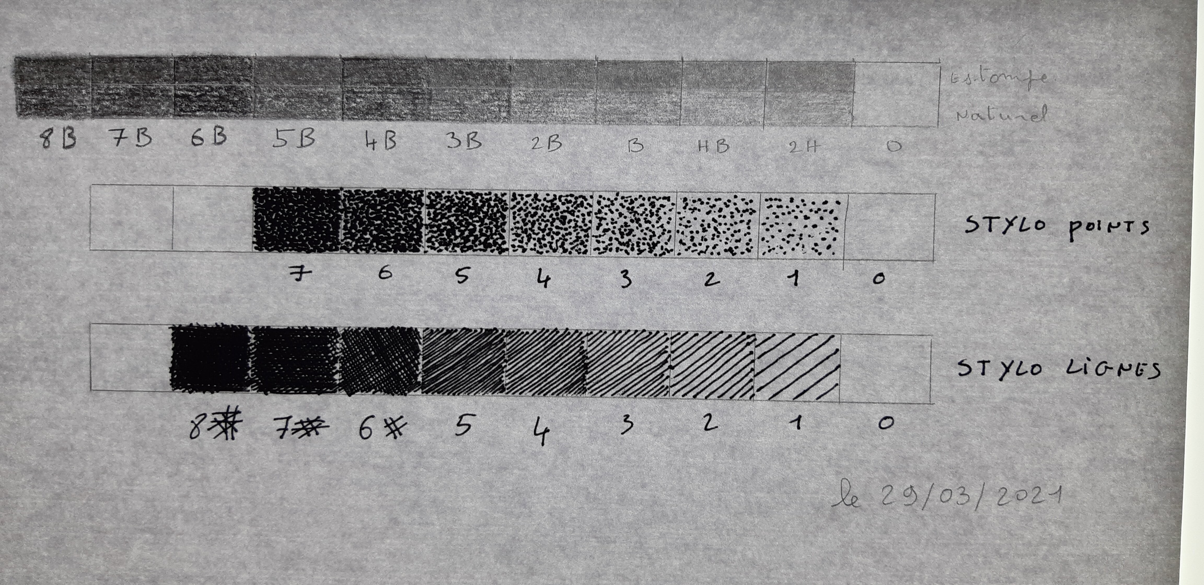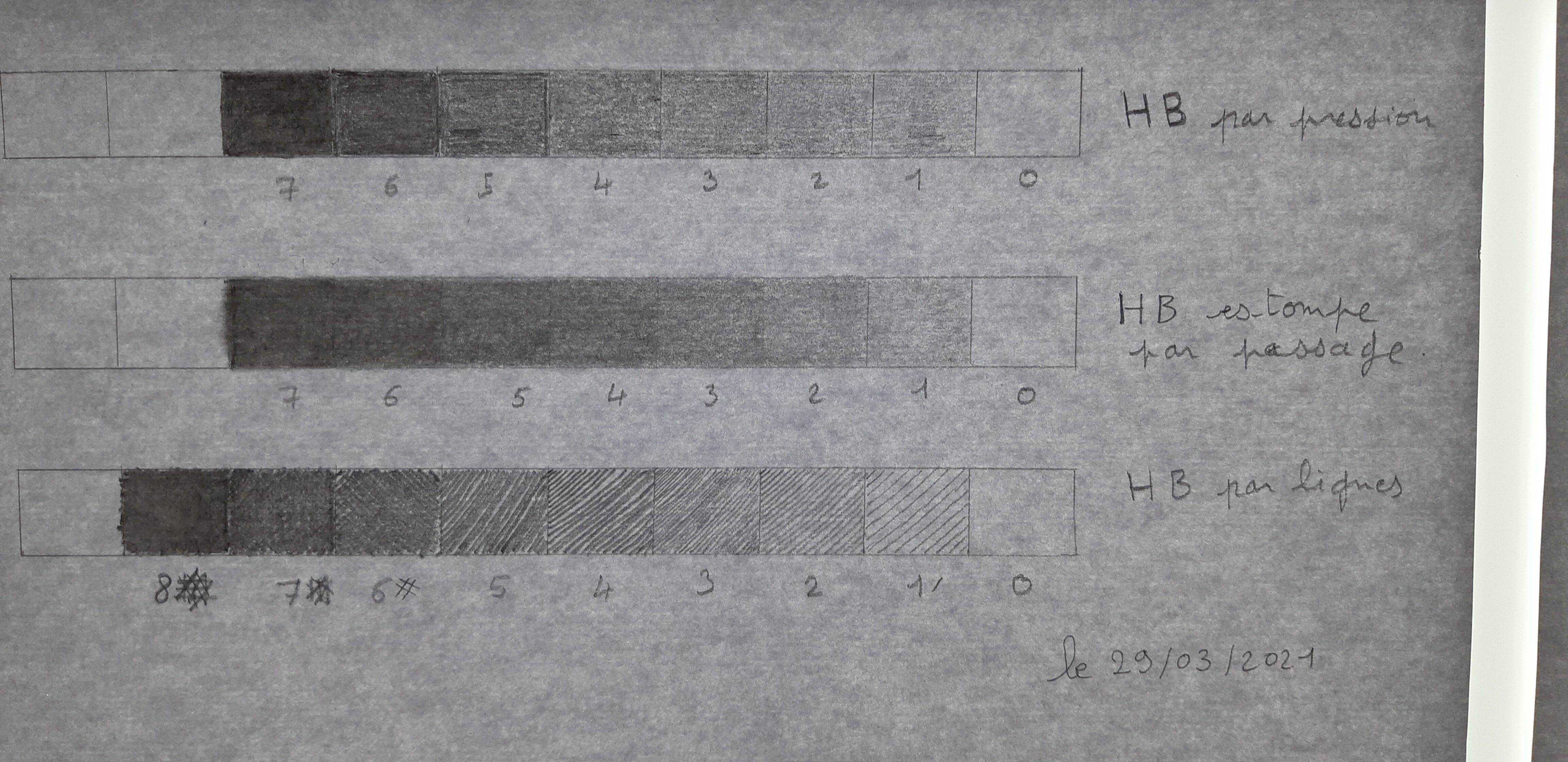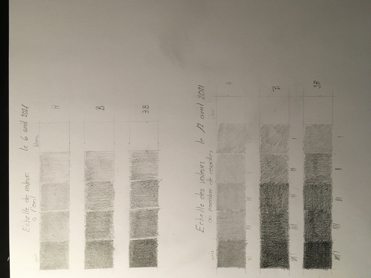 Sur cette feuille, pour la première échelle, entre la case du 2H et du 0 la transition est un peu brutale, il faudrait un entre 2. Pas toujours obligé de changer de crayon entre 2 valeurs, avec un B ou 2B on peut déjà faire de nombreuses valeurs différentes. Mais ça reste un bon test pour voir quelle sensation donne chaque type de crayon.