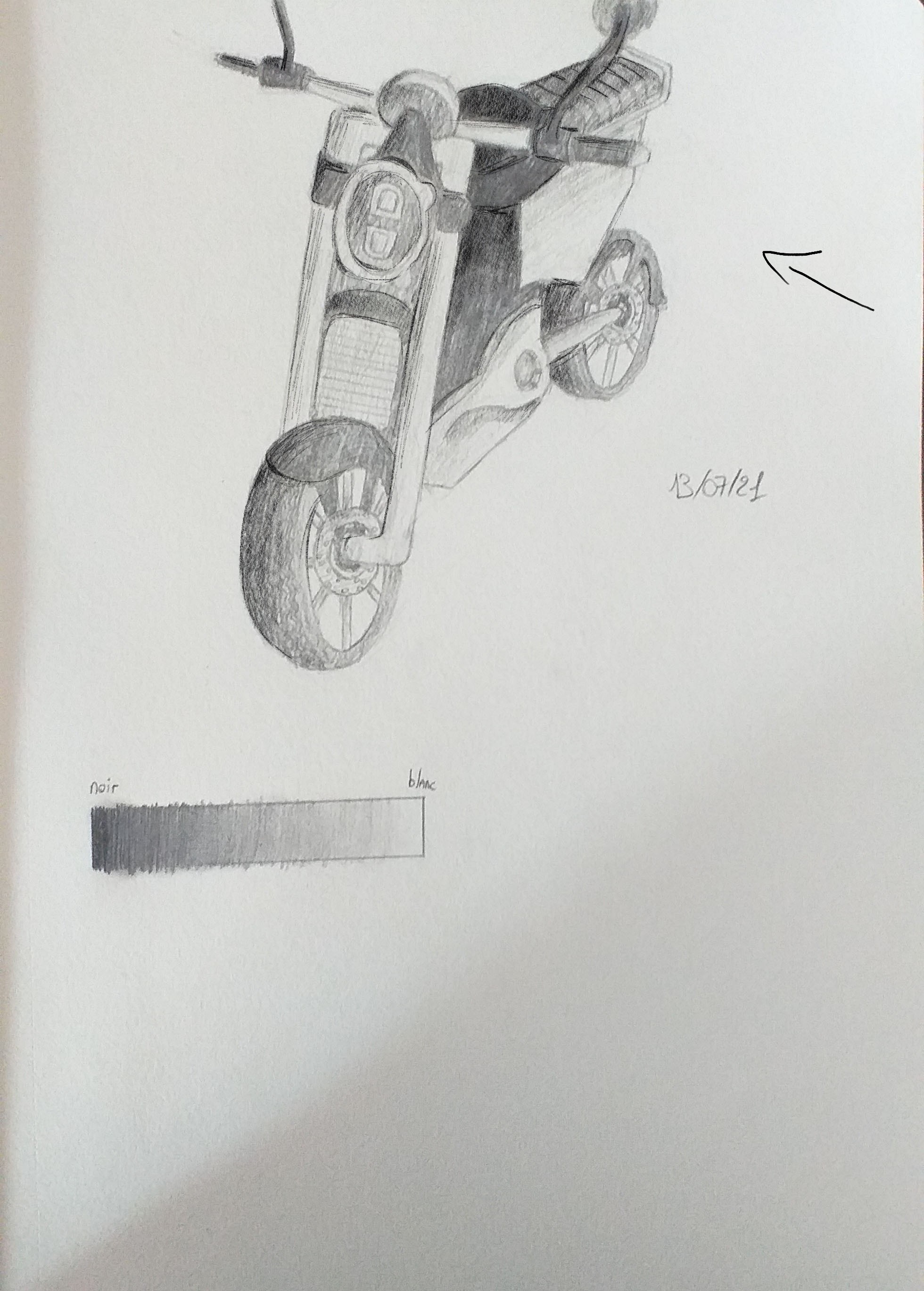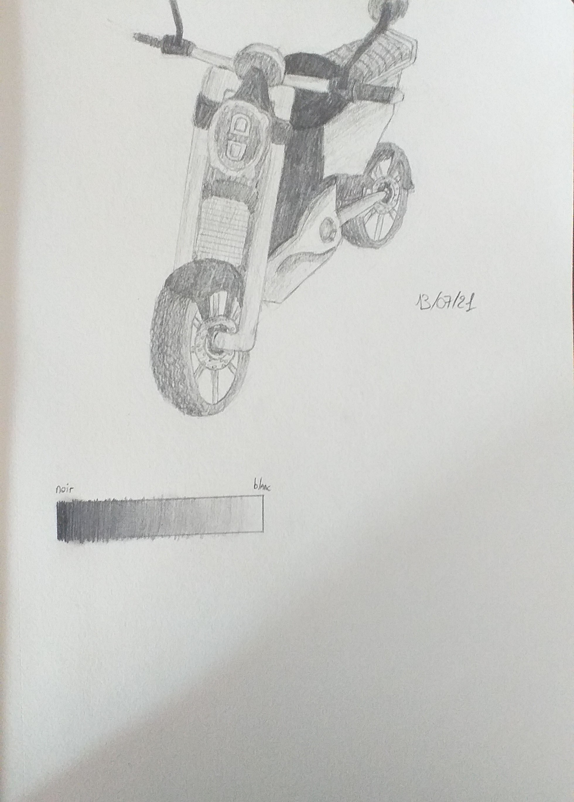 Bonjour, pour ce cours j'ai essayé de dessiner une moto, voilà le résultat avec l'échelle de valeurs établie 🙂