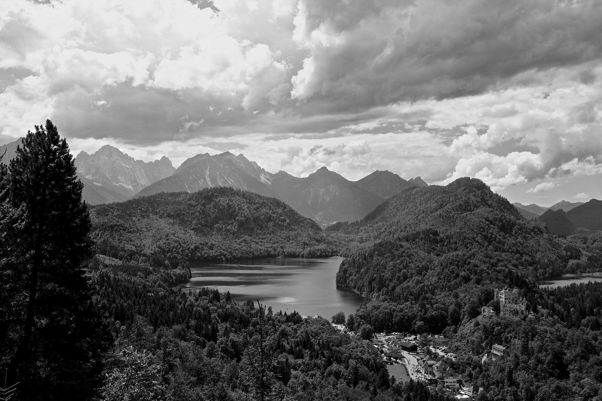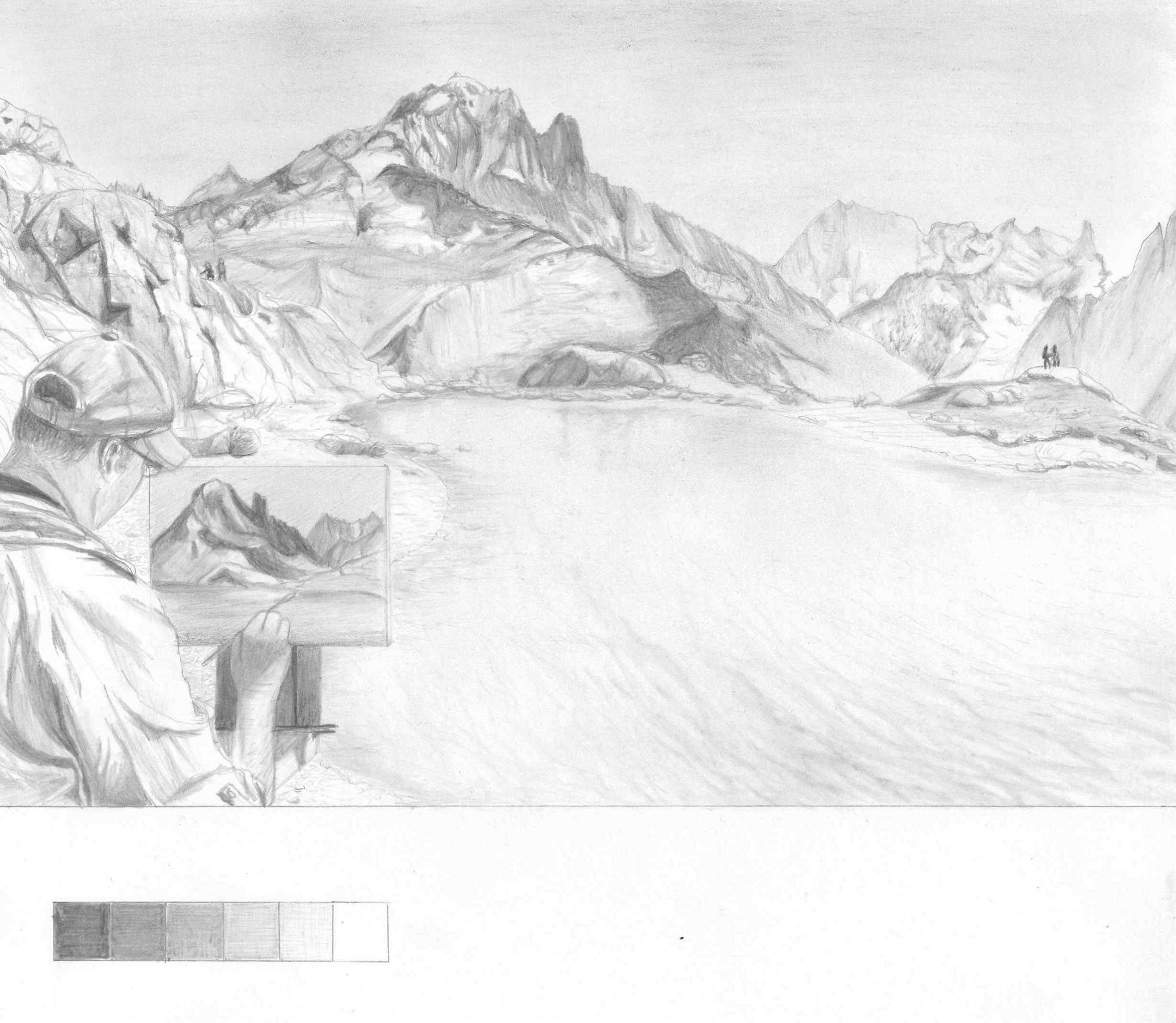 C’est un beau dessin ! Il y a de bons contrastes qui respectent bien l’échelle de valeurs réalisée 🙂 Le point d’amélioration serait au niveau de la différenciation des plans. Ici que les éléments soient proches ou éloignés ils ont des contrastes et valeurs assez similaires. Avoir le personnage un peu plus foncé et contrasté et progressivement attenuer tout ça jusqu’au fond rendrait mieux. Je remarque tout de même que ça a été un peu fait avec la petite montagne en haut à droite qui vu qu’elle est au fond est un peu plus claire. Je joins une photo d’un paysages du même style mise en noir et blanc où les plans sont bien différenciés. Bon travail en tous cas :)