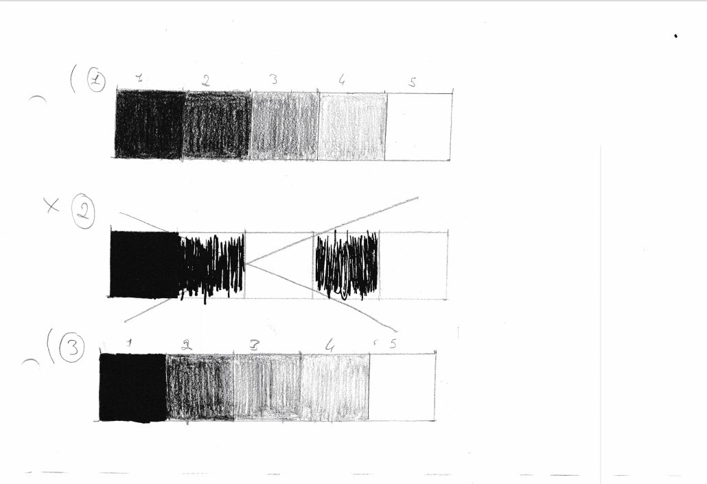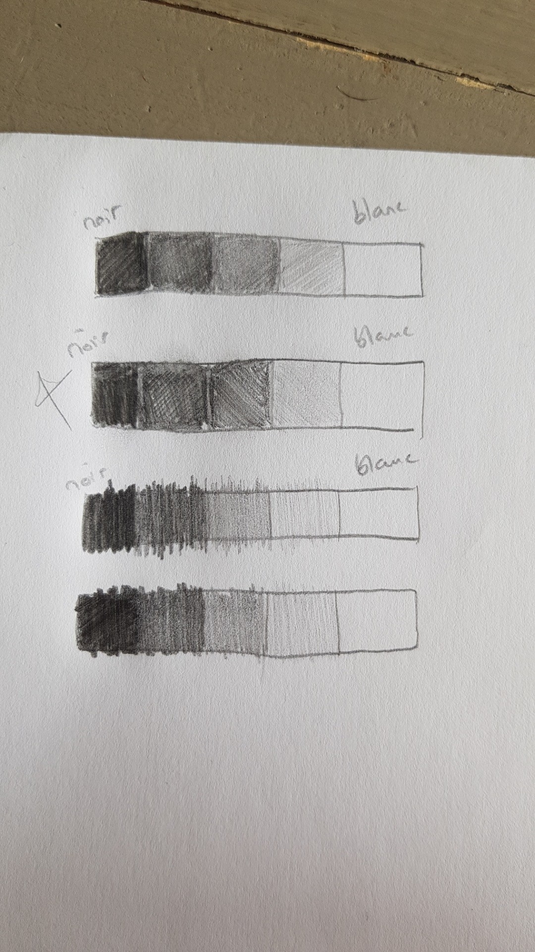 Quand on travaille avec du noir pur comme pour la deuxième ligne barrée les valeurs différentes peuvent être faites avec des hachures plus ou moins serrées ^^