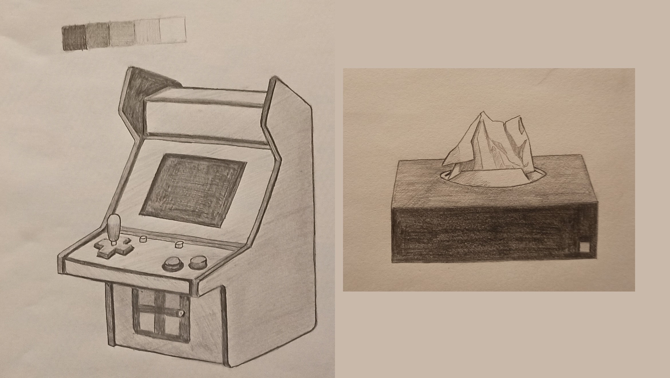 Great job, it's a success 😉 I have nothing to say about the tissue box. As for the arcade machine, the contrast is just right, but it's hard to determine a light direction. Normally, depending on the direction of the light, some faces can be darker or lighter, so for the white faces for example, we should see slight differences in values. In any case, the principle of values is well understood :)