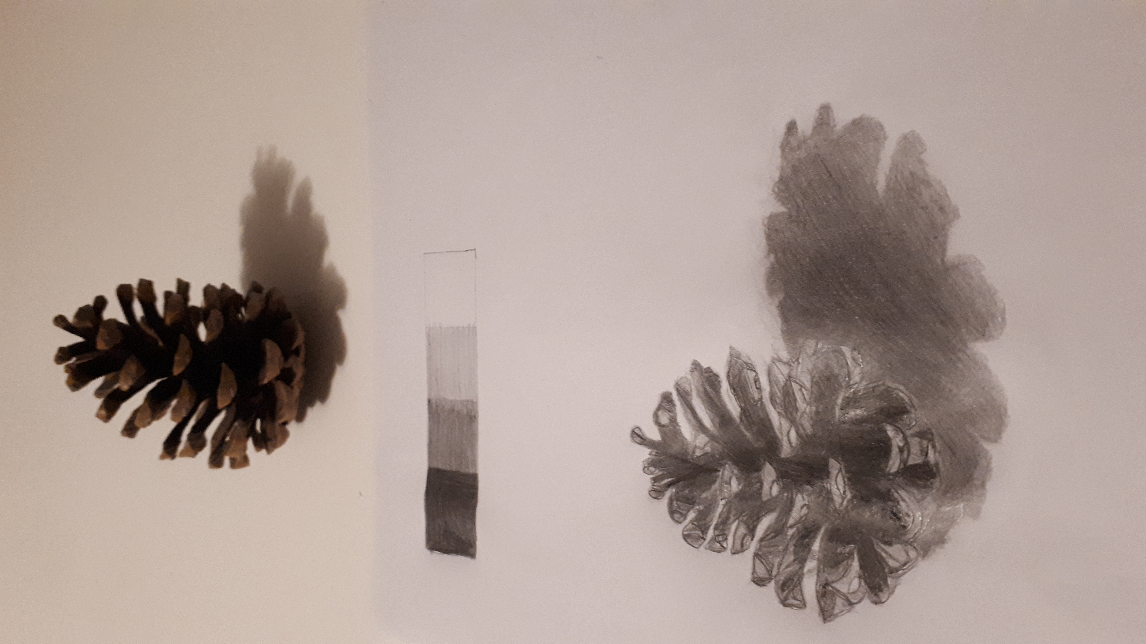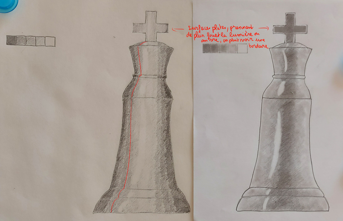 Joli travail :) Les valeurs sont bien réalisées :) Il est possible de préciser les bords des zones plus claires en soignant bien le coloriage vers les bords et en s'aidant d'une gomme mie de pain pour repréciser les zones claires. Attention aussi à ne pas passer la main dessus. Pour forcer le sombre, un crayon plus gras comme un 2B serait peut-être plus adapté. Bon travail en tous cas :)