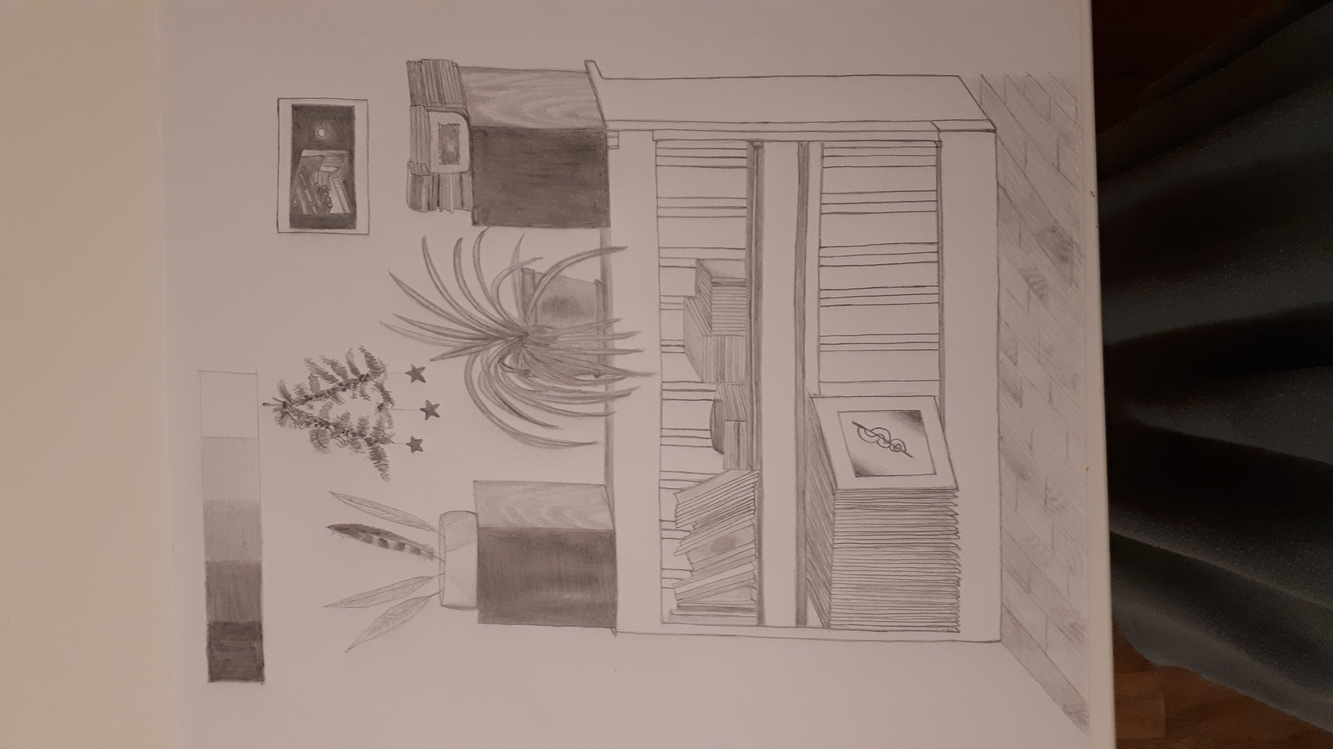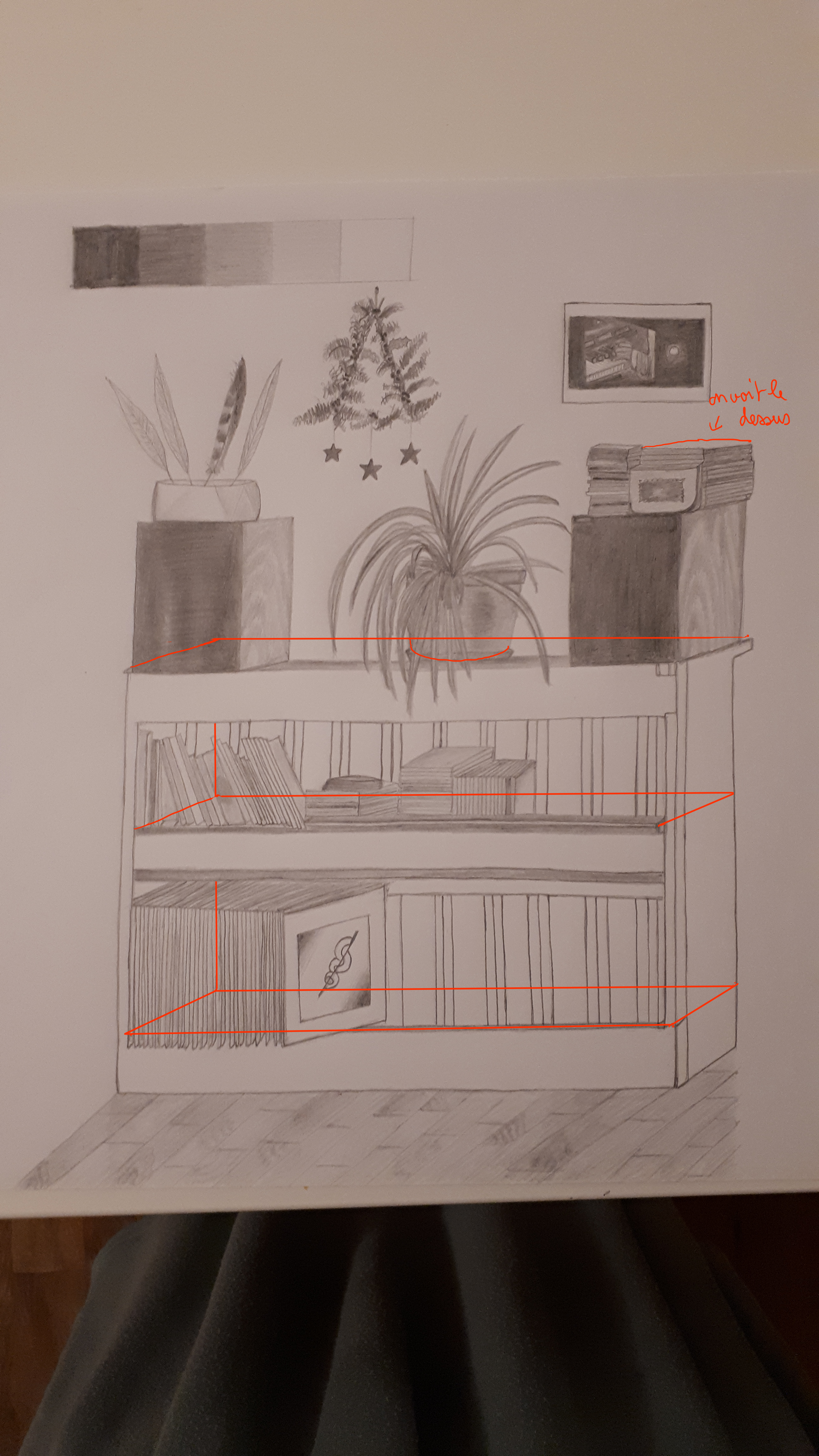 Merci encore pour la correction super ! Les 2 boîtes sur le meuble sont des enceintes donc les faces sont foncées oui j'ai fait le dessin le soir tard de nuit j'ai eu du mal à penser aux ombres à la lumière j'y ai pensé quand j'avais terminé dommage :) Oui en effet il va falloir que je me concentre sur la lumière, ombres et la perspective ! A bientôt