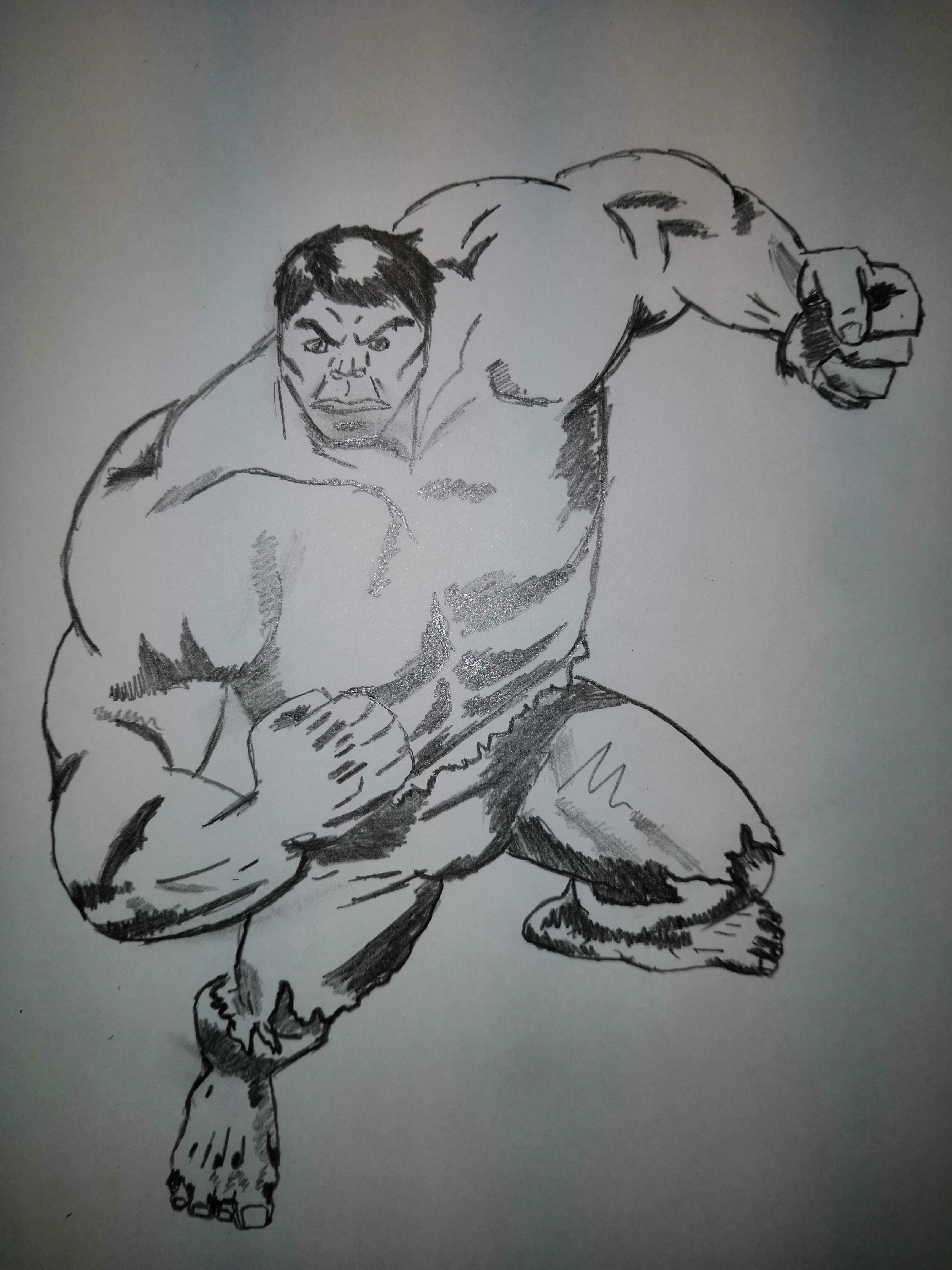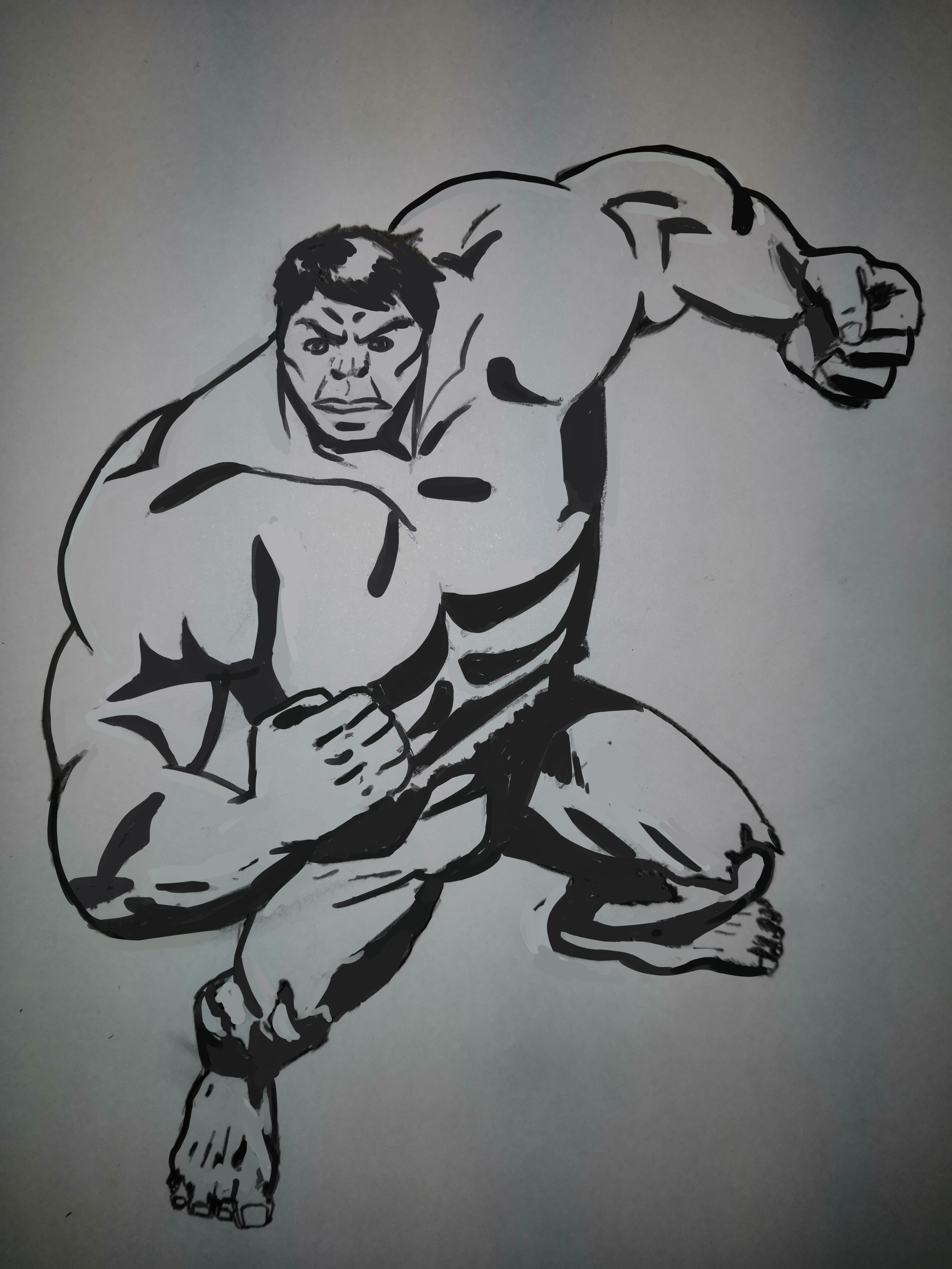 Nicely done on that Hulk :) Given the strong contrast, I think the marked comic-style shading is an intentional choice ^^ It looks rather good! But in that case, I think distinctly defined shadow areas would look better, since there's no gradient (I tried to show that). The edges of these shadows are a bit messy, in wavy lines due to the coloring. As for the lines, be careful not to break them up into many small strokes, something like what you did for the thigh bent on our right might work better. Sharpness requires a bit of practice, it will come :)
