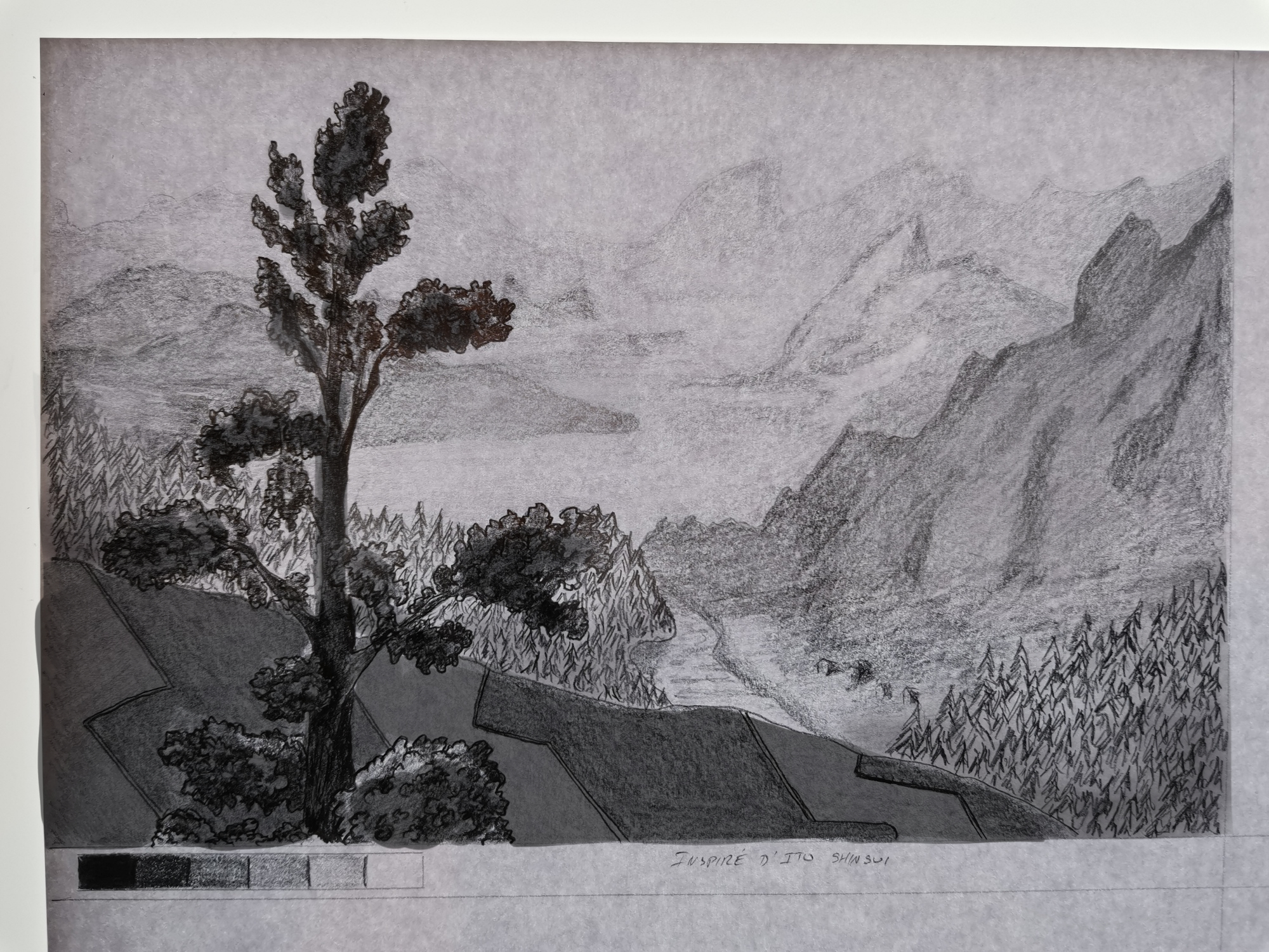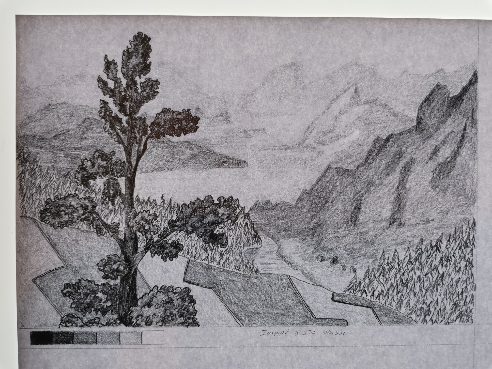 Regarding the landscape, it's very neat! You can see that you took care of the atmospheric perspective. However, the contrast does not progress evenly, with a foreground not dark enough, some mountains a bit too dark while being as distant as the ones beside. I've corrected this in the drawing. In any case, it's well contrasted and elegant, well done!