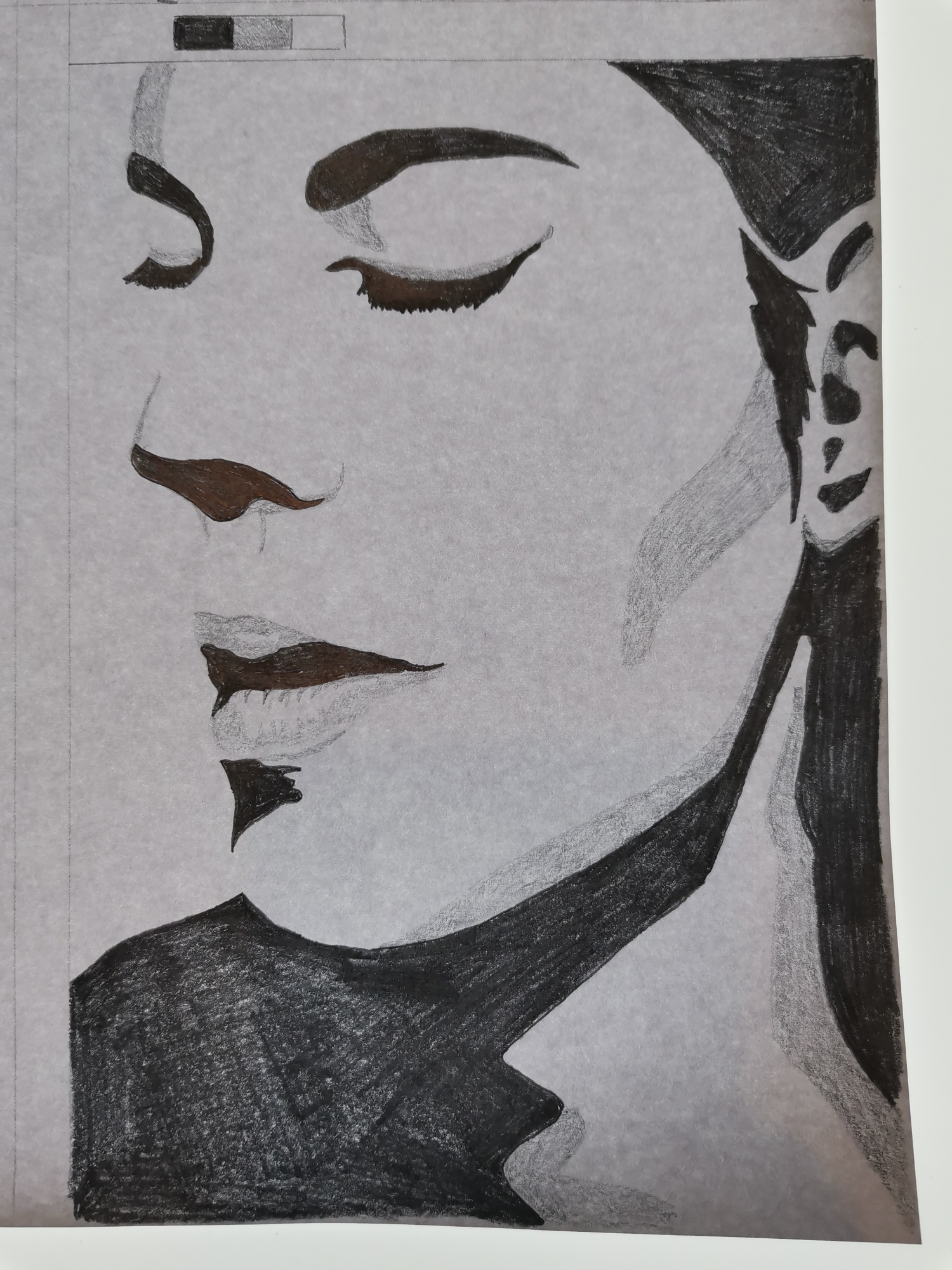 Joli travail ! Pour le portrait avec des zones nettes, c'est bien ! Pour un rendu plus net, peut être mieux marquer les bords des zones grises. Au niveau du nez il y a beaucoup de blanc et on n'en détermine plus trop la forme. Avec la photo d'origine je pourrais peut être aider à mieux déterminer les différentes zones. Bien joué en tous cas !