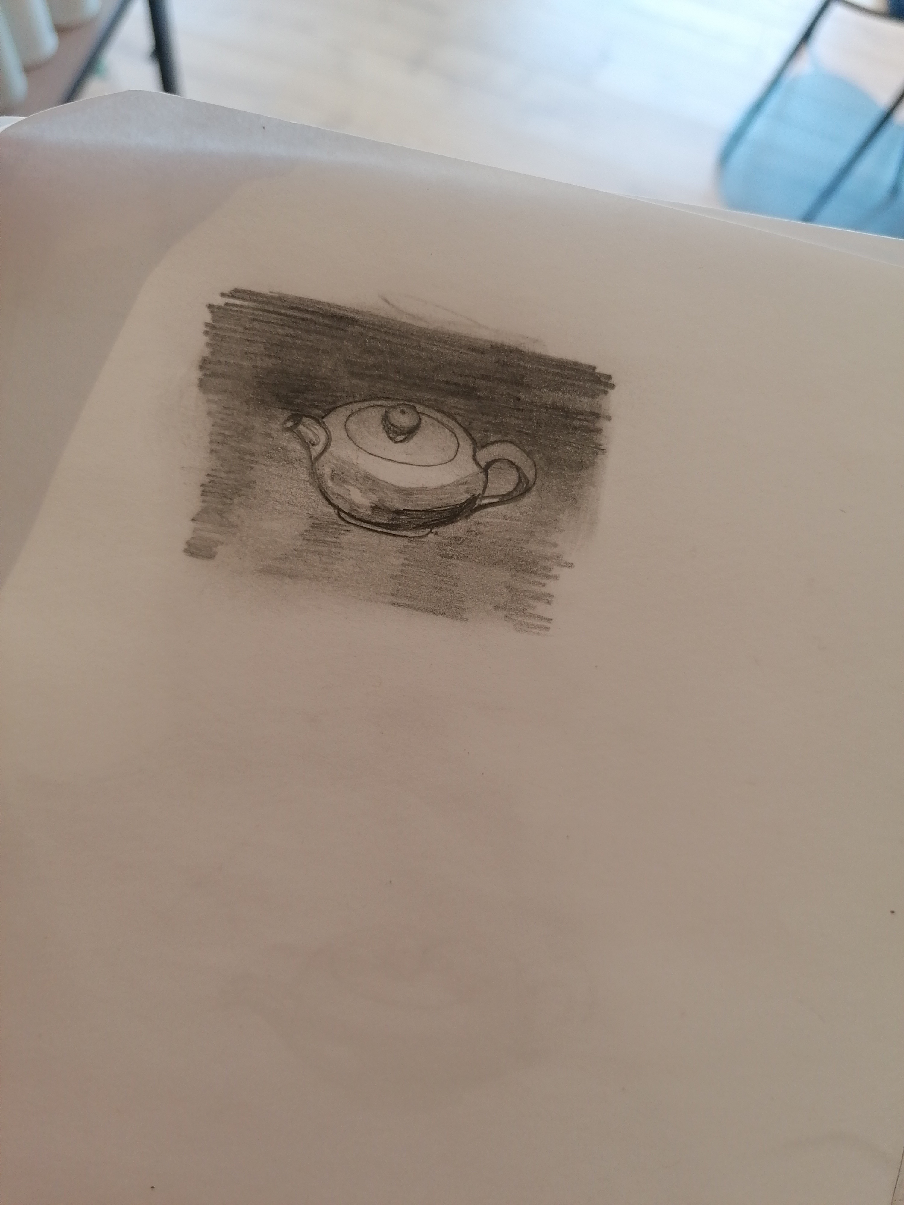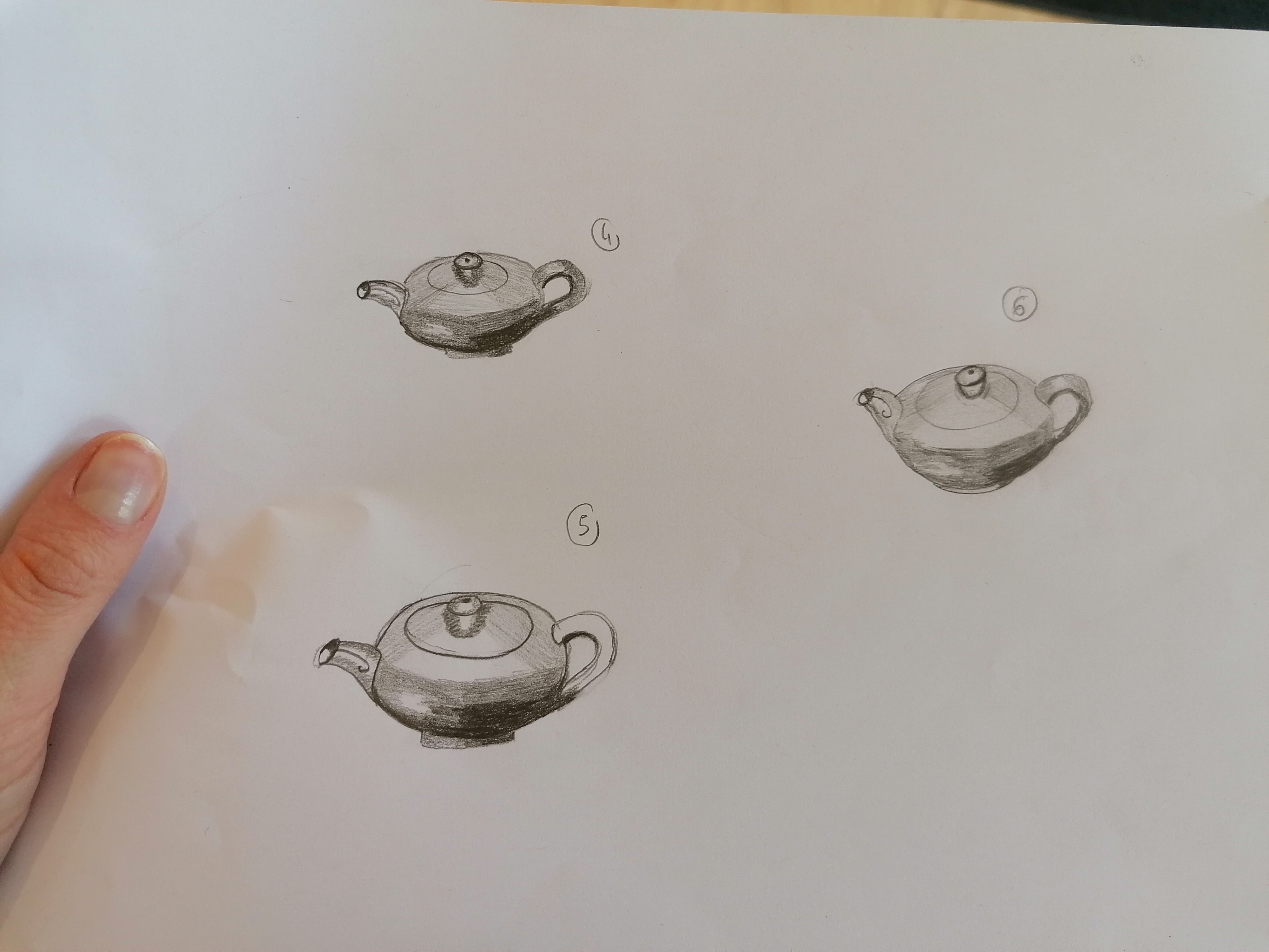 Bonjour, je me suis exercée sur la photo de la théière qui a été donnée en exemple à une autre élève dans cette discussion. J'ai eu du mal la dessiner et également à avoir un rendu net. La. Démarcation entre les différents niveaux de valeurs est dure à réaliser. Il me semble que les dessins 3,4 et 5 sont sûrement les mieux.. Je les ai numérotés pour faciliter la correction 😉 Merci d'avance pour la correction et si vous avez d'autres exemples de photos /objets à me donner pour que je m'entraîne ce serait super !