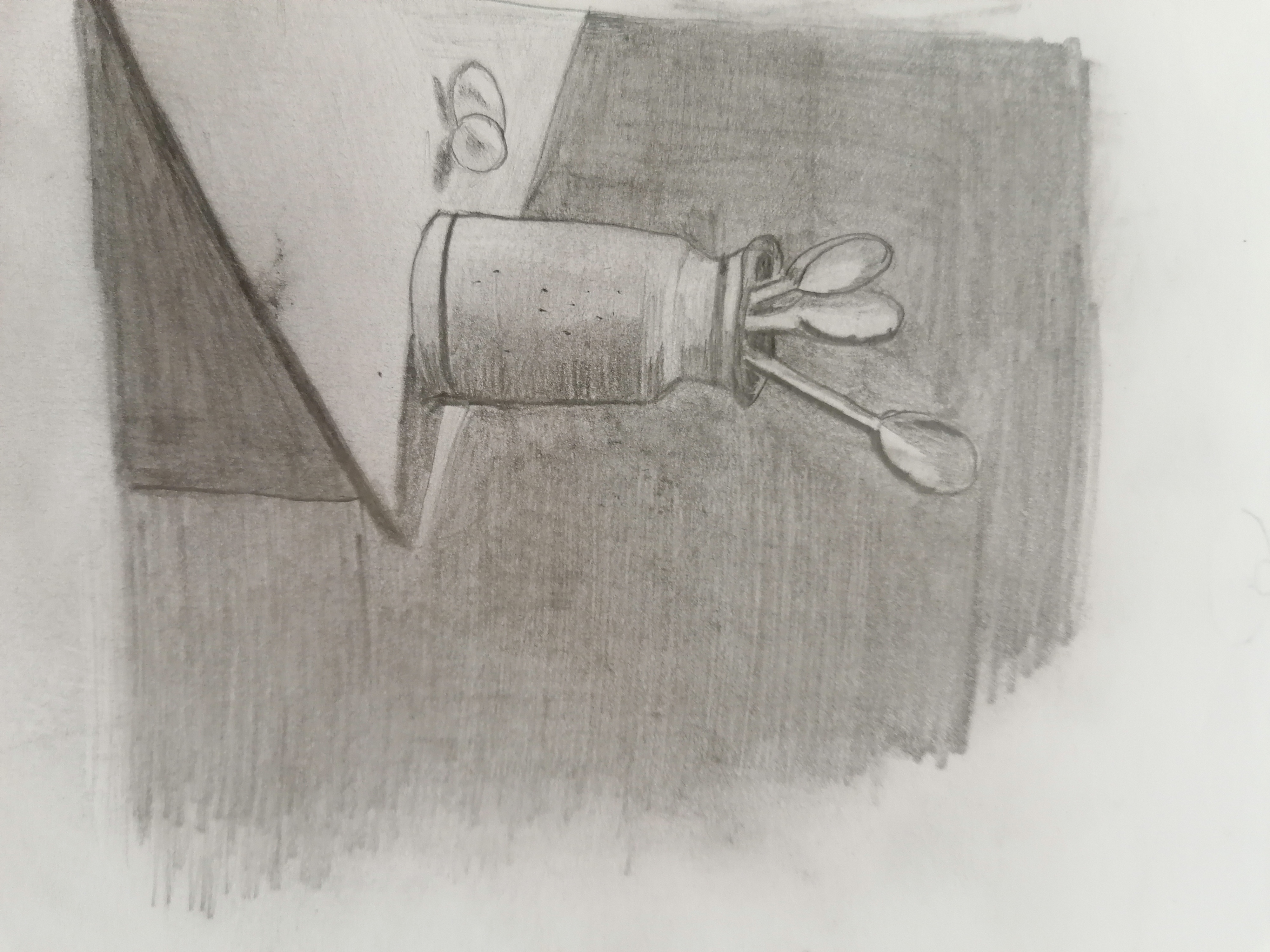 Côté critique, et pour comparer avec le modèle, je dirai que tu pouvais encore assombrir la table. Et aussi placer une ombre intermédiaire bien étalée et estompée sur le pot pour que le contraste ne soit pas aussi tranché. Mais c'est vraiment en faisant la comparaison avec la référence, parce que le sinon ton dessin en tant que tel se suffit déjà amplement à lui-même!