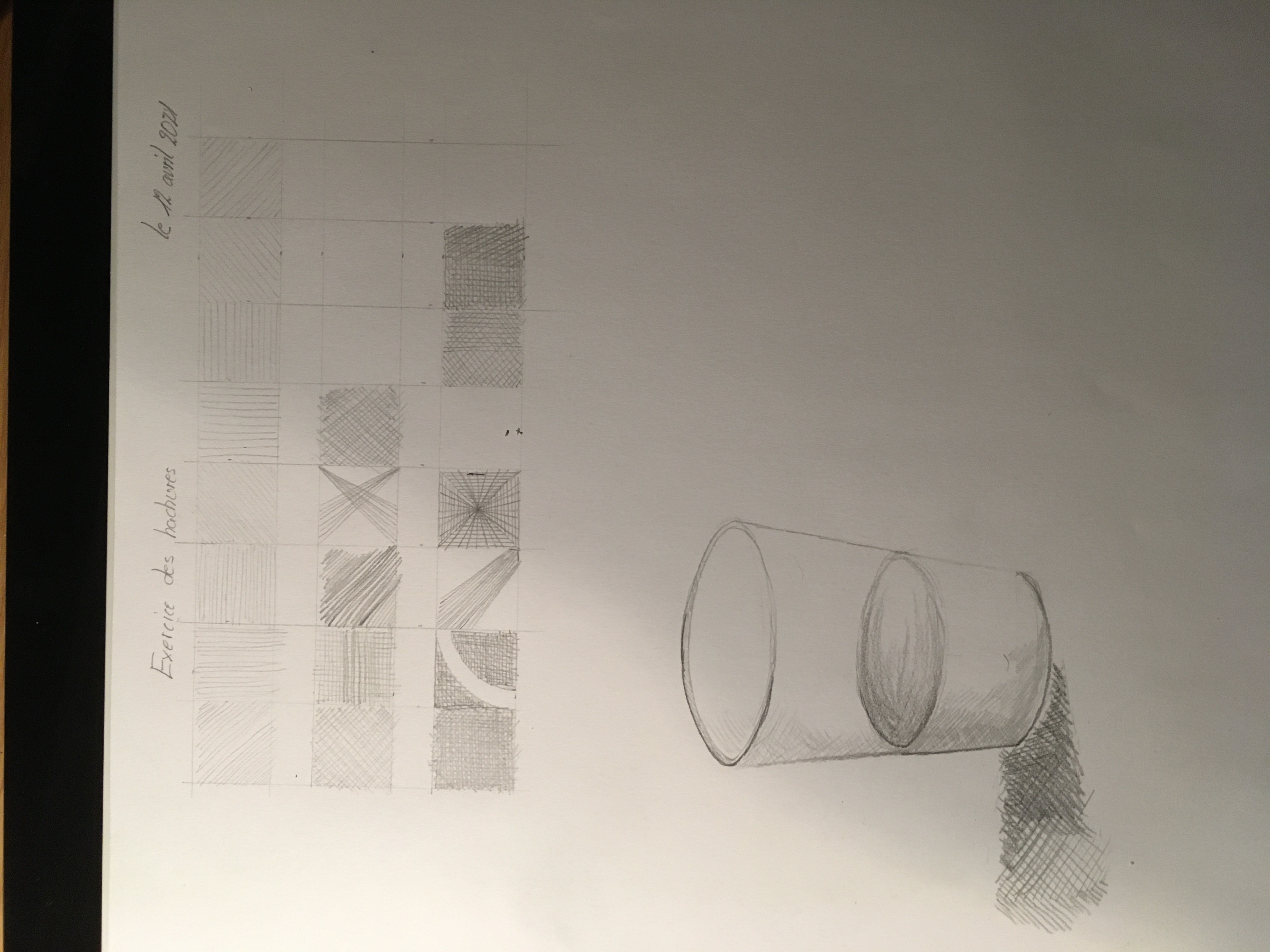 Bonjour, voilà mon tout premier essai de dessin avec des hachures. L'exercice a été assez difficile. On reconnait bien l'objet, mais je ne suis pas certaine de la justesse de tous mes traits. Peut être que les zones d'ombres sont délimitées de manière trop nette. J'ai hâte de connaître votre avis !
