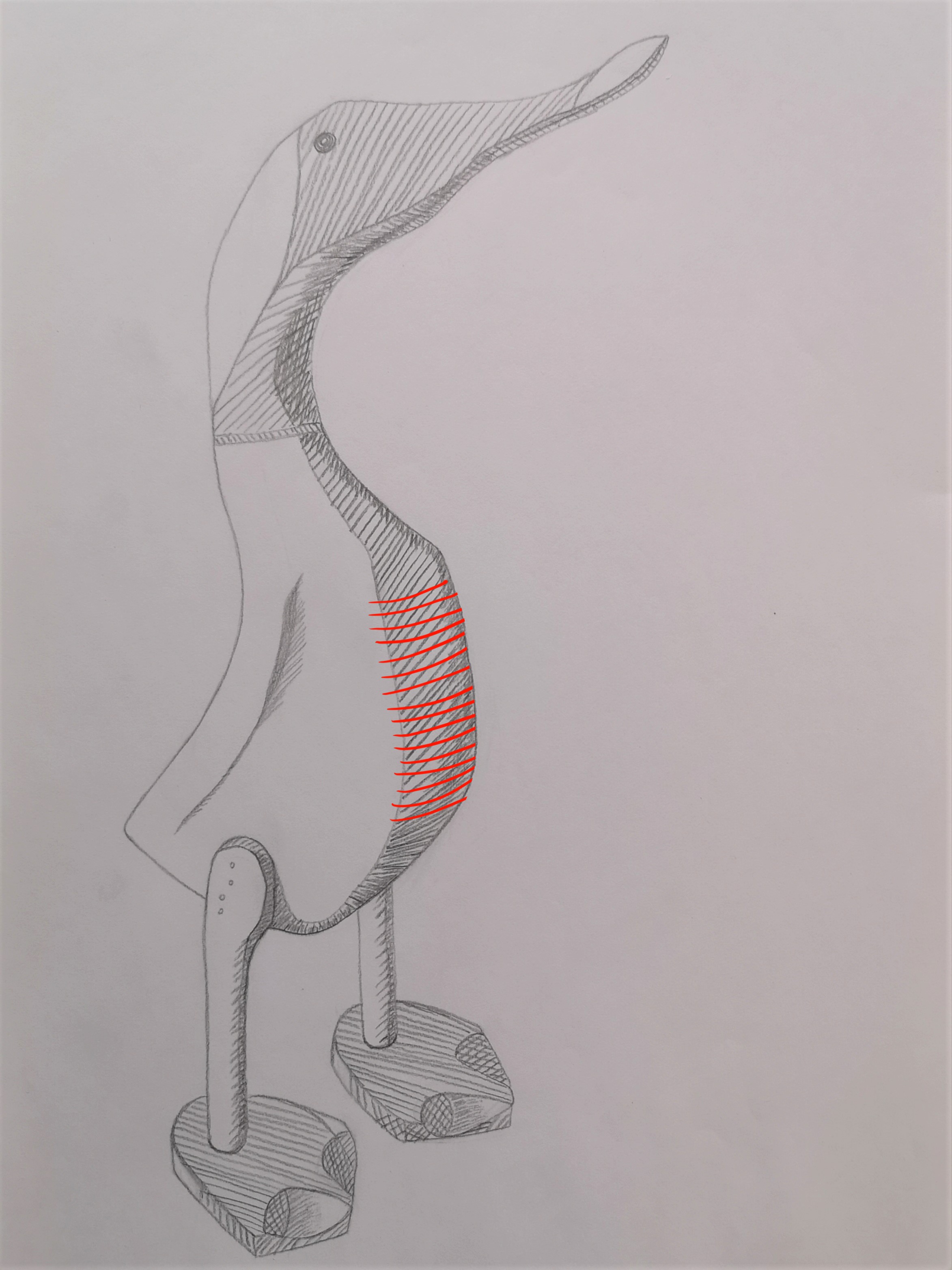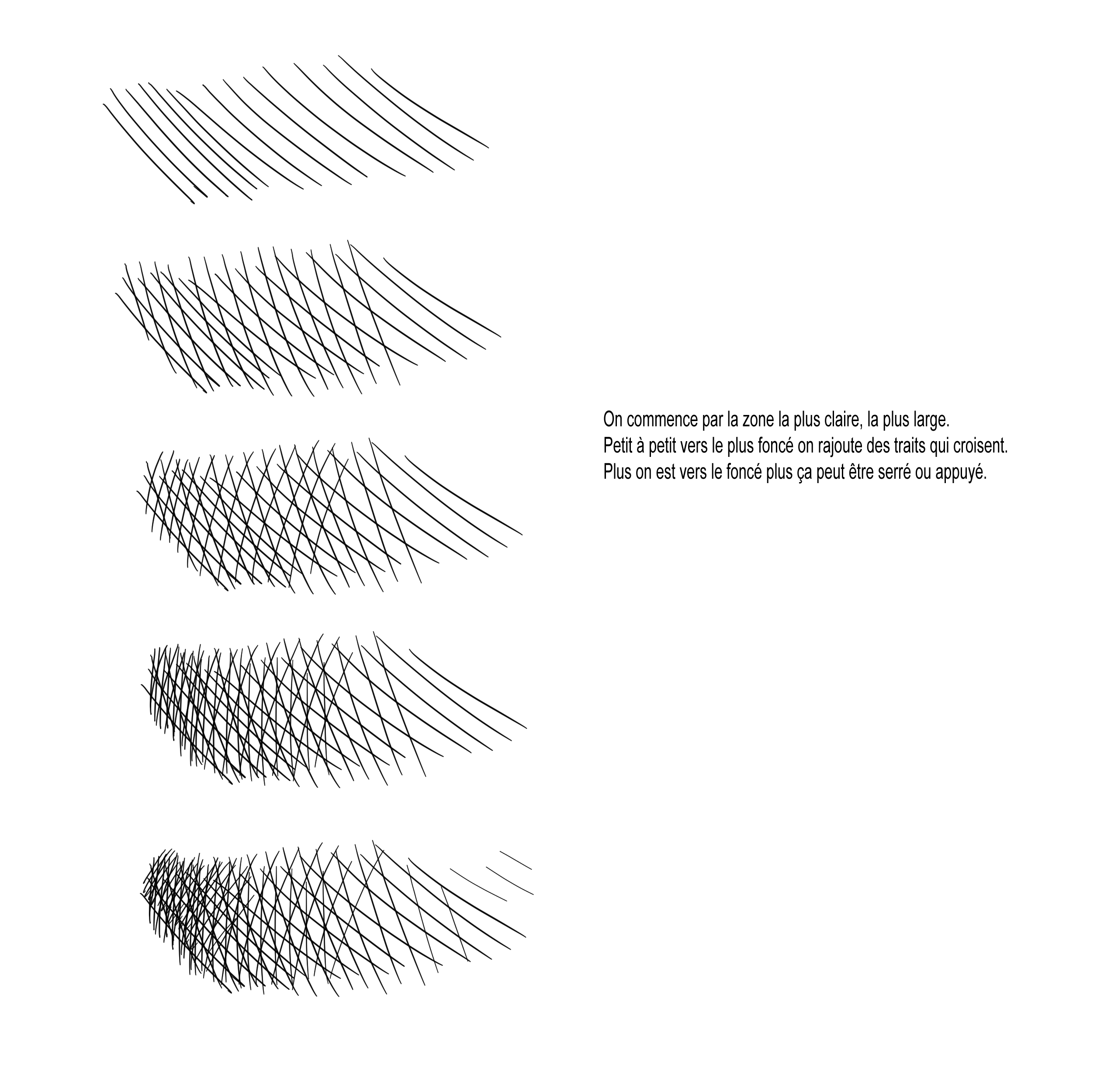 Joli travail :) Effectivement les zones sont très nettes, ça peut être un style. Mais si on veut un style montrant plus les volumes c'est mieux de faire des dégradés en jouant sur les croisements et en appuyant plus ou moins fort. Attention à bien suivre les volumes de l'objet aussi pour les hachures principales (celle qui vont le plus loin). Je montre un bout d'exemple de sens en modèle. Je laisse un petit tuto pour faire des dégradés de hachures ^^