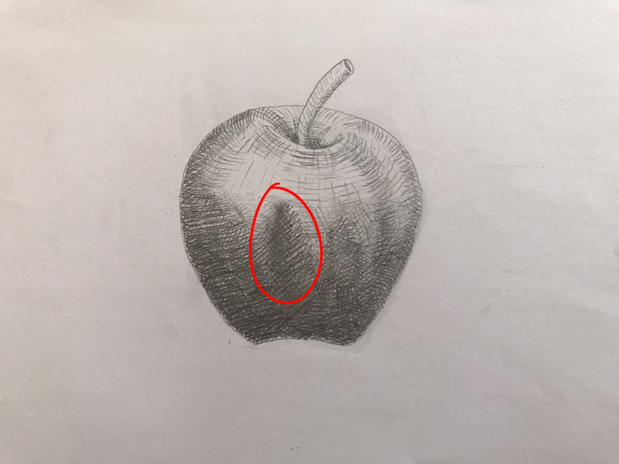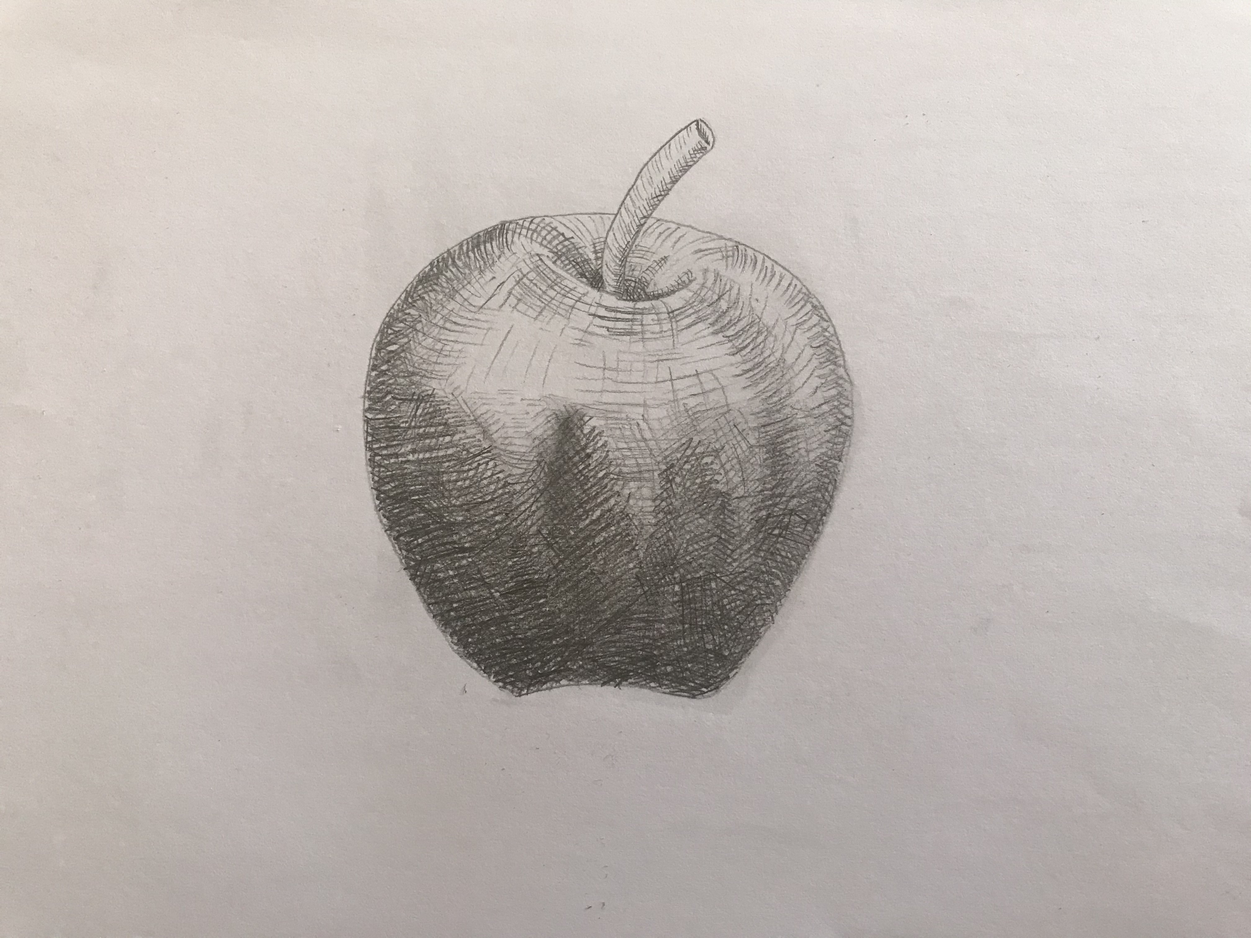Nice work, the cross-hatching and shading are well done. What I notice is that there’s a very dark area near the brightly lit apple zone. I assume it's a stain, but it’s so dark that it looks like a hole. The challenge is to combine the values related to the colors of the objects and those caused by the light. There, a dark stain cannot be as dark as those on the sides given its placement in the light. It indeed needs to be darker than the reflection on the apple, but it should be a bit lighter. Anyway, the drawing is well executed :)
