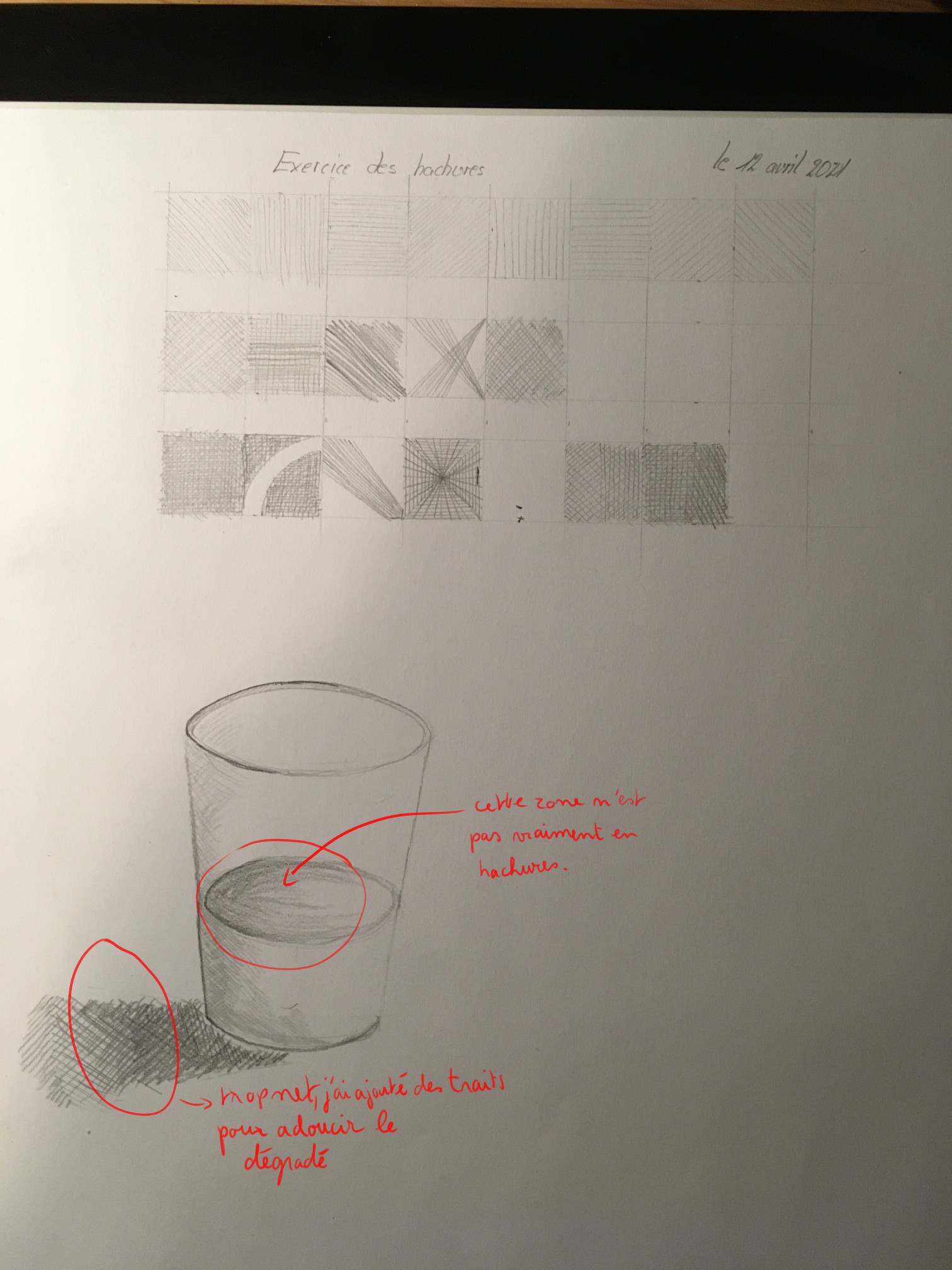 Le principe des hachures et bien compris :) Le verre fonctionne bien, il y a plutôt de bons dégradés de hachures, j'ai juste annoté quelques zones à corriger. Bon travail !