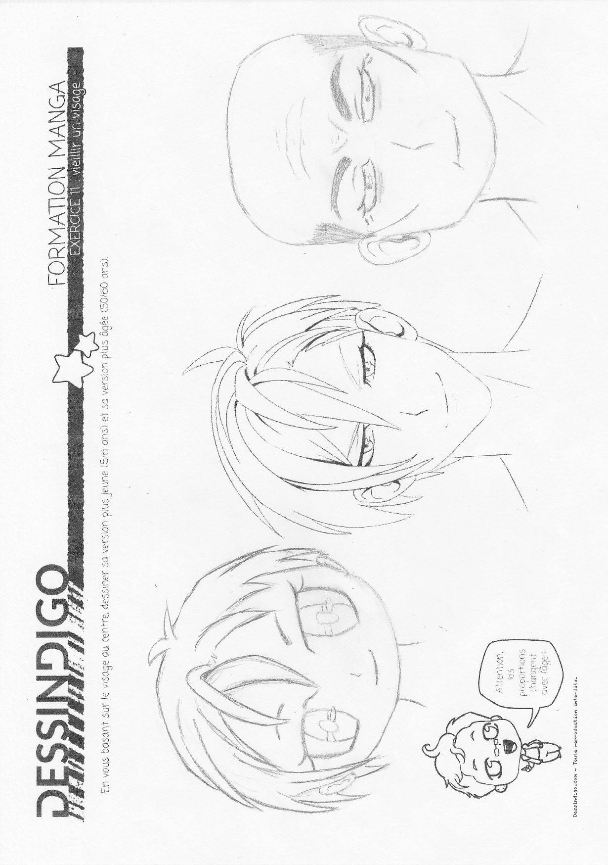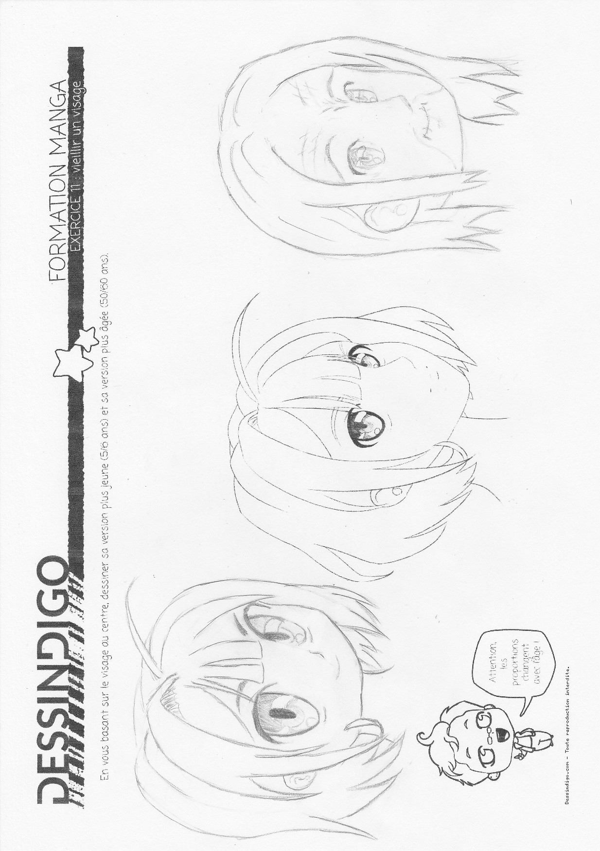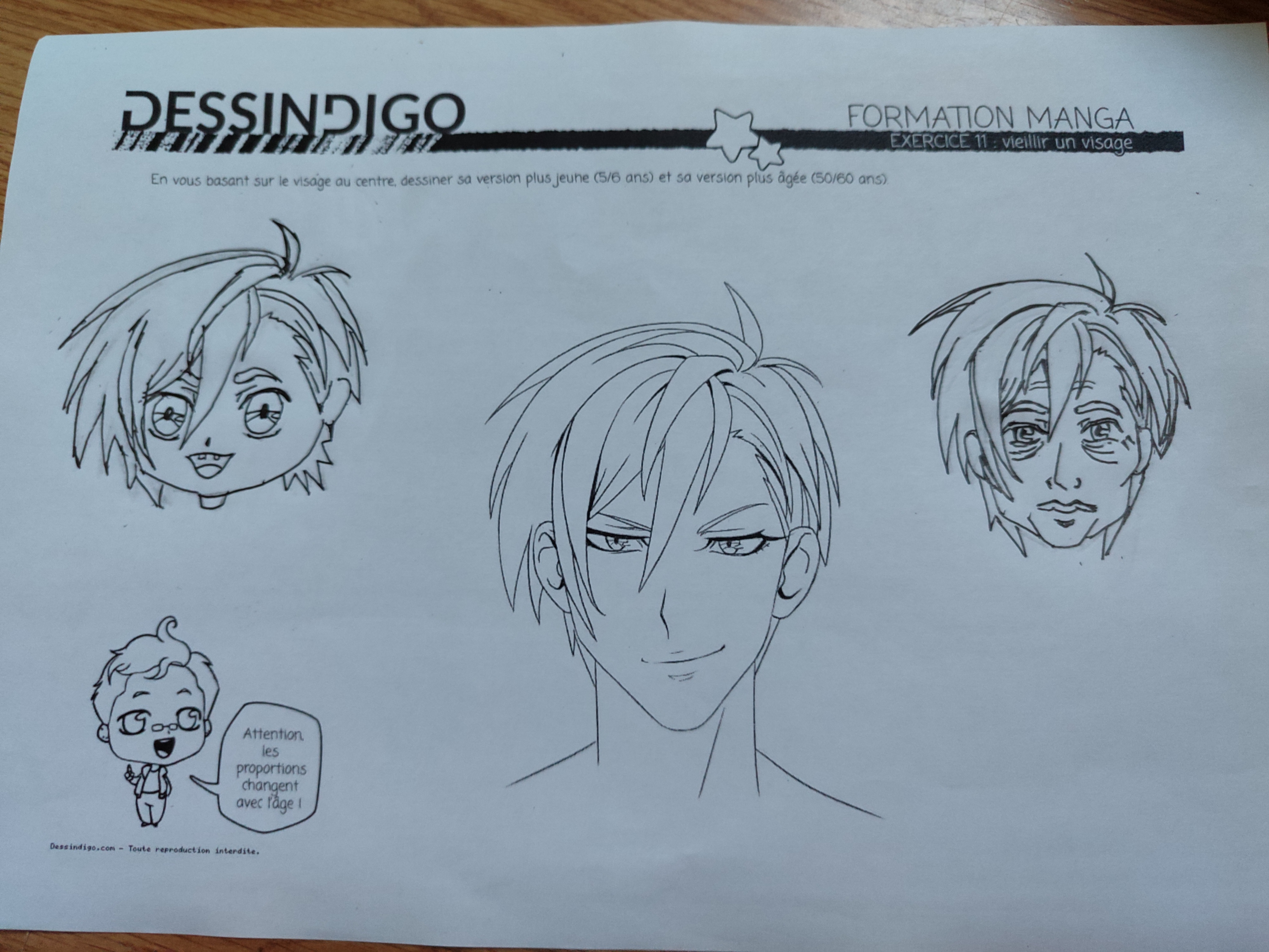 Pour la version âgée, je pense que le défaut principal vient de la taille des yeux: tu peux clairement les faire plus petits! Plus les yeux sont grands, plus l'easpect jeune et mignon sera accentué! Côté cheveux, puisque tu semble gênée avec le résultat, je dirai qu'il y a une perte de volume. Retrace la courbe du crâne comme repère au besoin. Après la coupe et l'allure des cheveux changent aussi avec l'âge... À toi de voir comment tu t'appropries le vieillissement du personnage!