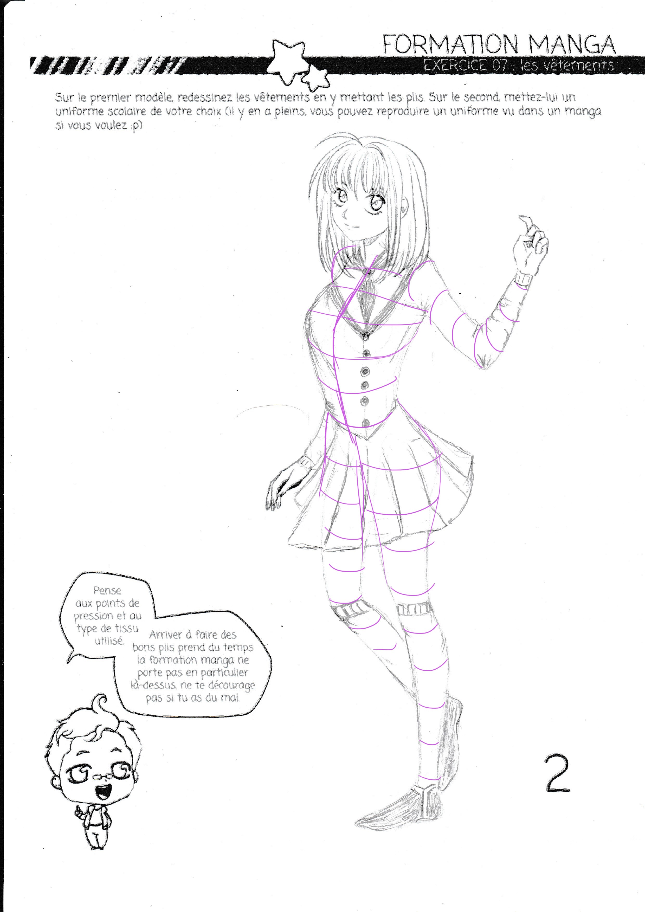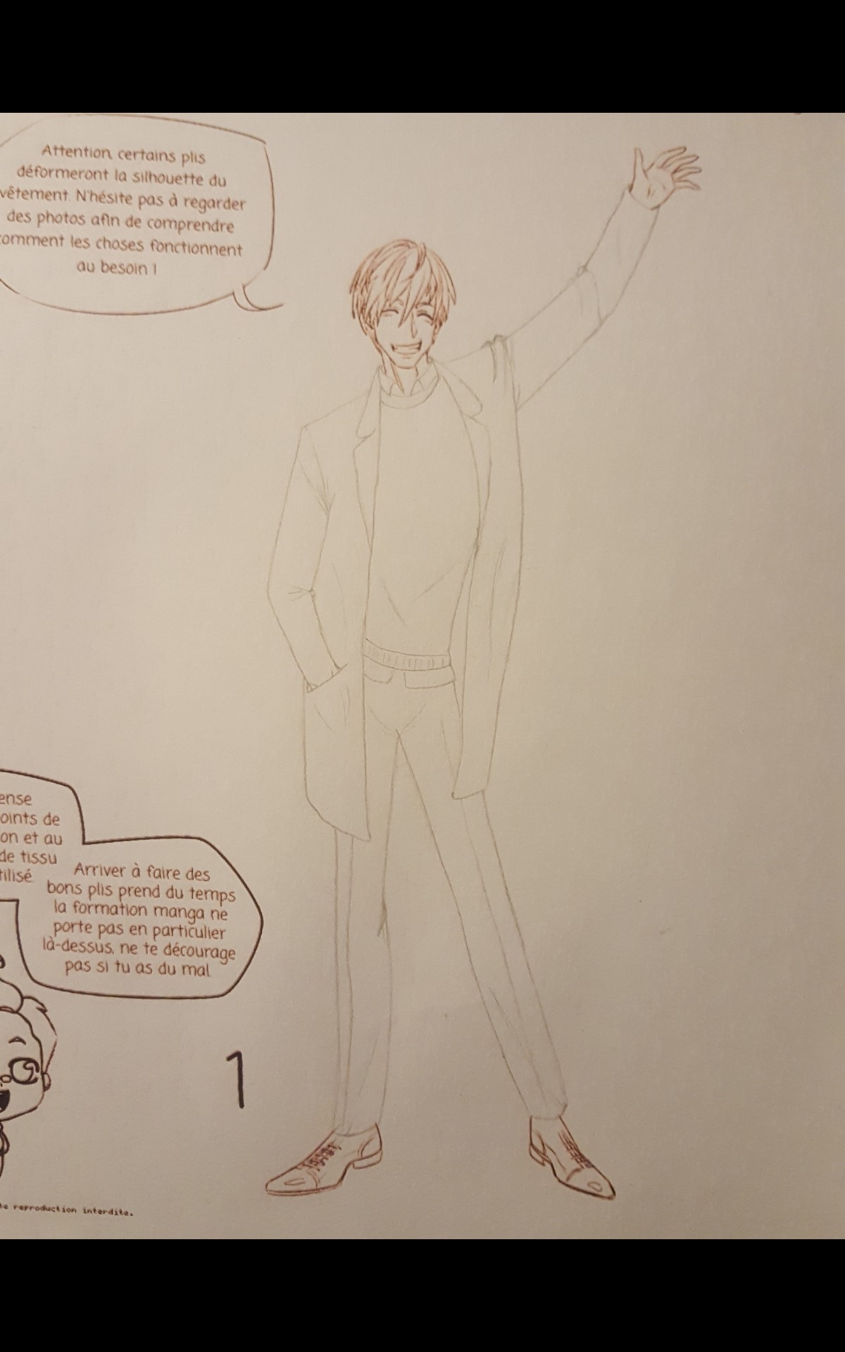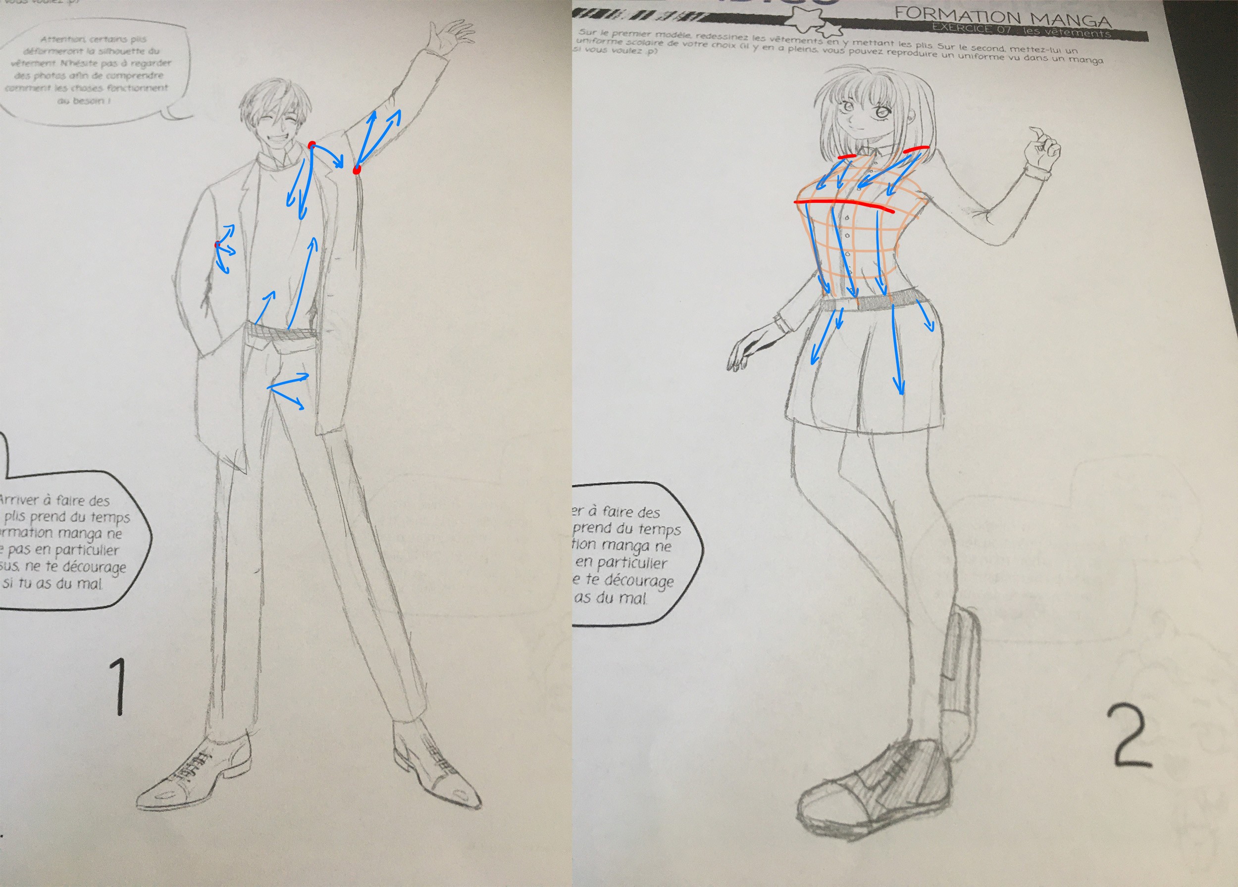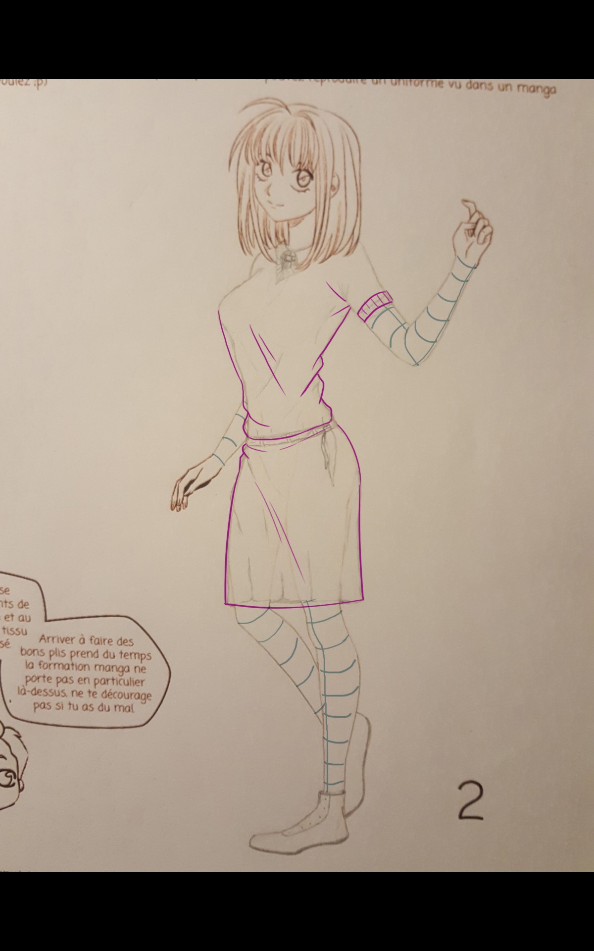 Voici ce que ça donne pour les vêtements. Honnêtement, j'ai tendance à dessiner les plis au "feeling". Je ne sais jamais comment placer les lignes de plis (à la verticale ou à l'horizontale ou autre). Mais je comprends qu'avec la pratique, ça va venir 😉