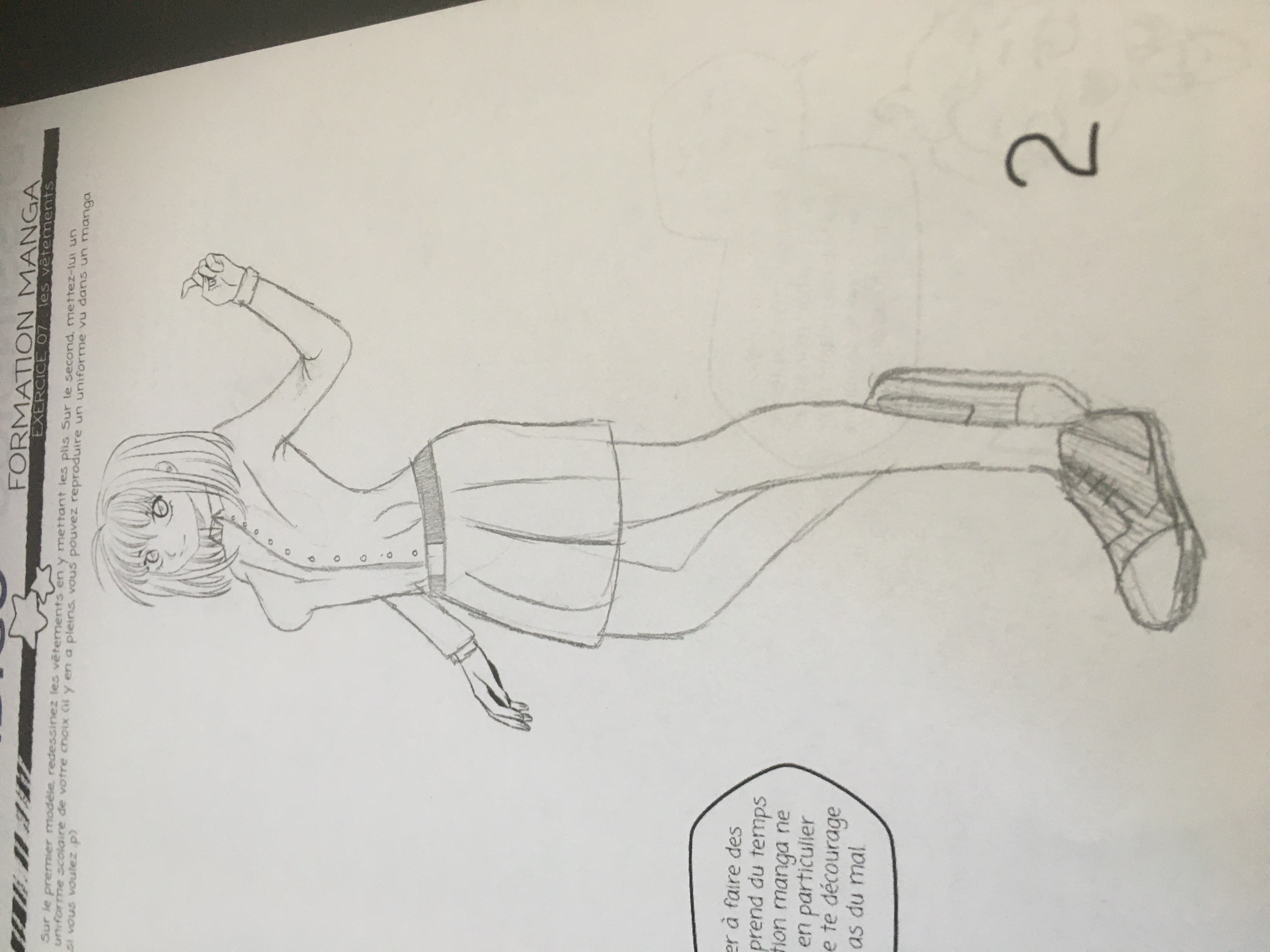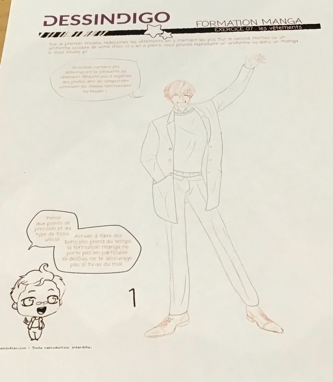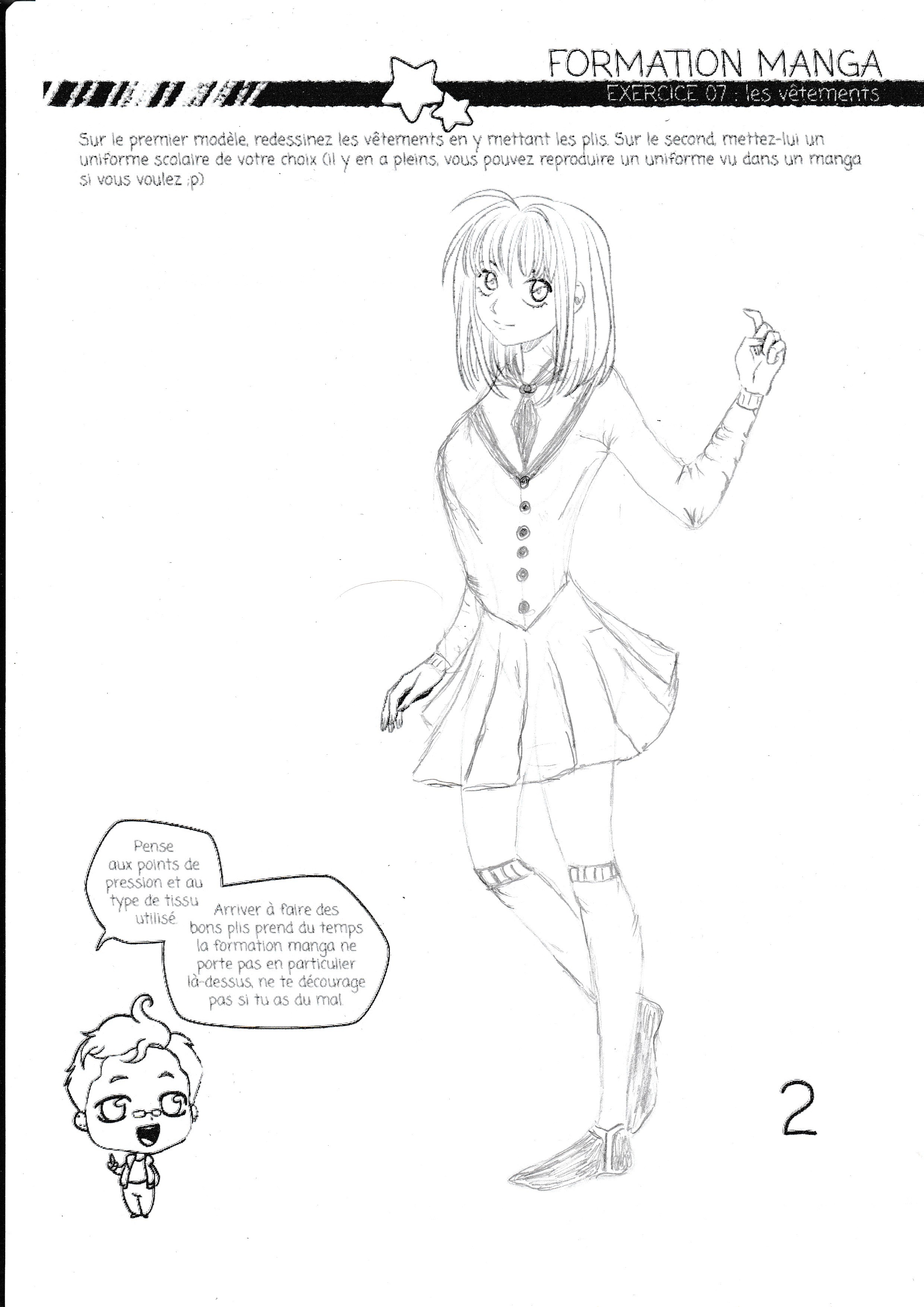 Voici ce que ça donne pour les vêtements. Honnêtement, j'ai tendance à dessiner les plis au "feeling". Je ne sais jamais comment placer les lignes de plis (à la verticale ou à l'horizontale ou autre). Mais je comprends qu'avec la pratique, ça va venir 😉