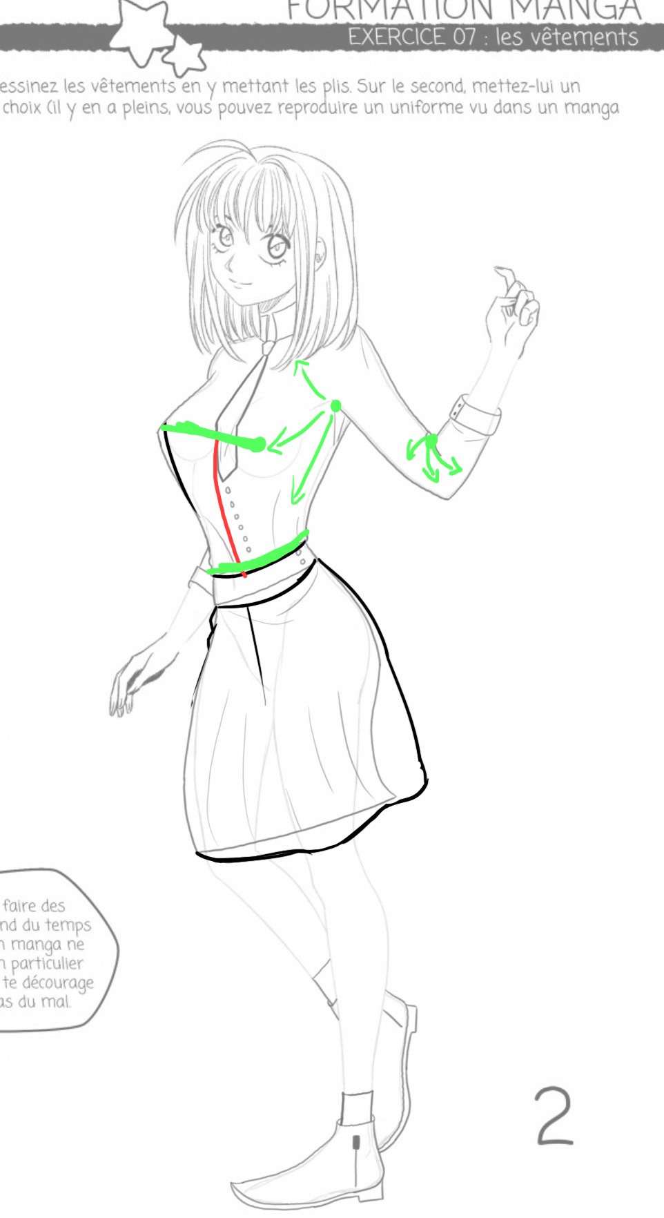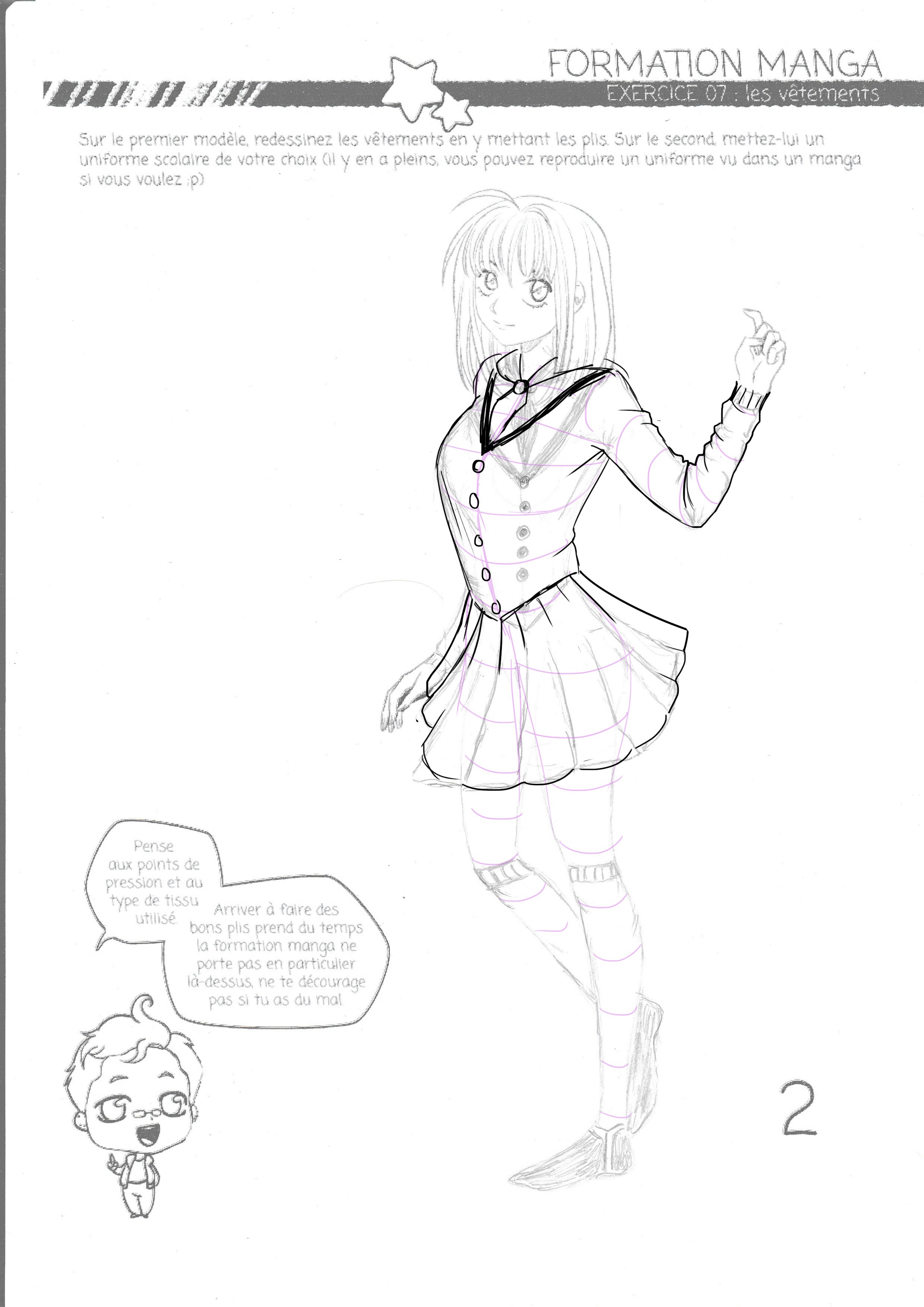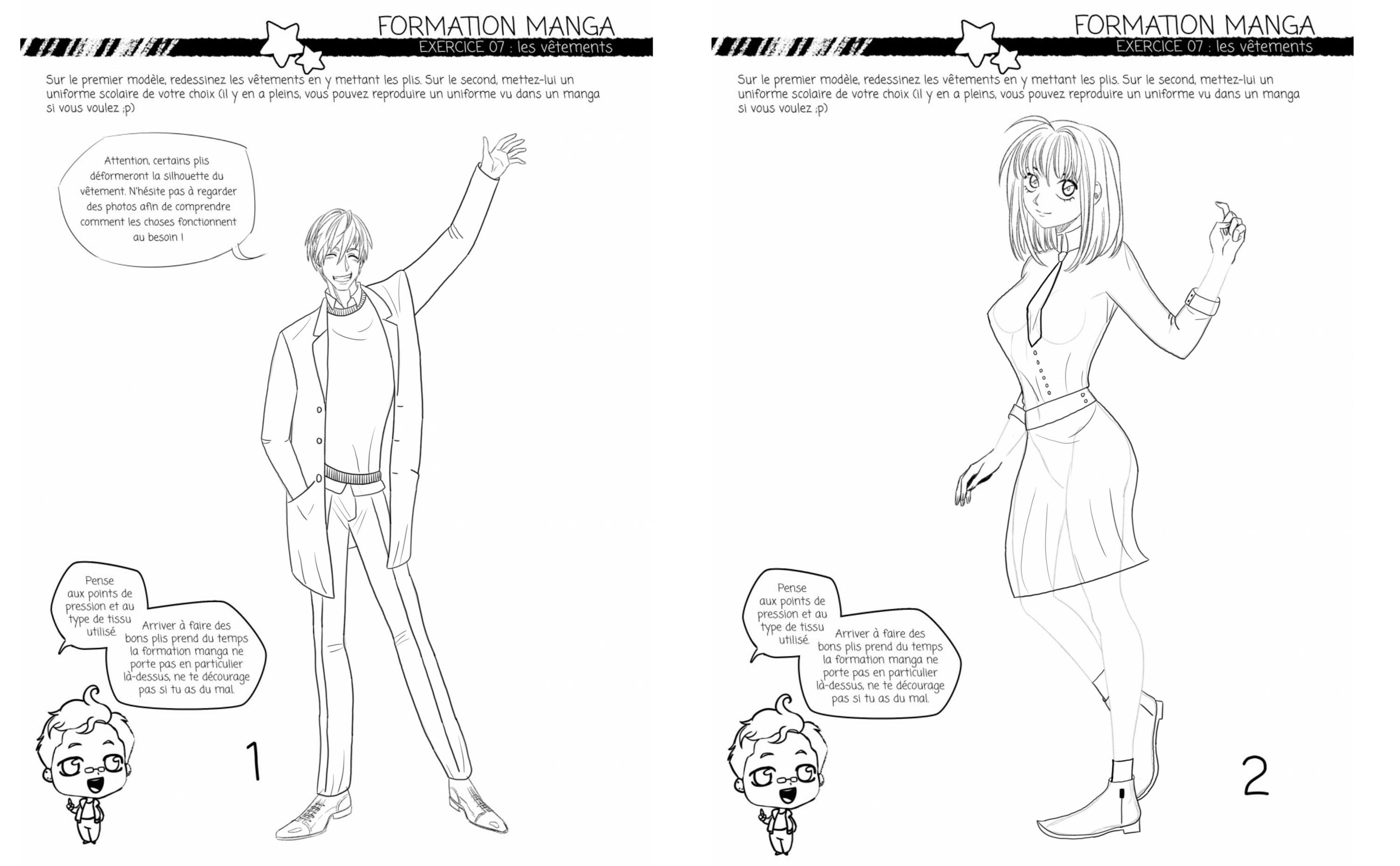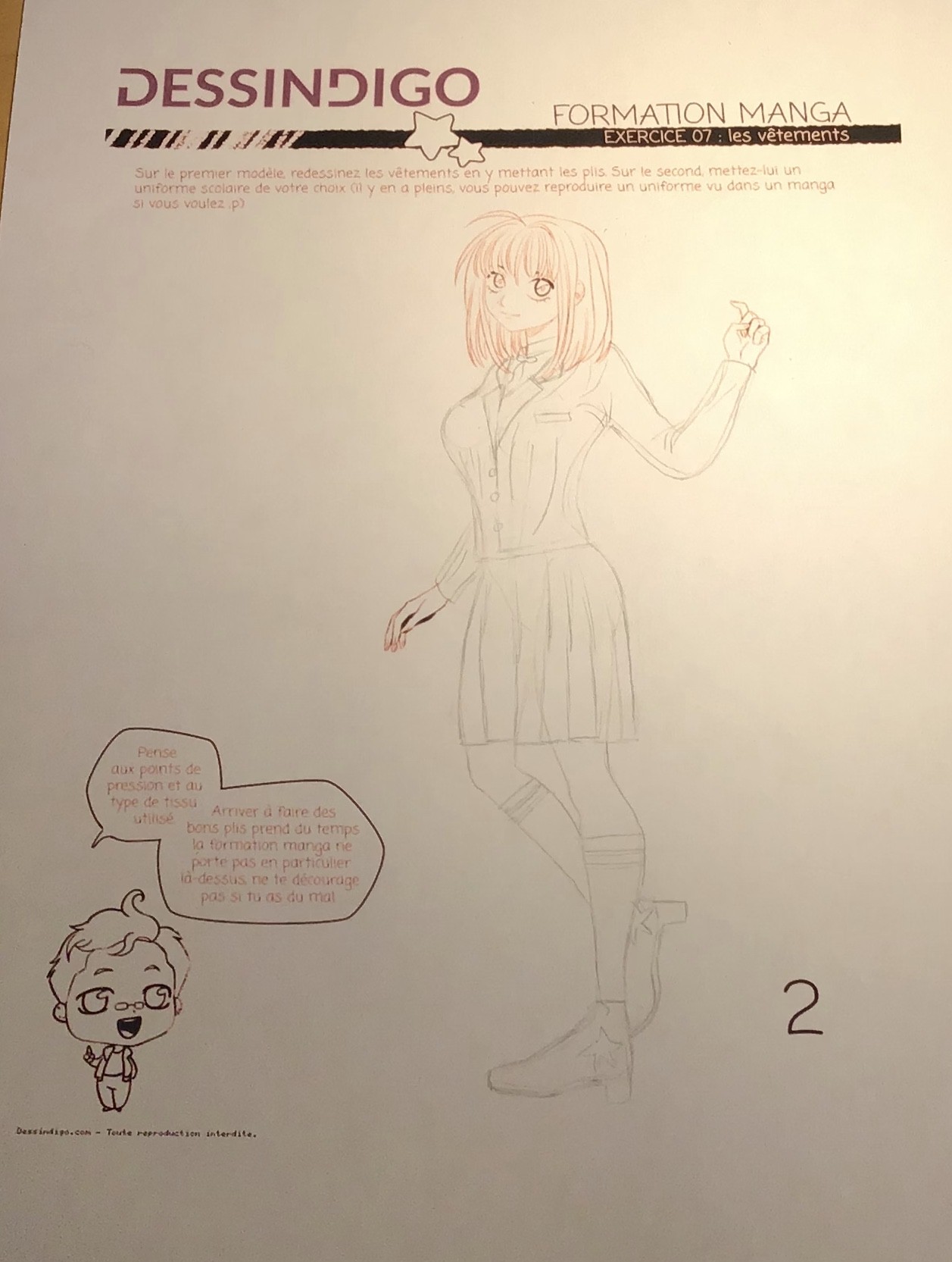 Voici ce que ça donne pour les vêtements. Honnêtement, j'ai tendance à dessiner les plis au "feeling". Je ne sais jamais comment placer les lignes de plis (à la verticale ou à l'horizontale ou autre). Mais je comprends qu'avec la pratique, ça va venir 😉