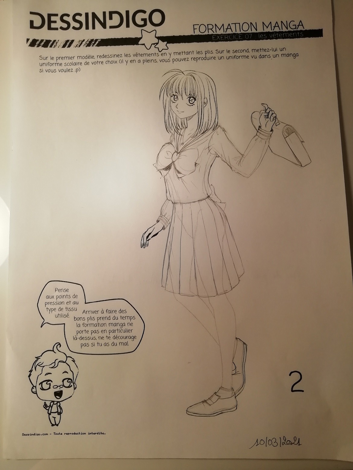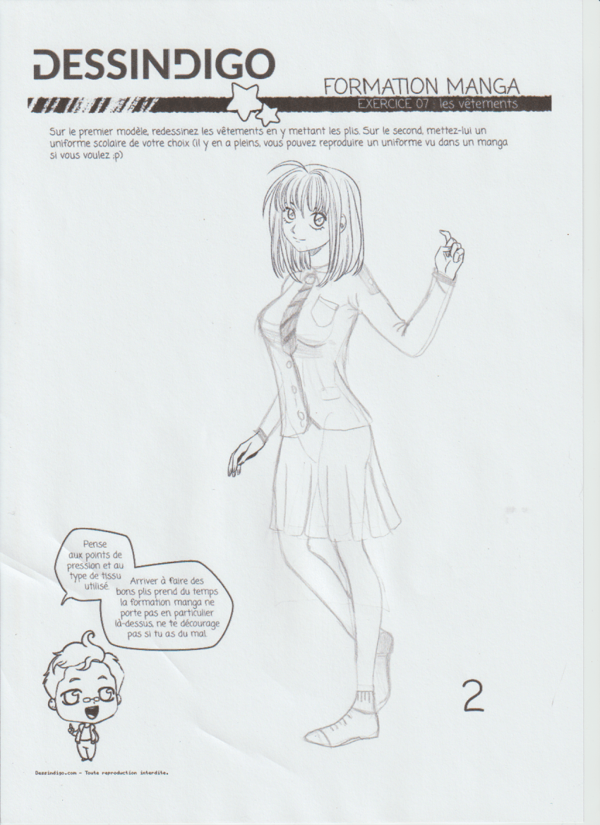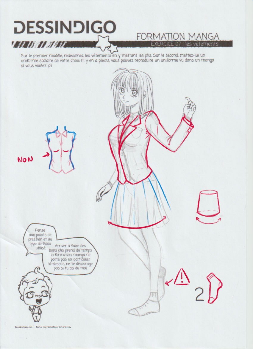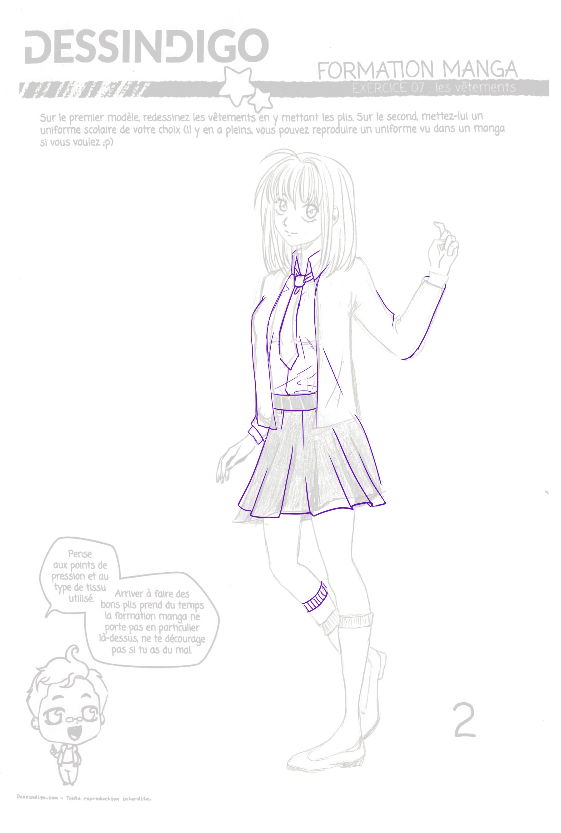 Watch the orientation of the skirt too, it is in the opposite direction to the socks >> not logical. And for the pleated skirt, I refer you back to the correction video, it seems to me that I made a pleated skirt for her uniform, or I make one later in the training during a review illustration.
