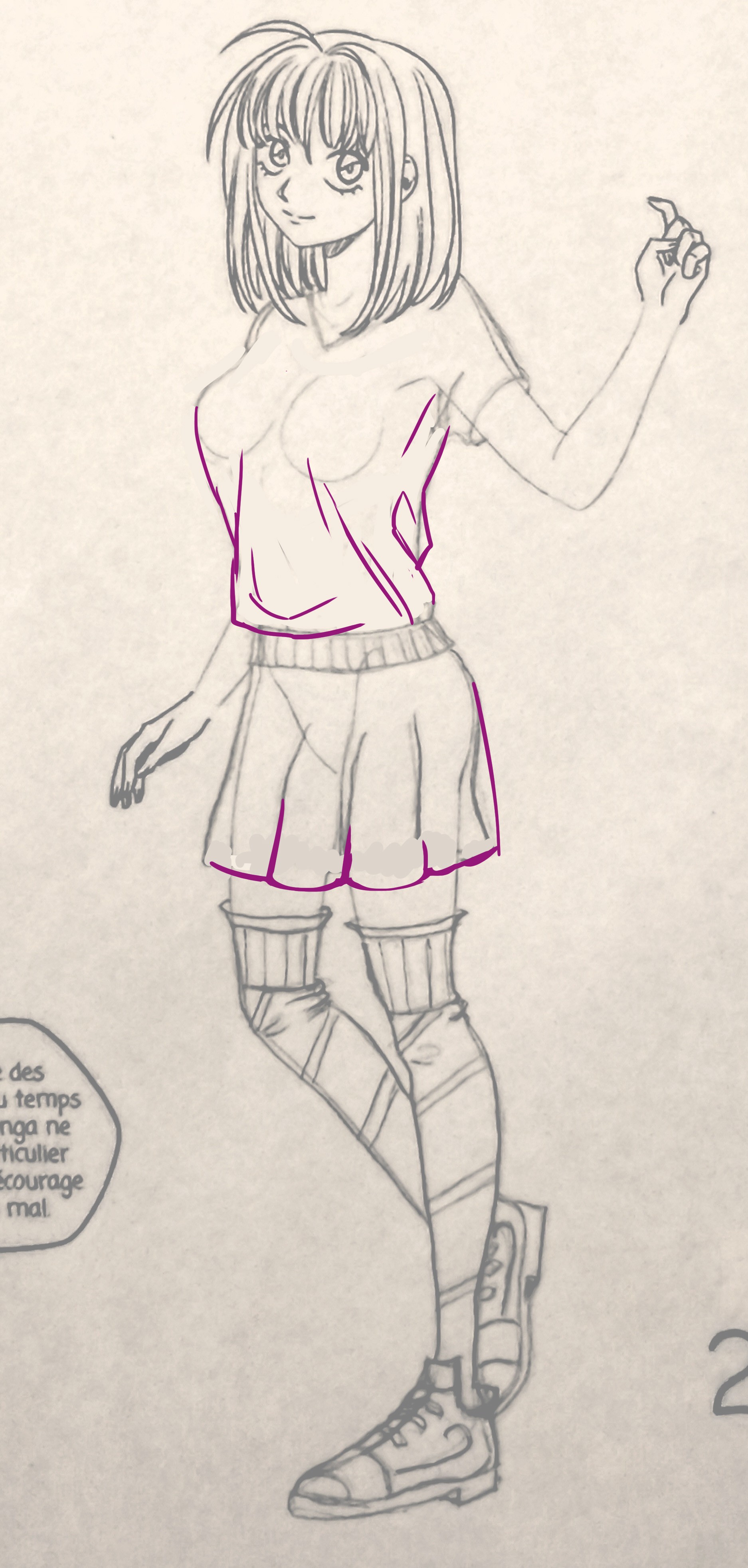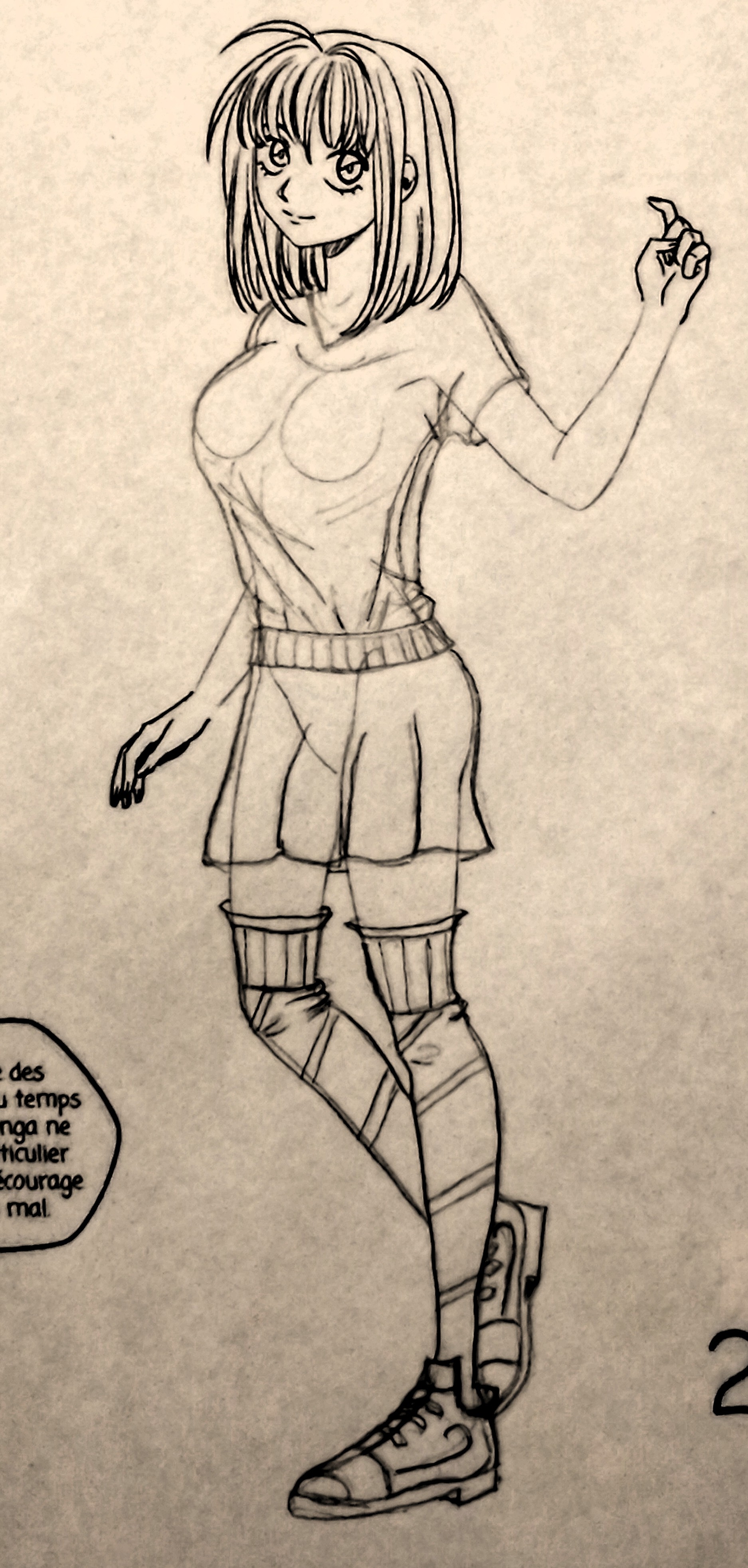Globalement tu es assez juste mais là on a des soucis d'observation pour le coup. Je pense que tu n'as pas pris de référence photo par exemple, pour dessiner le buste. Tu as voulu faire une chemise, mais en fait les plis que tu as fait correspondent à ceux d'un tee-shirt très moulant. Le gilet tu as voulu marquer la poitrine, sauf que ça n'est pas possible aussi. La jupe on est bon tu as juste trop accentué l'inclinaison, à moins que la jupe ait le bord du bas en biais, elle ne peut pas être plus courte vers nous et plus longue derrière. Tu as aussi fait une chaussette nettement plus courte que l'autre.