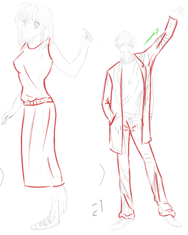 io manquait également de volumes au tissus fin de bien suggérer les formes des plis, tu peux faire des petits forme de V entre deux plis pour bien les suggérer (comme sur le bas du t shirt de la femme, ou le bas du pantalon de l'homme.