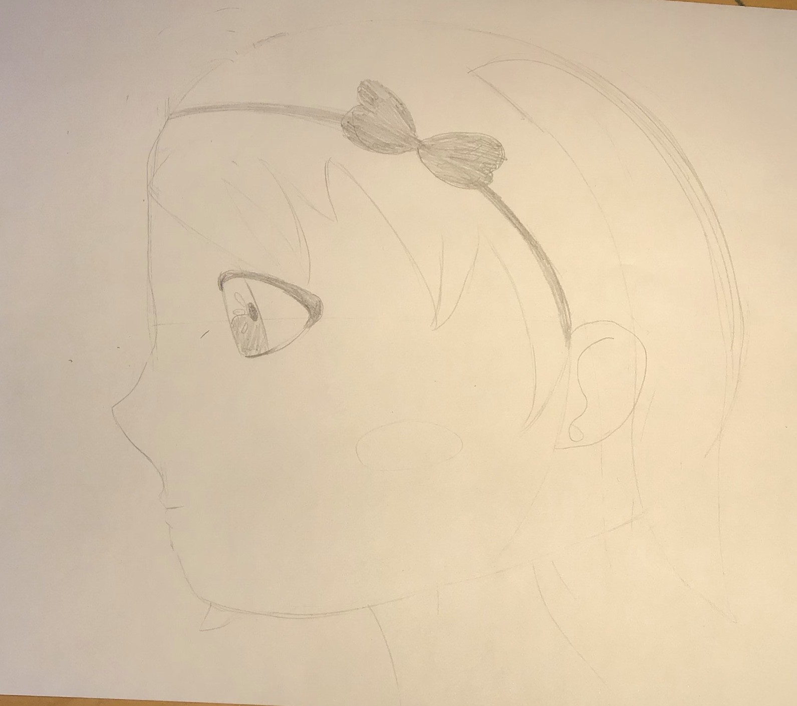 From the side, I am attaching a correction but these are really just small adjustments ^^ The eyes are too big, the ears too small, the neck placed too far forward and there are things to revise on the hair strands.