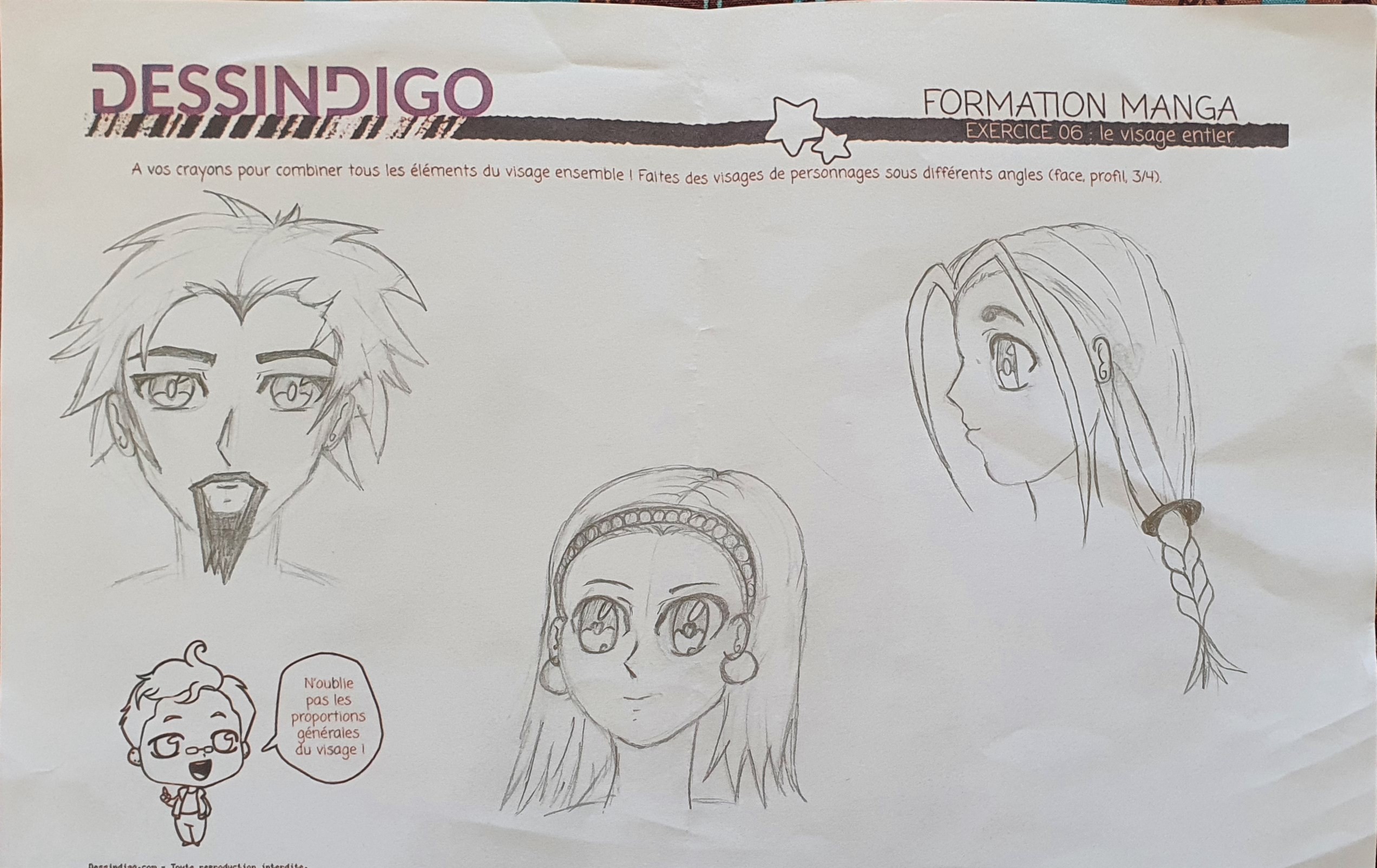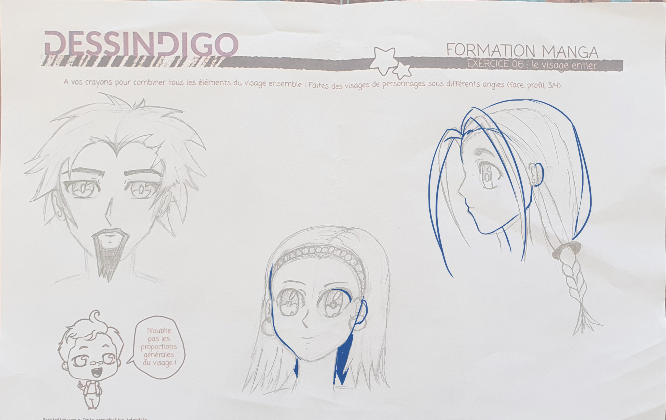 Voici mon exercice. J’ai encore du mal à faire le visage de profil. Pour l’instant c.est le visage de face