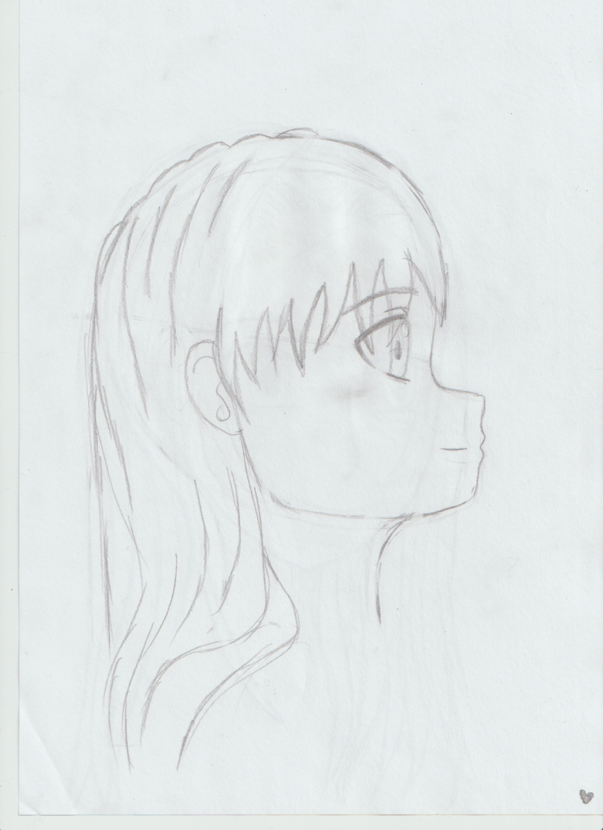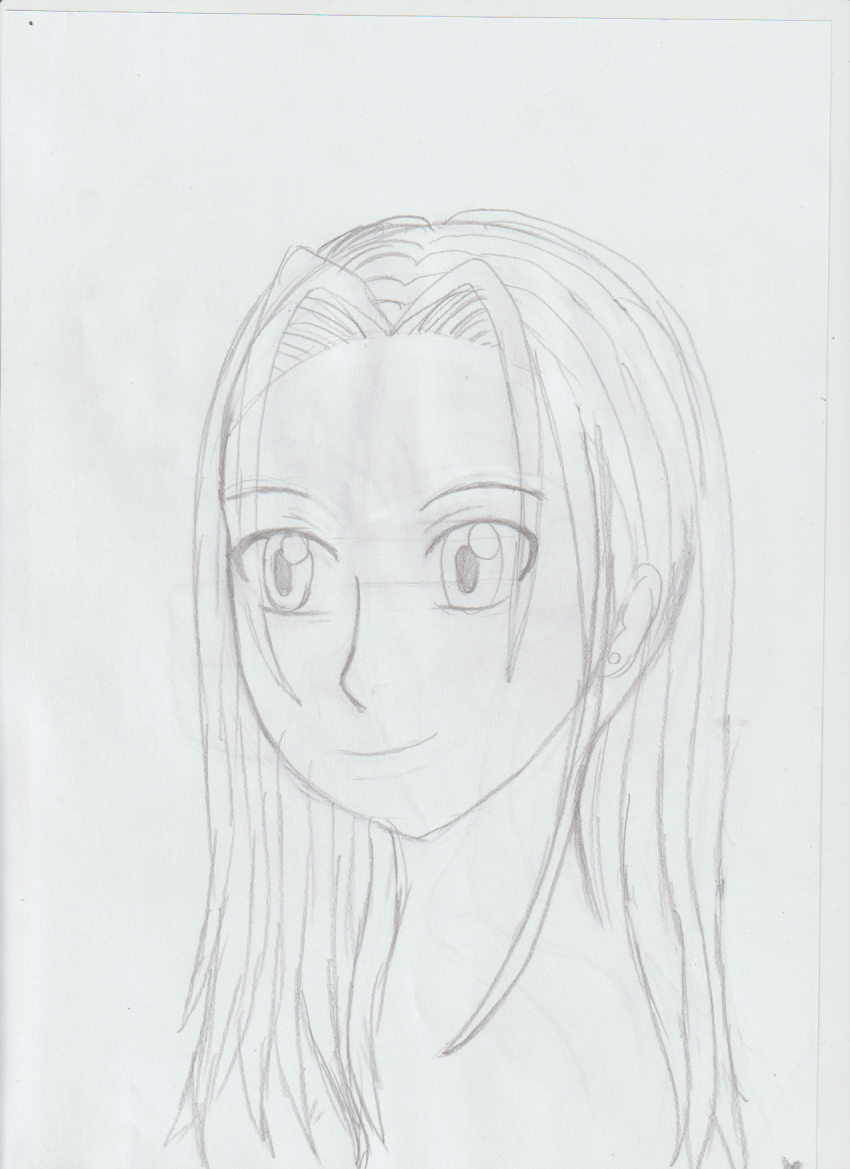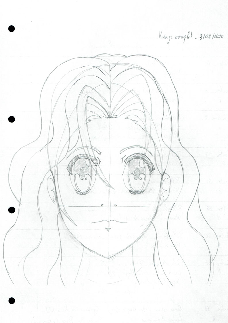 Pour les cheveux, tu t'en sors bien, pense juste à ne pas faire des mèches de la même largeur partout et à ne pas les dessiner de la racine aux pointes. N'oublie pas non plus de varier leur volume à la racine (je t'ai corrigé tout ça aussi).