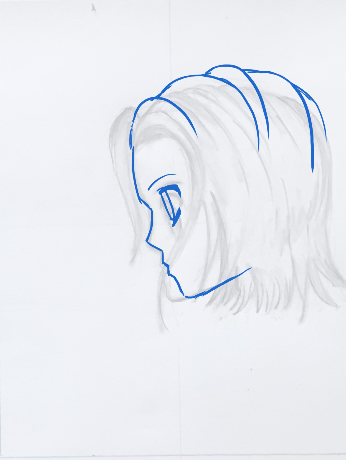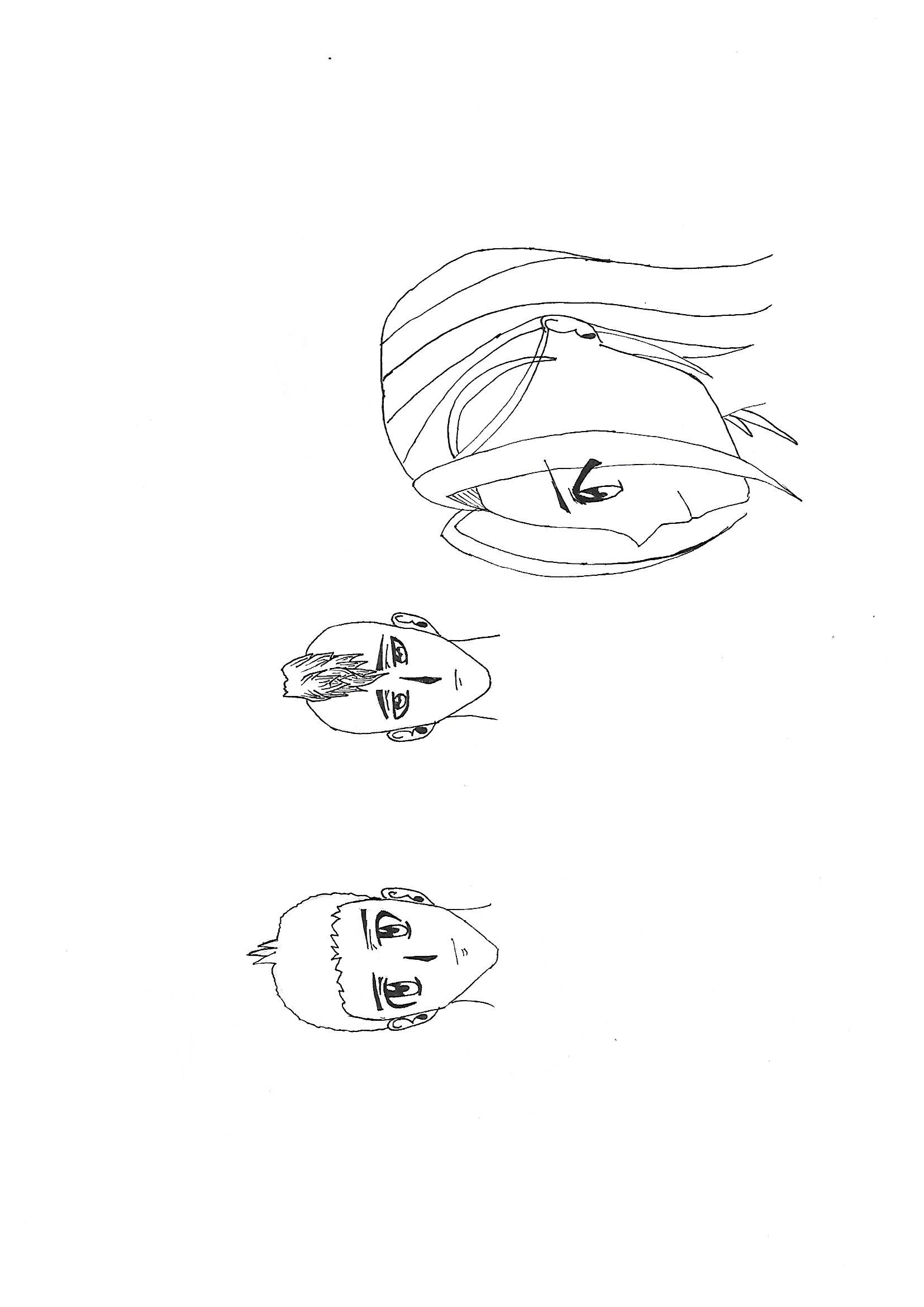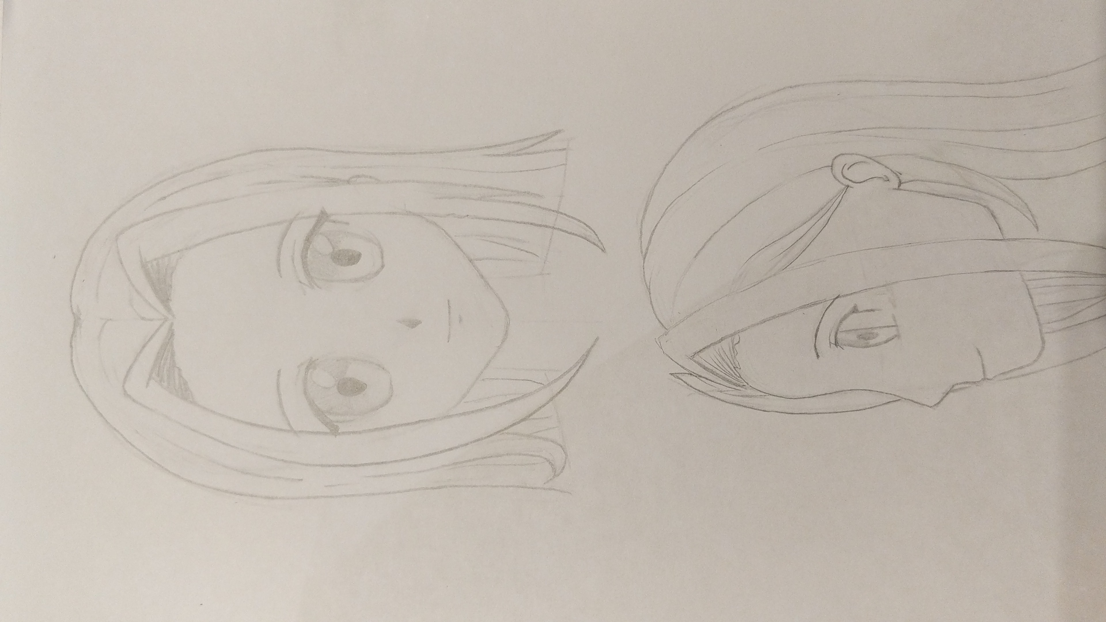 Pour les cheveux, tu t'en sors bien, pense juste à ne pas faire des mèches de la même largeur partout et à ne pas les dessiner de la racine aux pointes. N'oublie pas non plus de varier leur volume à la racine (je t'ai corrigé tout ça aussi).
