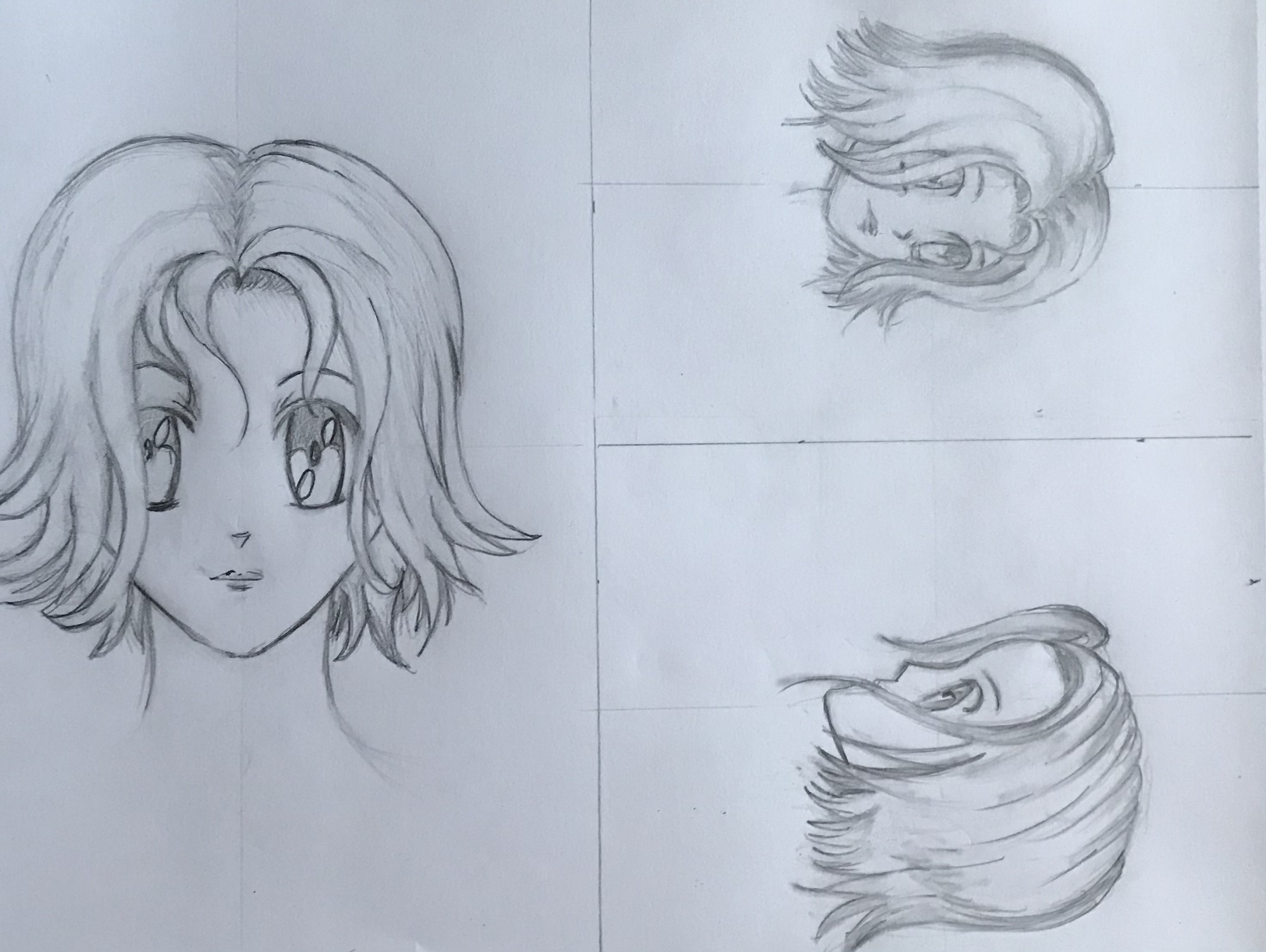 For the hair, you're doing well, just remember not to make the strands the same width everywhere and not to draw them from root to tip. Also, don't forget to vary their volume at the root (I've corrected all that too).
