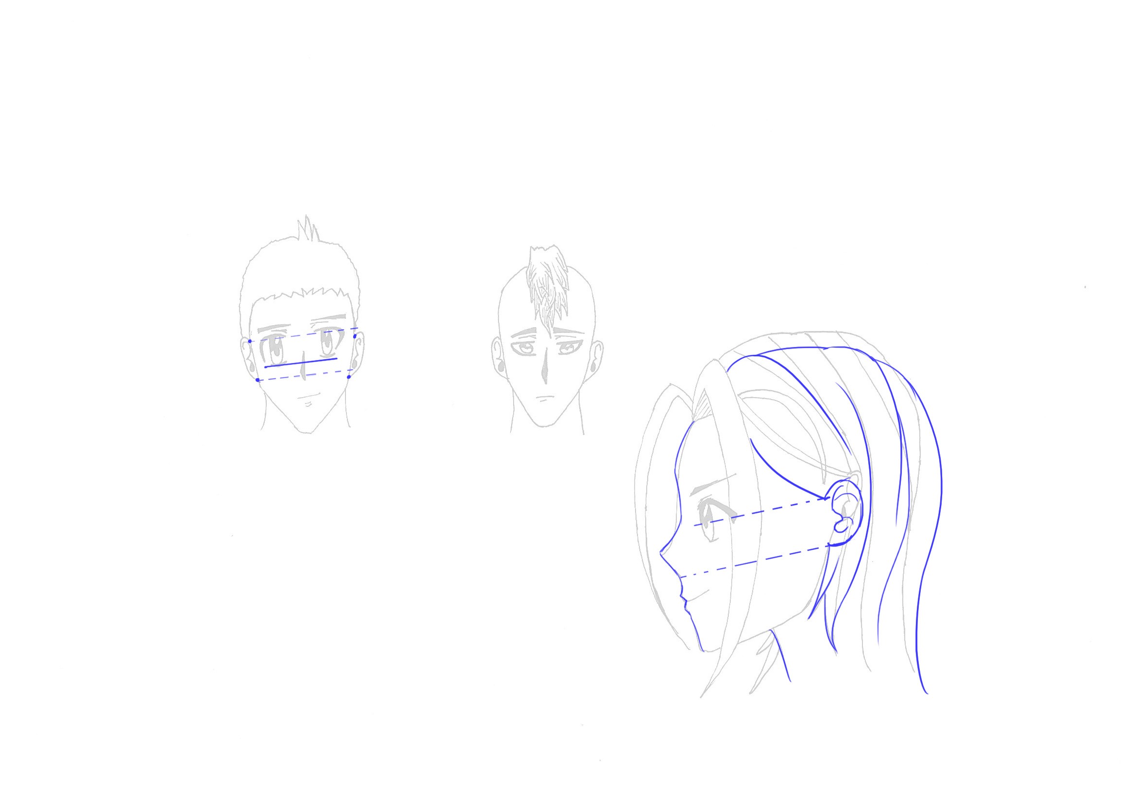 Il y a des choses à revoir sur la vue de profil par contre, je te joins une correction pour ça. C'est surtout le dessin du haut du visage (front + nez) qui cloche, et la position de l'oreille (trop petite et trop haute), je t'ai placé des repères pour que tu vois le décalage ^^