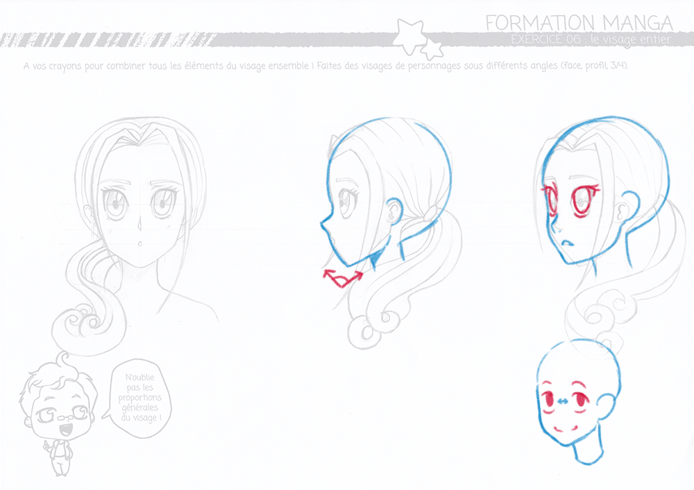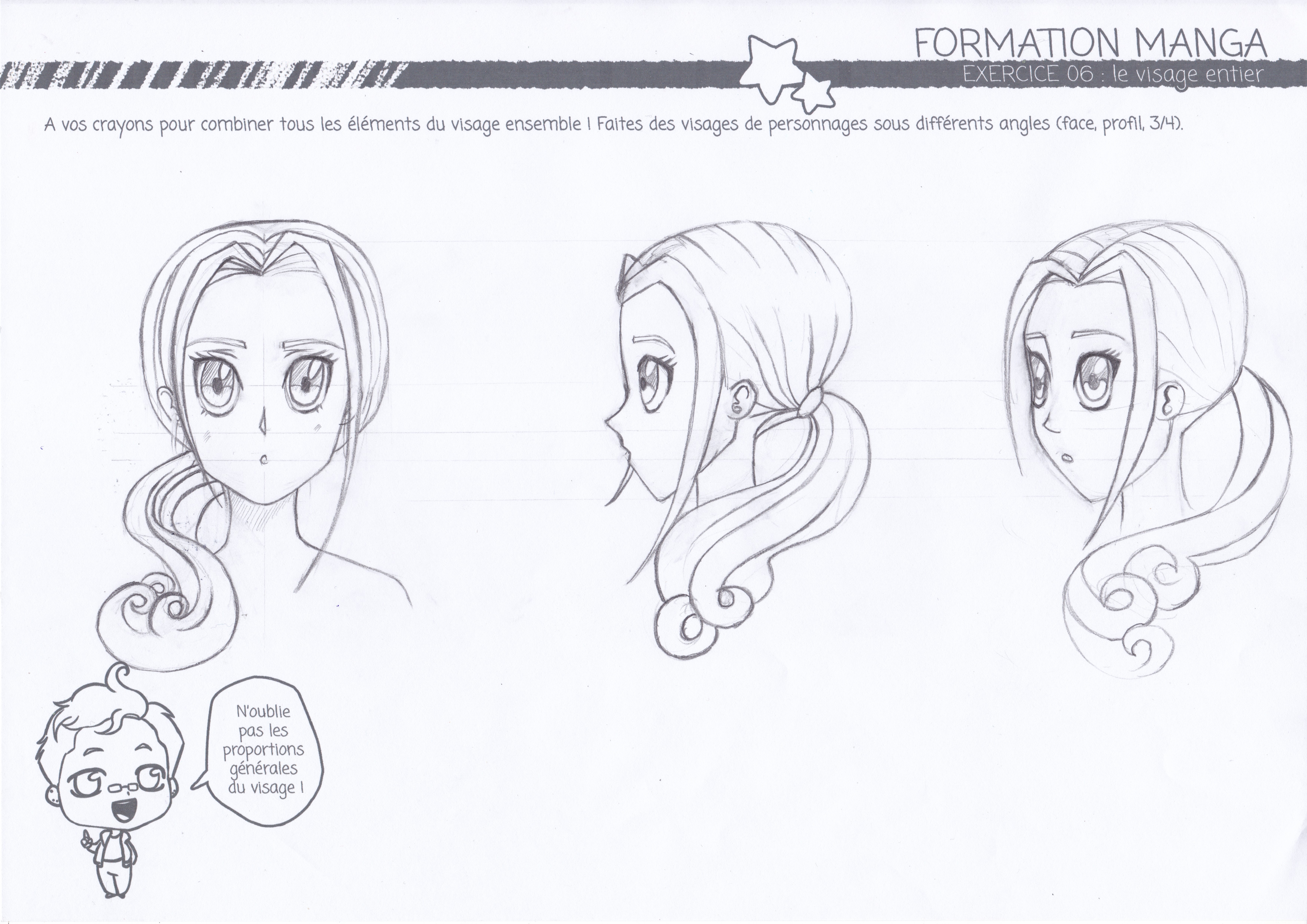 J'ai fait le visage féminin de face, de profil et de 3/4.