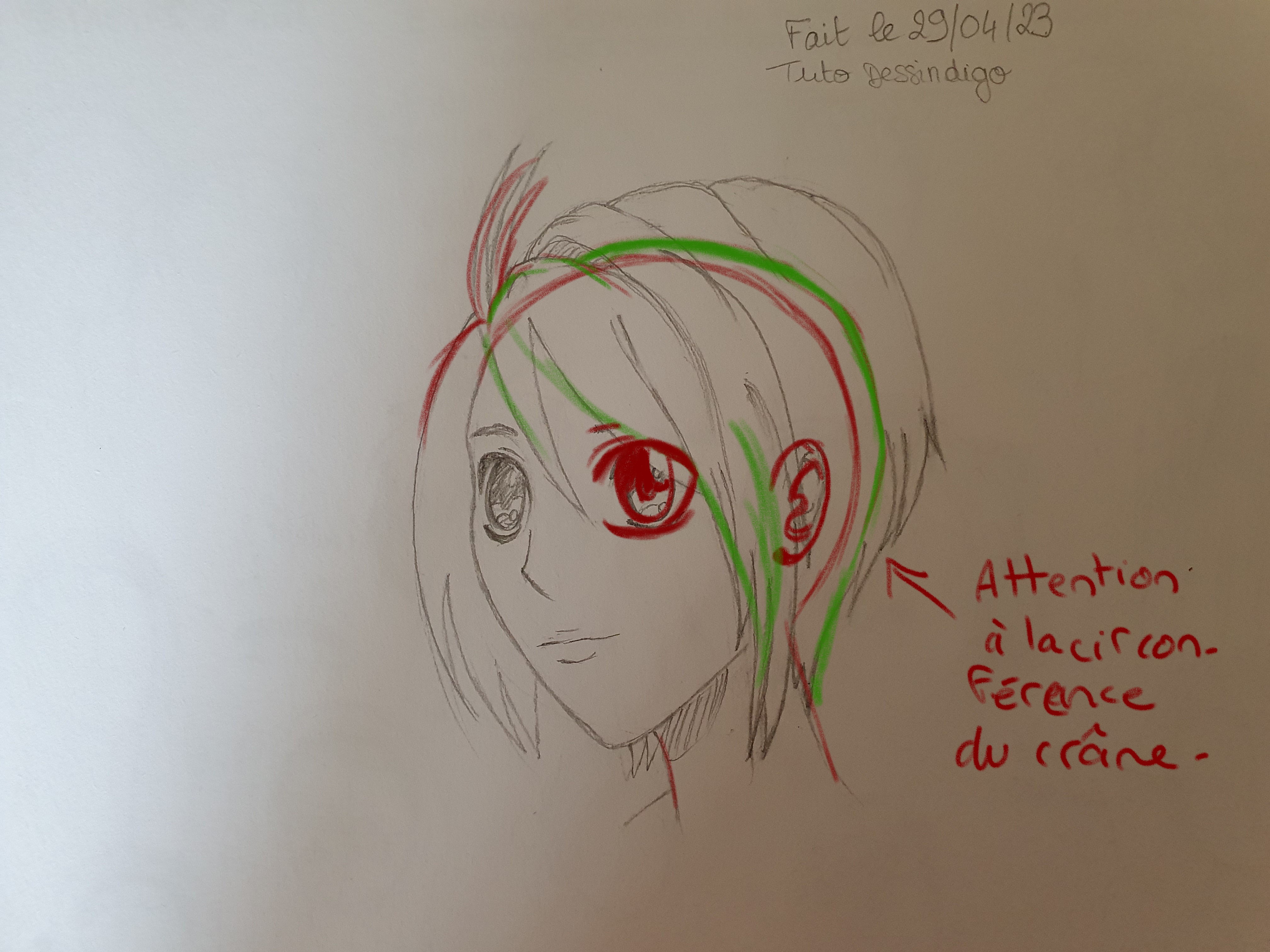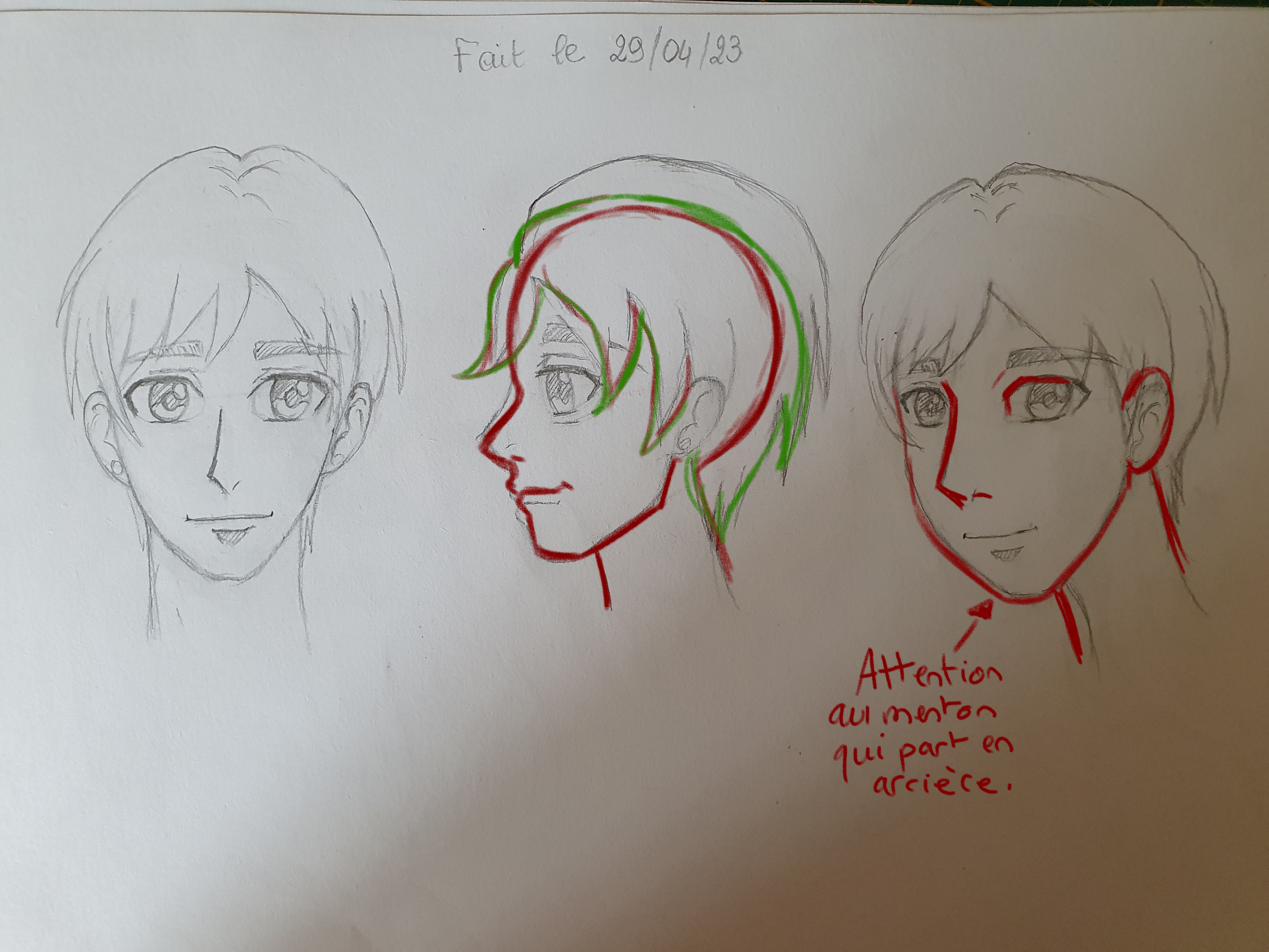 Ton visage de profil est déjà beaucoup mieux que sur ton premier exercice, il reste encore un peu écrasé mais il y a du progrès. Le placement du nez et de la bouche peuvent être un peu relevé. Veille à bien proportionner le volume du crâne (qu'il soit suffisamment gros), et de là tu peux faire ton placement de cheveux en suivant sa courbe et en respectant l'effet de gravité (sens des flèches sur le correctif)