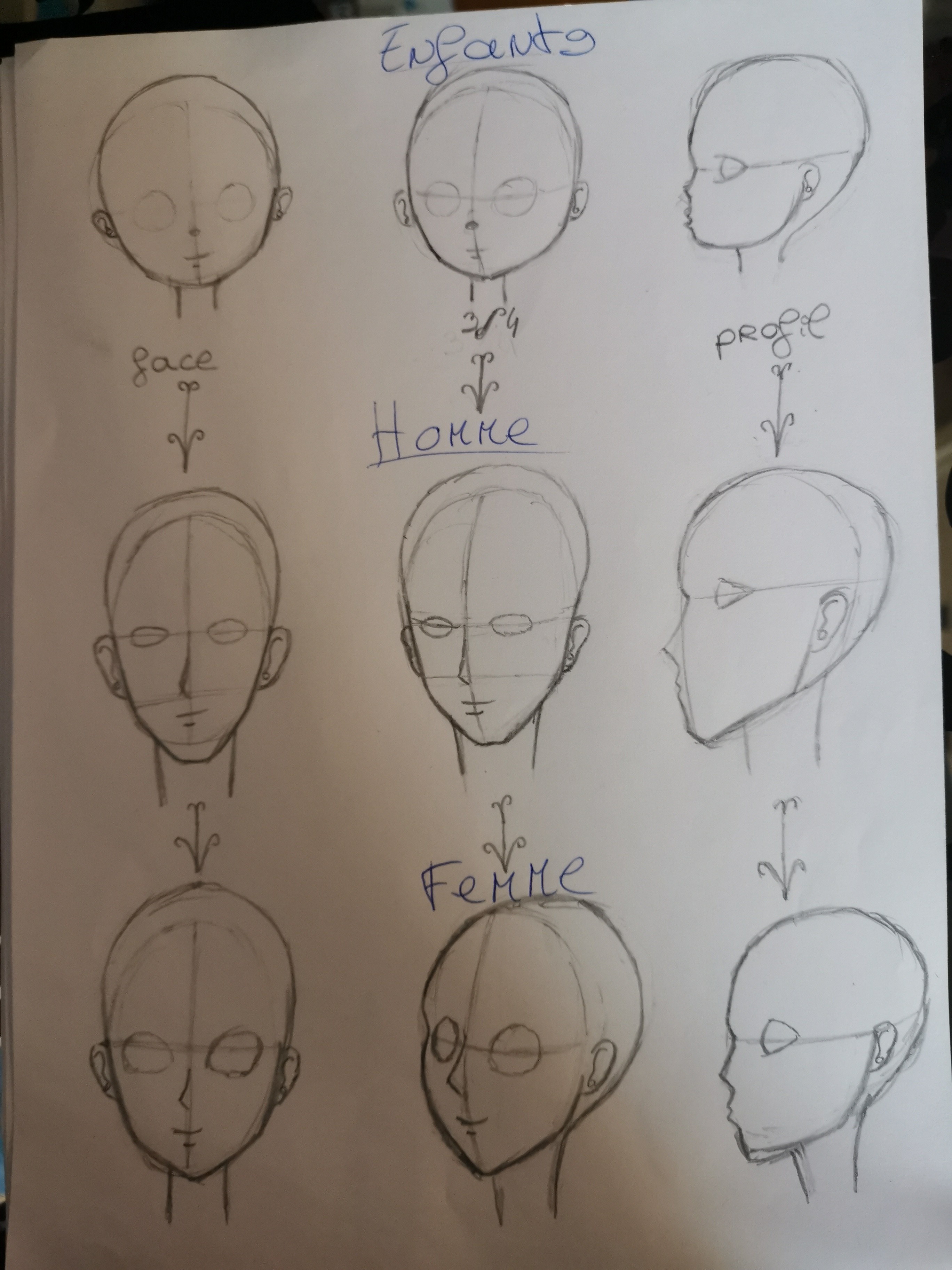 Merci pour les corrections, j'ai noté tous tes conseils sur mes premiers croquis et j'y travaille. En attendant, je poste mes premiers essais pour l'enfant et l'homme de 3/4. Il me semble que j'ai des difficultés pour la forme arrière du crâne et le retour au niveau de l'oreille.