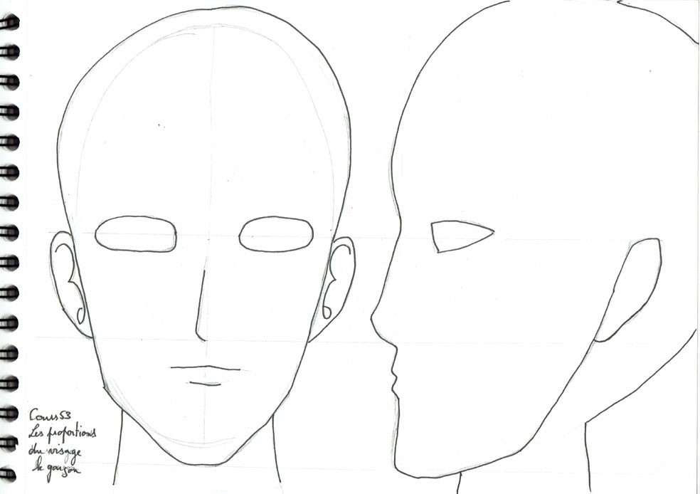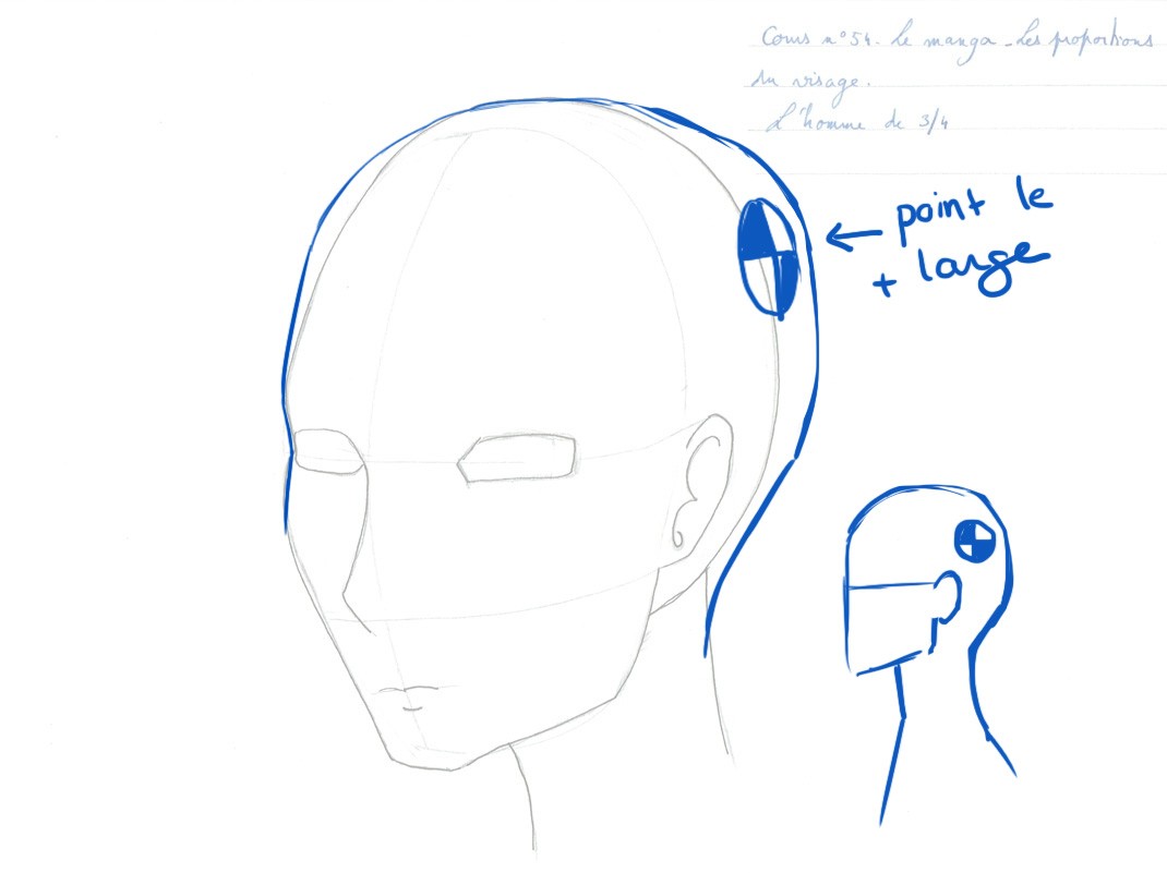Pour le crâne : l'oreille est à peu près située au milieu de la tête quand tu regardes un profil (la jonction de l'oreille au visage je veux dire). Ca te donne une idée de la place du crâne qu'il y a encore derrière. La partie la plus large du crâne se situe à l'aplombe de la nuque à la hauteur des tempes à peu près. Et ça peut varier d'un individu à l'autre. Mais donc le crâne est plus large vers l'arrière que l'avant.