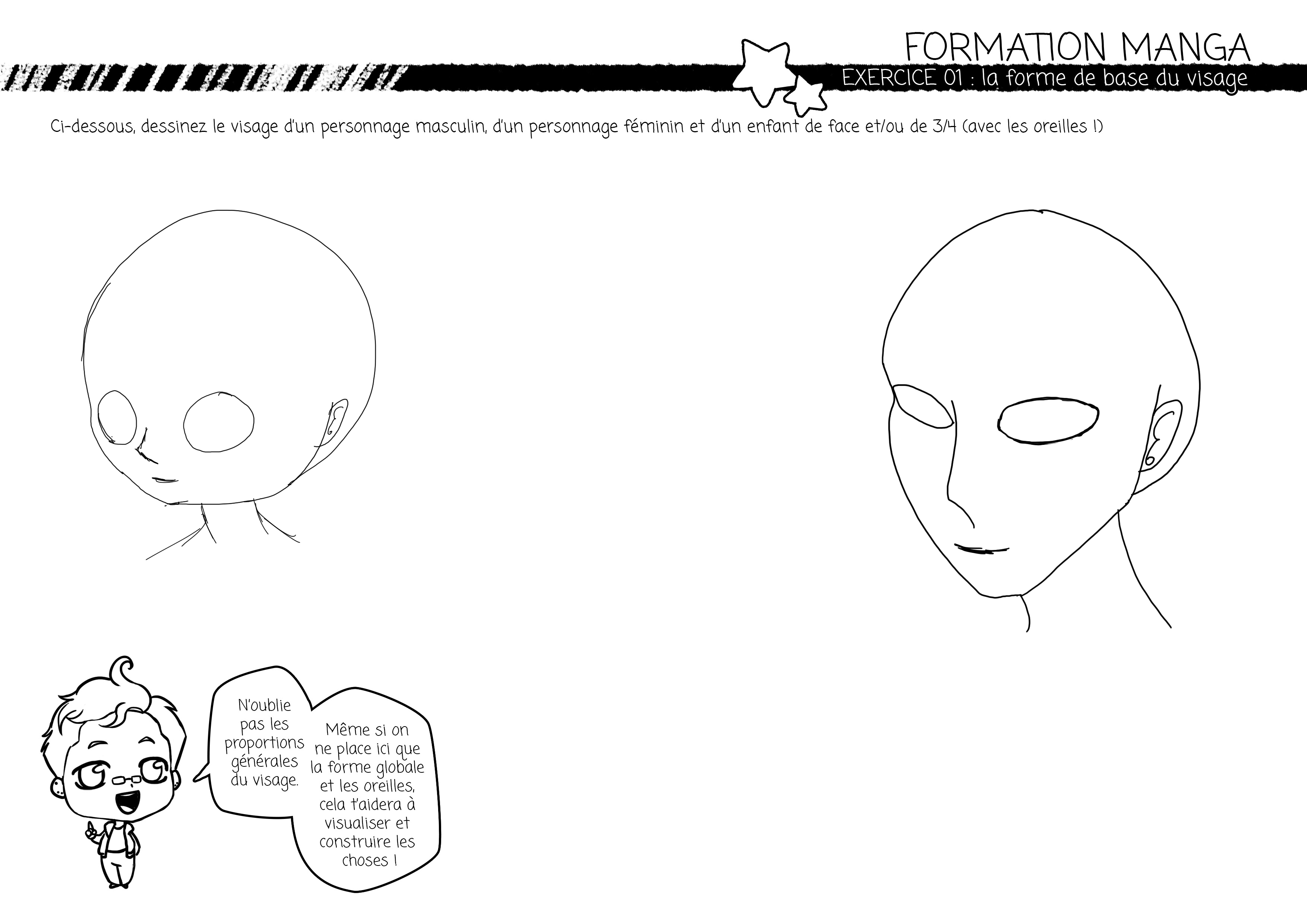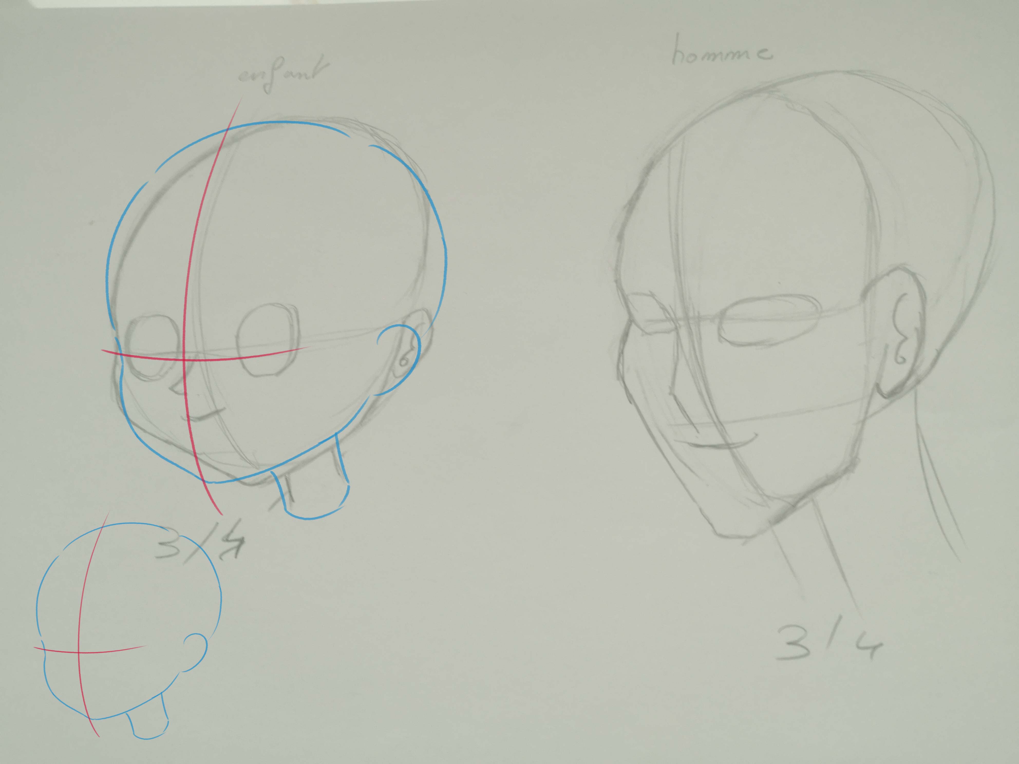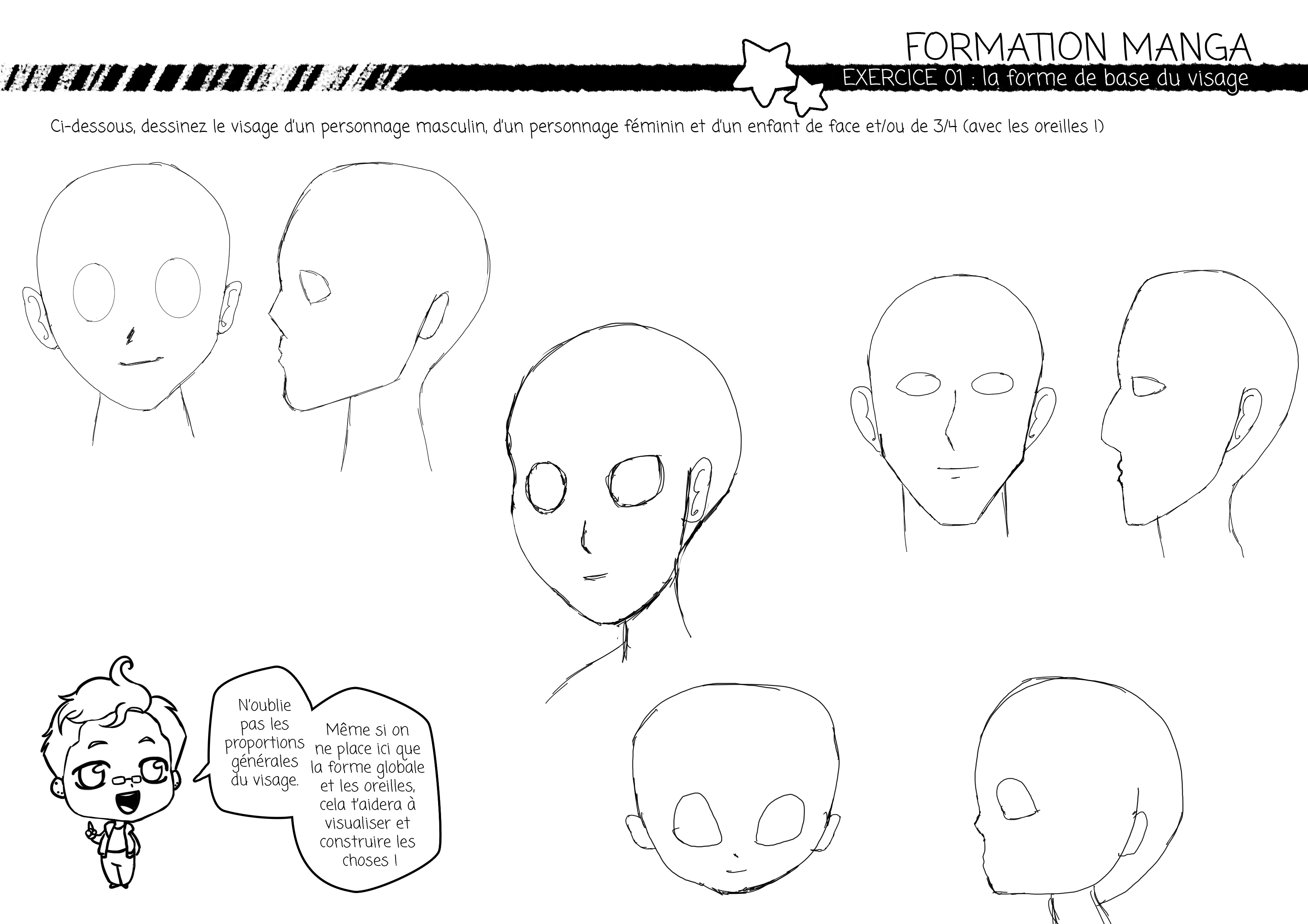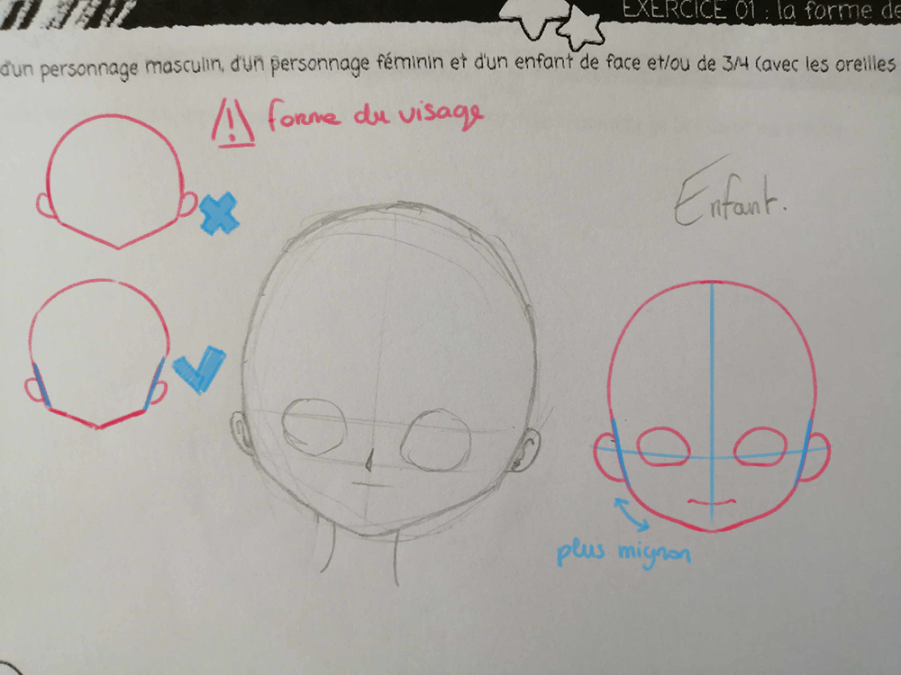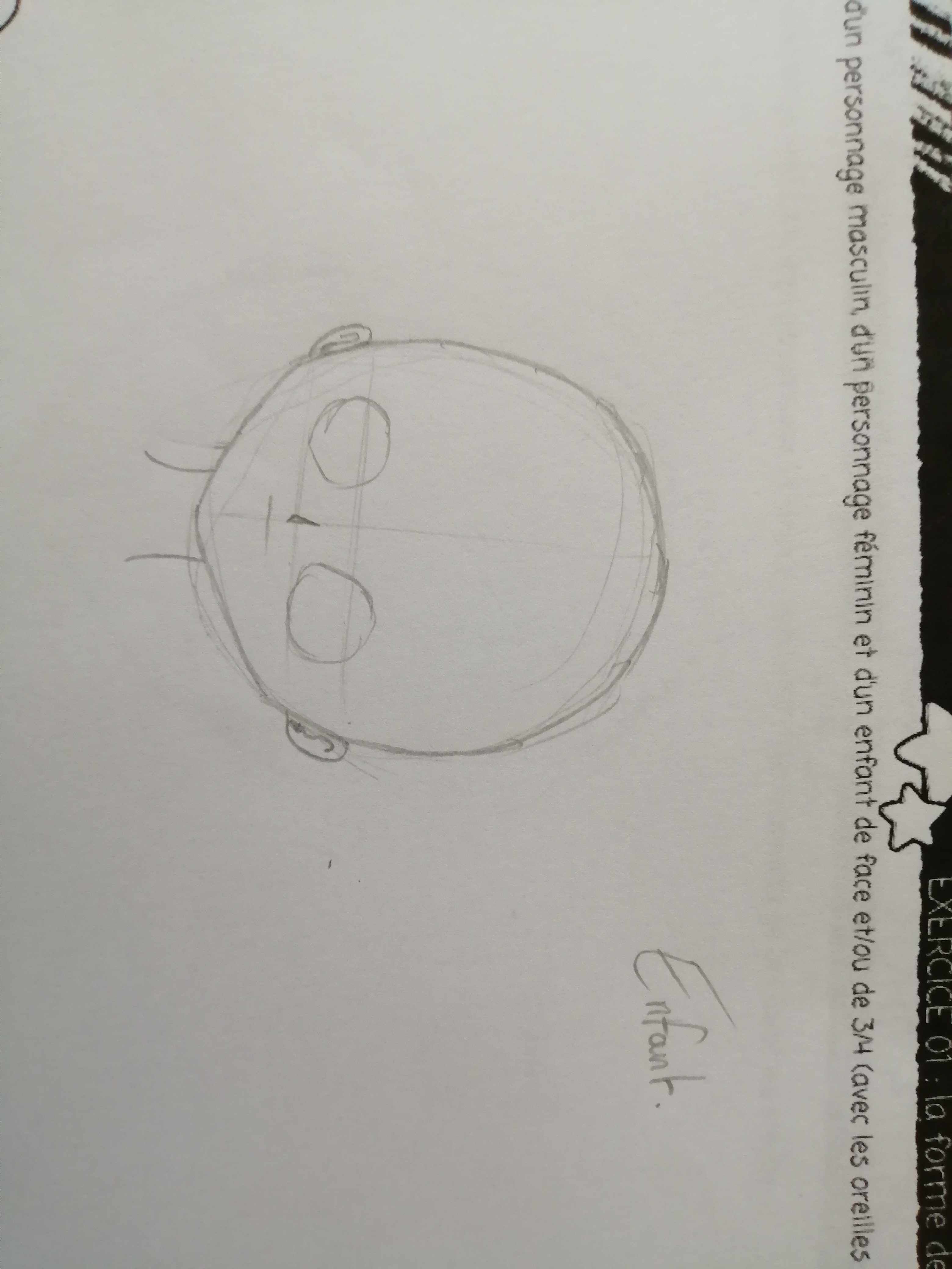 Pour l’enfant, meme si son visage est, de base, beaucoup plus rond que l’homme ou la femme et que les éléments interieur prennent plus de place, il ne faut pas hésiter à lui donner de la forme malgré tout. Définir son menton et son crâne. Si l’enfant est très jeune (quelques mois) son menton sera très arrondi mais la forme du visage sera quand même définie. ^^ Les joues seront bien plus accentuées. :) La tête ne sera pas simplement un cercle ^^