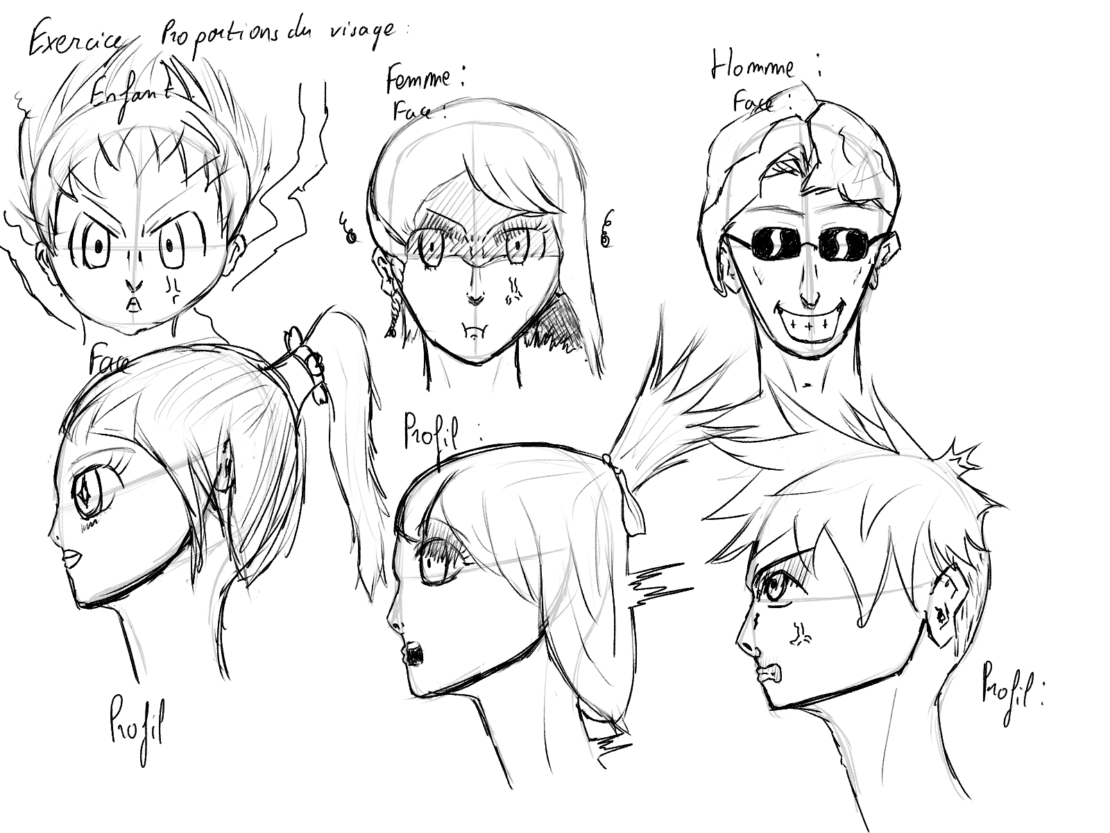 Pour tes visages ceux de face sont vraiment pas mal ! :D Par contre j’aurai préféré que l’homme n’ai pas de lunettes. Je vois cela comme une manière de camoufler une difficulté. Hors, ce n’est pas grave de faire des erreurs. C’est en recommençant qu’on comprends nos erreurs et qu’on s'améliore ^^