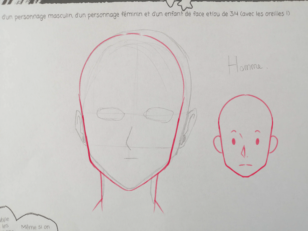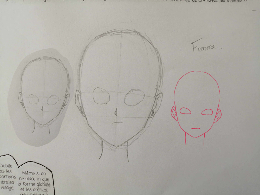 Par contre, mis appart l’enfant et sa tête tout ronde, on ne sait pas forcément faire la différence entre le visage homme et le visage femme. Si il n’y avait pas eu l’annotation à coté, j’aurai même pensé que le visage de femme était celui du dessus et celui de l’homme en dessous. En général, en manga, les visages féminins sont plus petits et fins que ceux des hommes. Ils peuvent également être plus ronds selon l'âge du personnage et le style graphique choisi.
