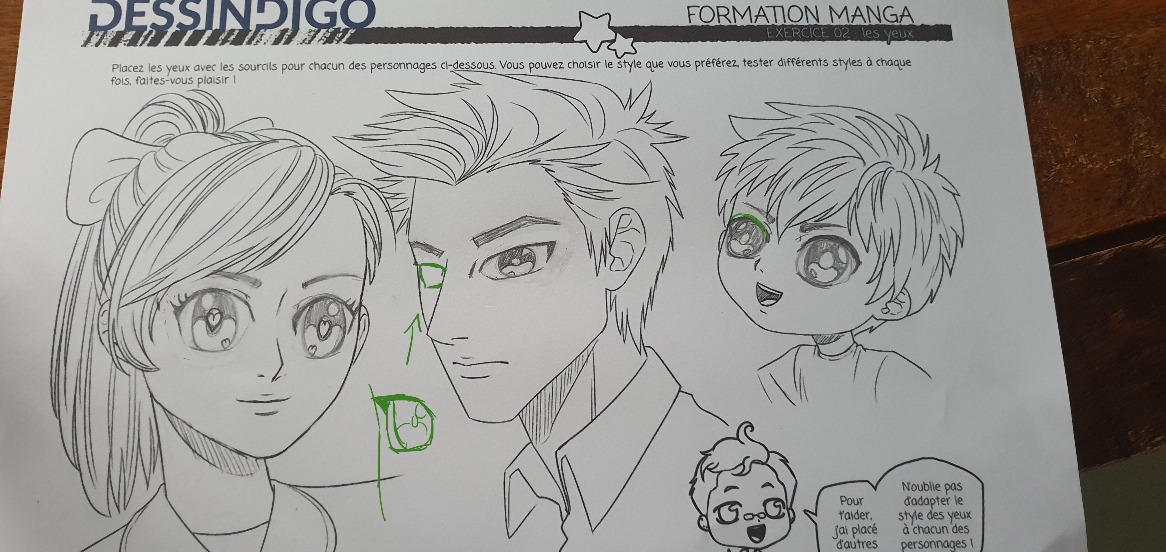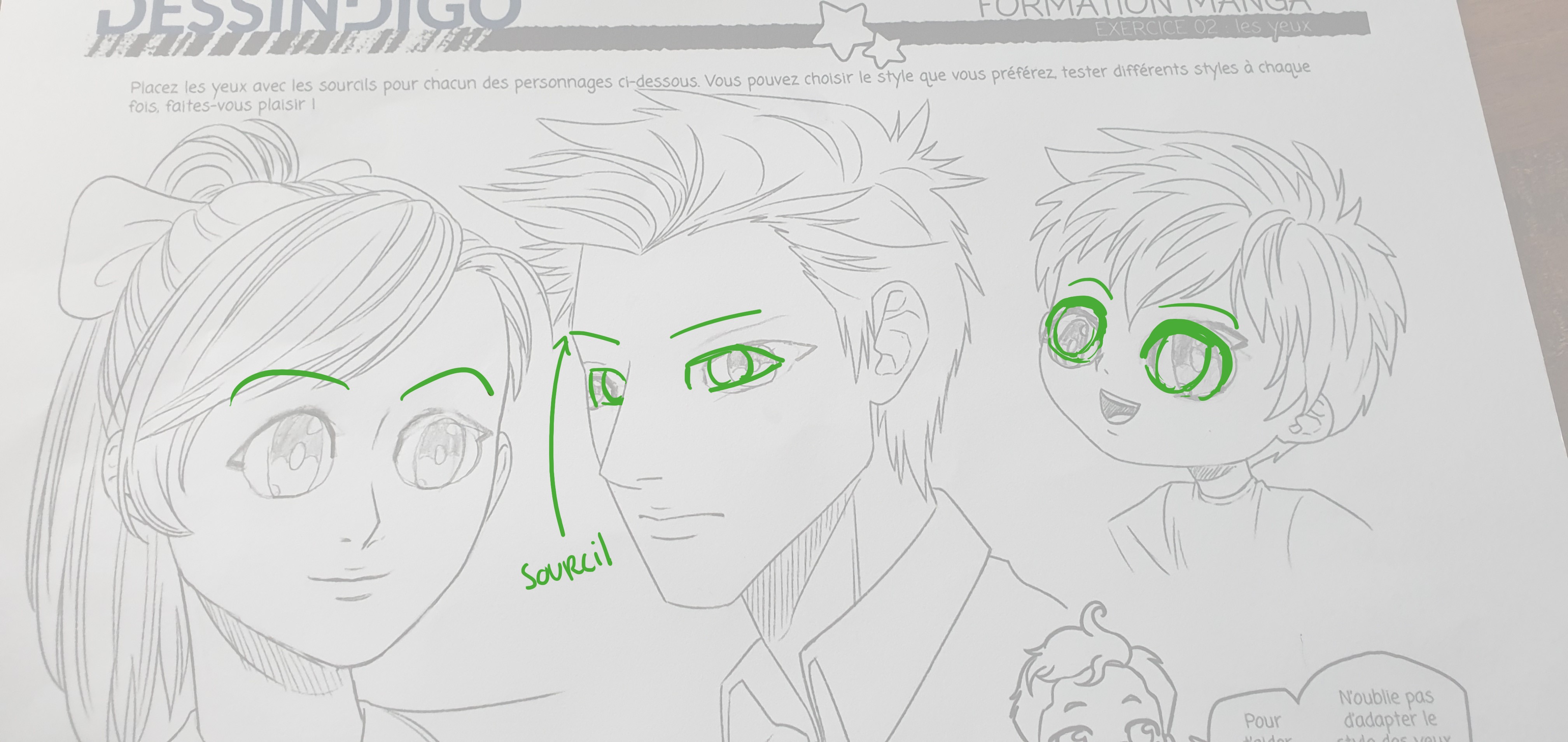 L'homme par contre, c'est trop. Ses sourcils sont plus petits que ses yeux : dans la rĂ©alitĂ© ça n'arrive quasi jamais. MĂȘme si on peut choisir volontairement de faire des touuuut petits sourcils, mais mais ça n'est ps le cas. Tes sourcils sont normaux, c'est l'oeil qui est dĂ©mesurĂ©. Et celui sur le profil ne devrait pas toucher le bord du visage. Je t'ai fait un petit croquis pour appuyer ça. Je t'ai joint une petite correction aussi pour que tu visualises mieux đ
