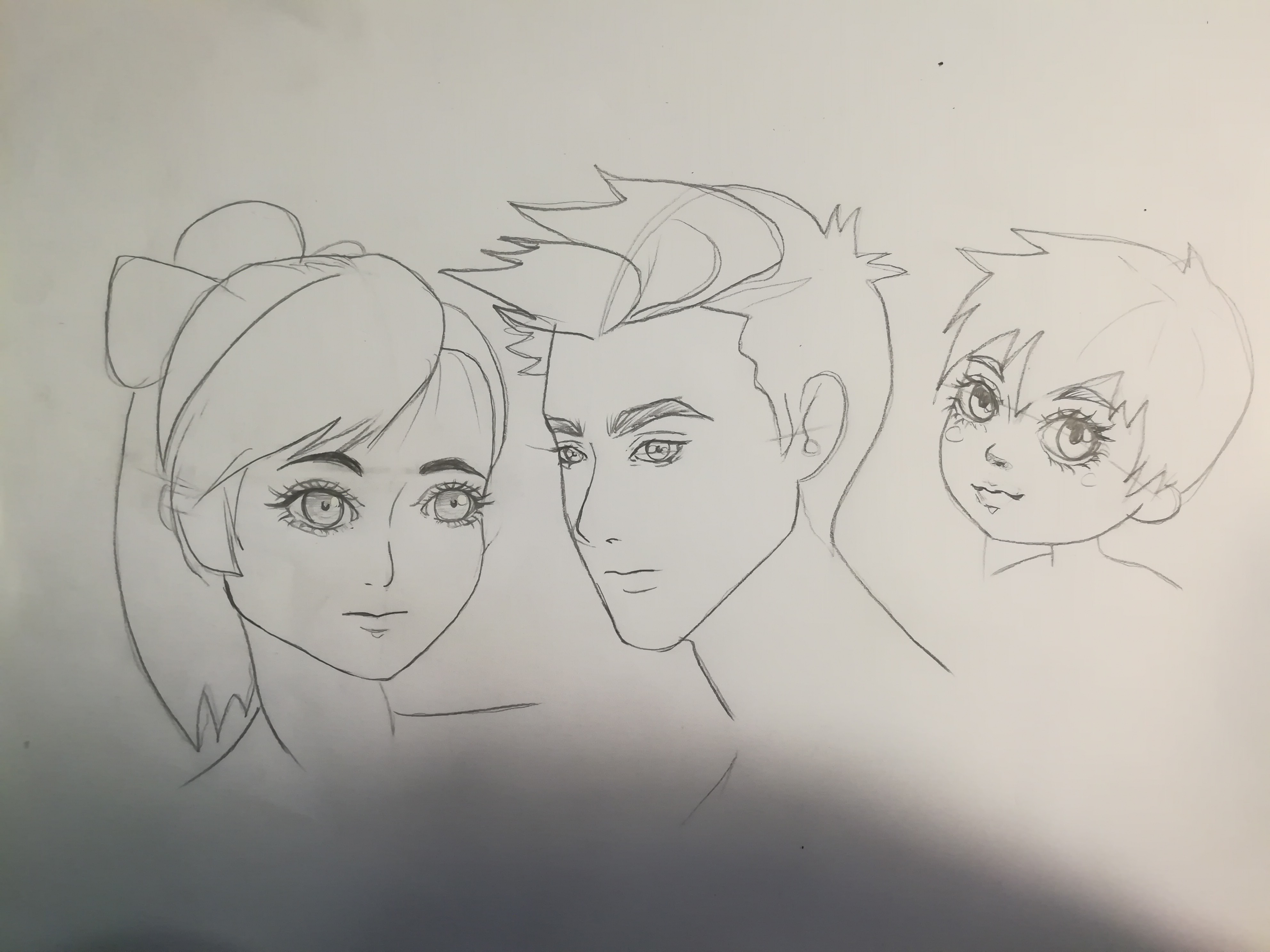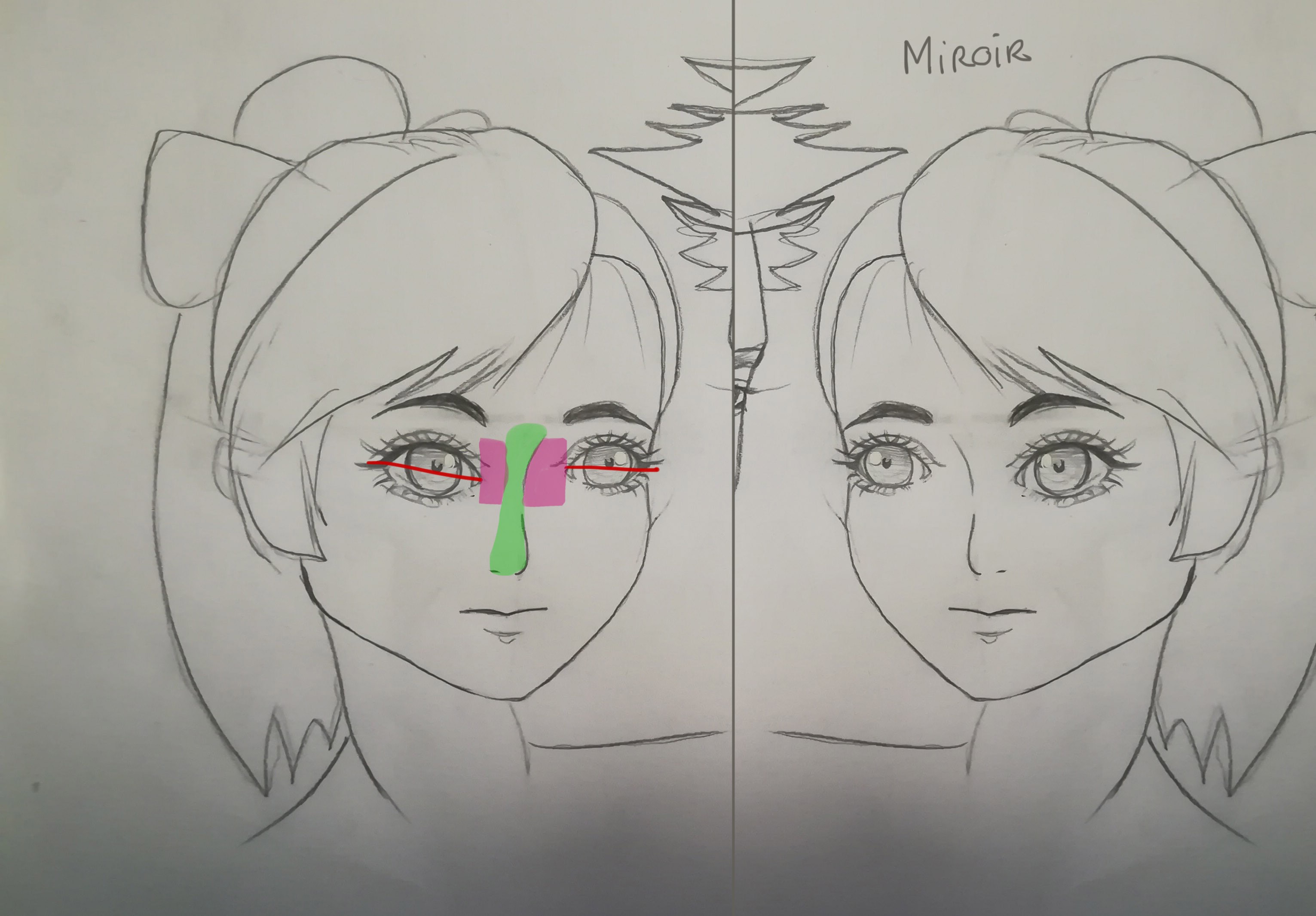 As you said, you struggle with making symmetrical eyes, so you'll need to practice. Don't hesitate to take a step back from your drawing, or place a mirror in front of it to see its reflection. You will see all the flaws magnified x10 (guaranteed effect). It will help you see more clearly what's wrong ^^ Also remember that the nose is located between the two eyes, so there should always be a similar spacing between the nose and the eyes. I've attached a little example to help you see what I'm talking about. But ironically, the children are the most successful (the eyes are well placed ^^). You've got some good things, but indeed, you need to pay attention to the placement and size of the elements :D