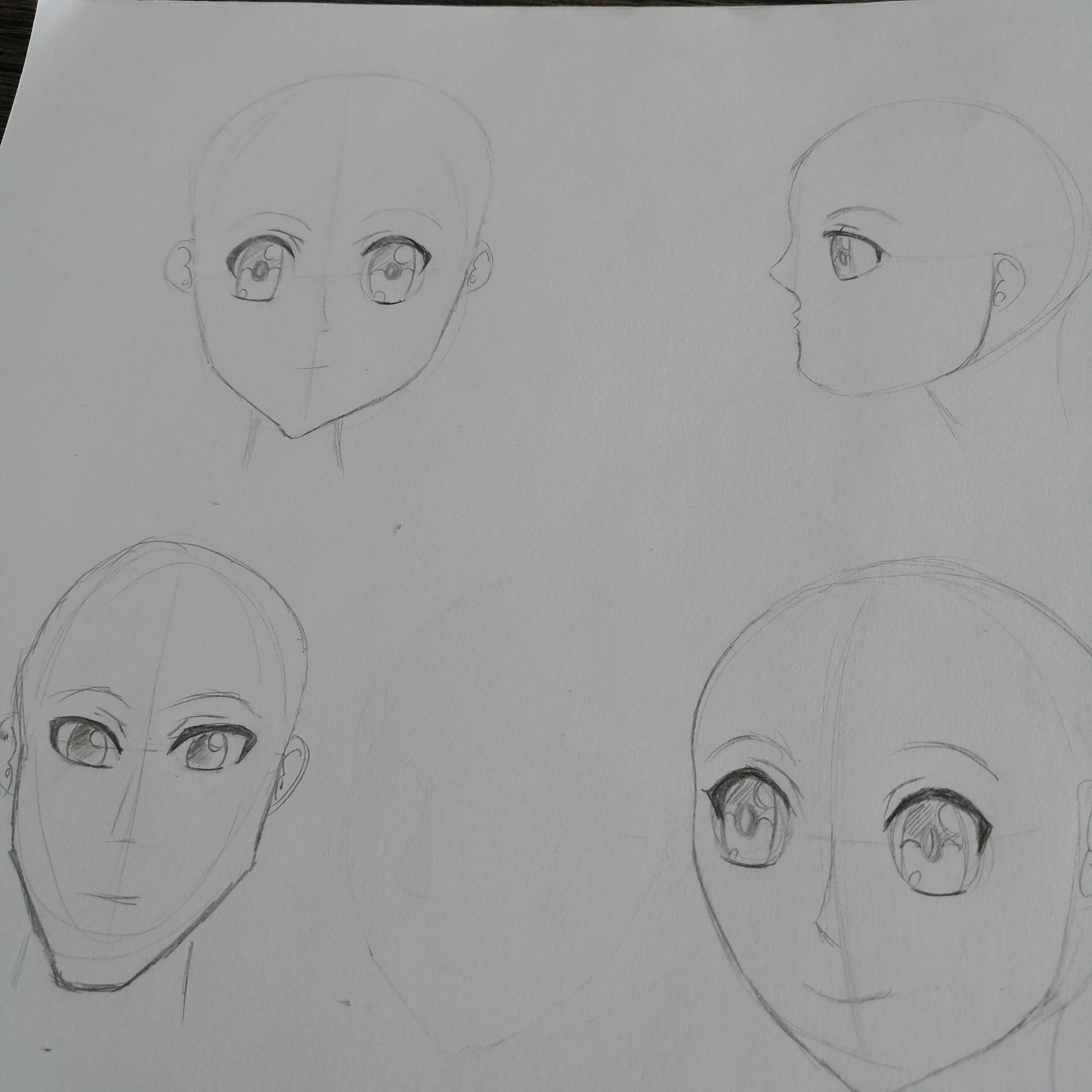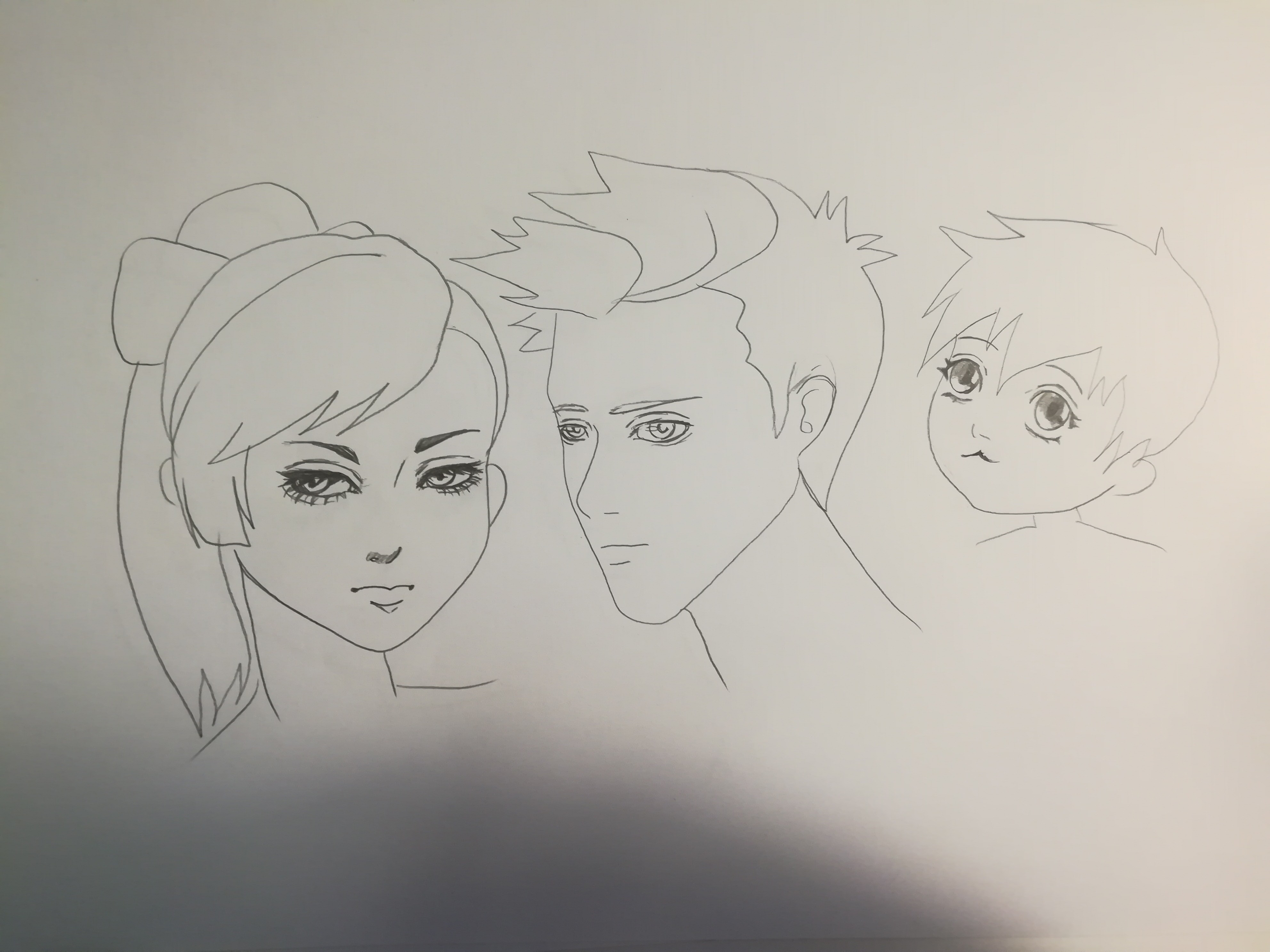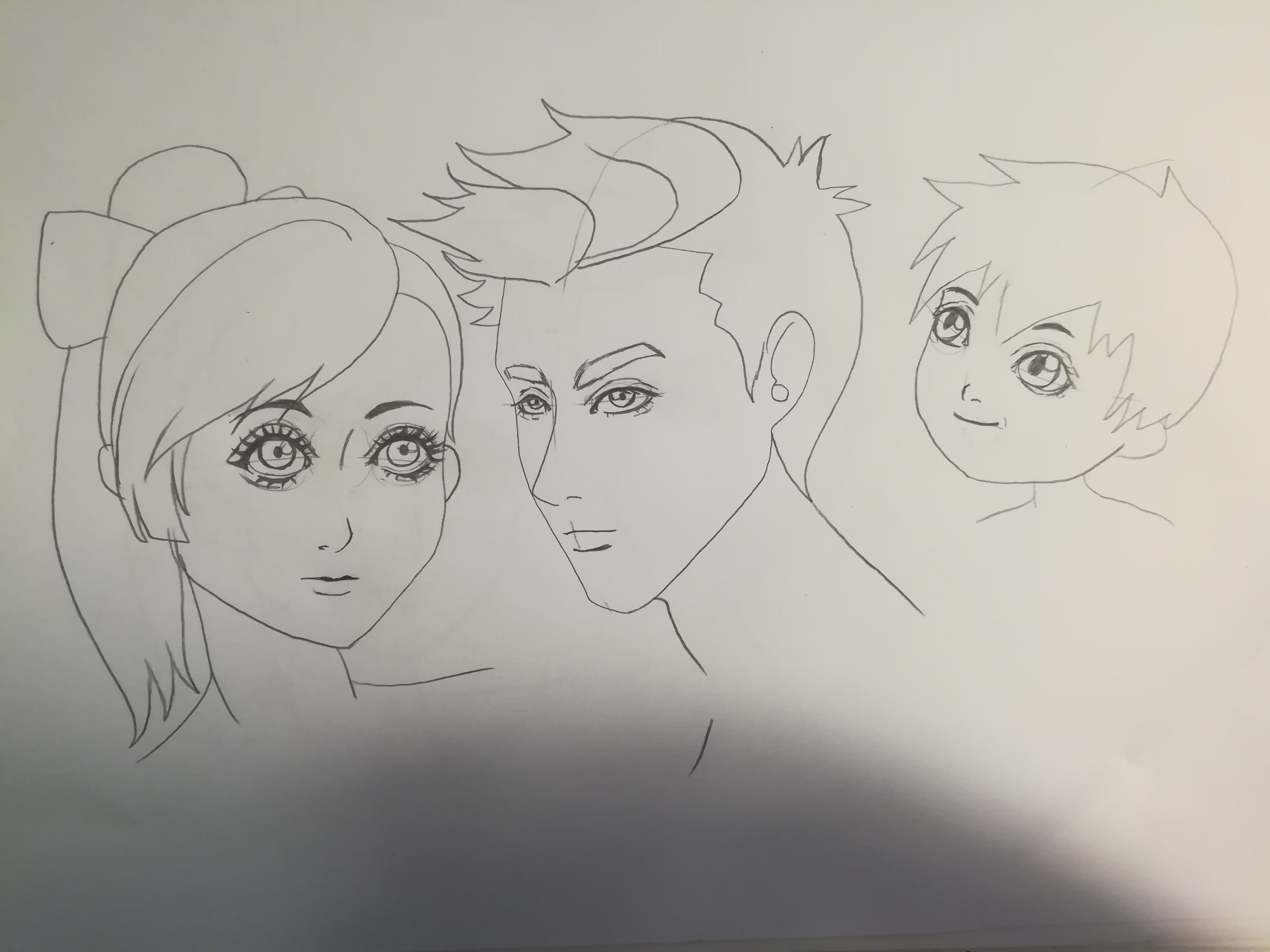 Comme tu l'as dit, tu as du mal à faire des yeux symétriques, il va donc falloir t'entrainer. N'hésite pas à prendre du recul sur ton dessin, ou à placer un miroir devant pour voir le reflet de ton dessin. Tu vas voir tous les problèmes ressortir x10 (effet garanti). Ca te permettra de voir plus clairement ce qui cloche ^^ N'oublie pas aussi que le nez est situé entre les deux yeux, on doit donc toujours avoir un espacement similaire entre le nez et les yeux. Je t'ai joint un petit exemple pour t'aider à voir ce dont je parle. Mais paradoxalement, les enfants sont les plus réussis (les yeux sont bien placés ^^). Tu as de bonnes choses, mais effectivement, il faut faire attention au placement et à la taille des éléments :D