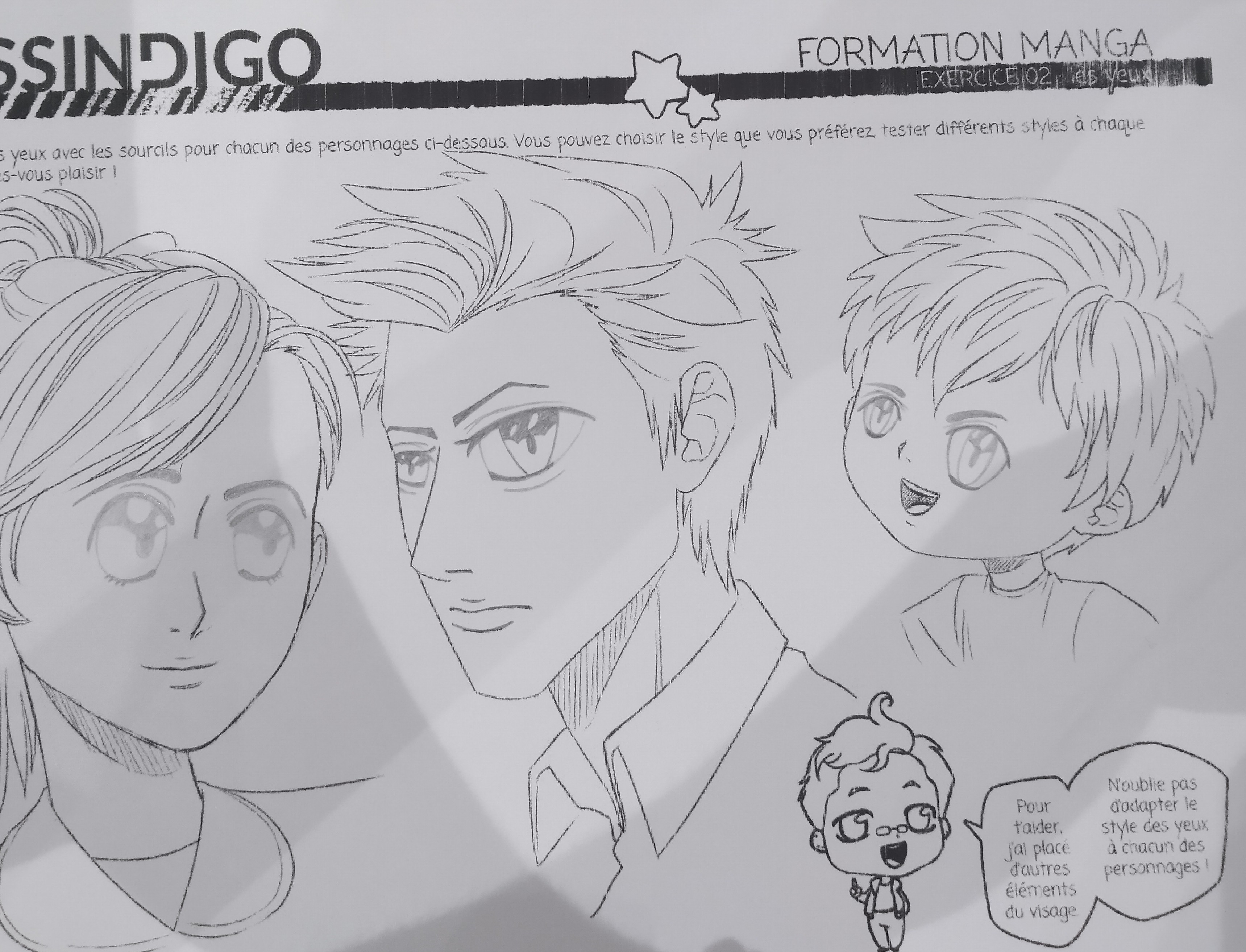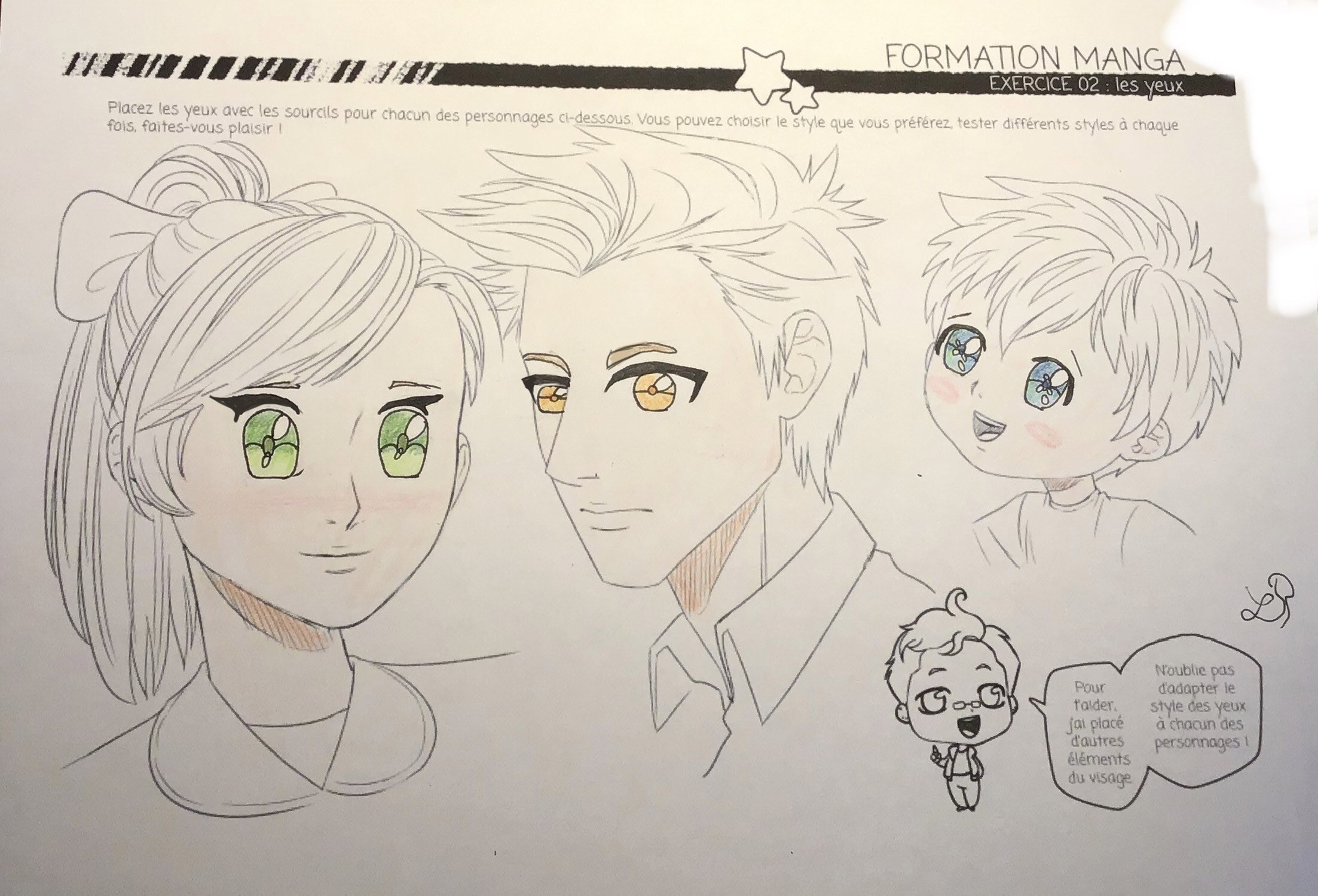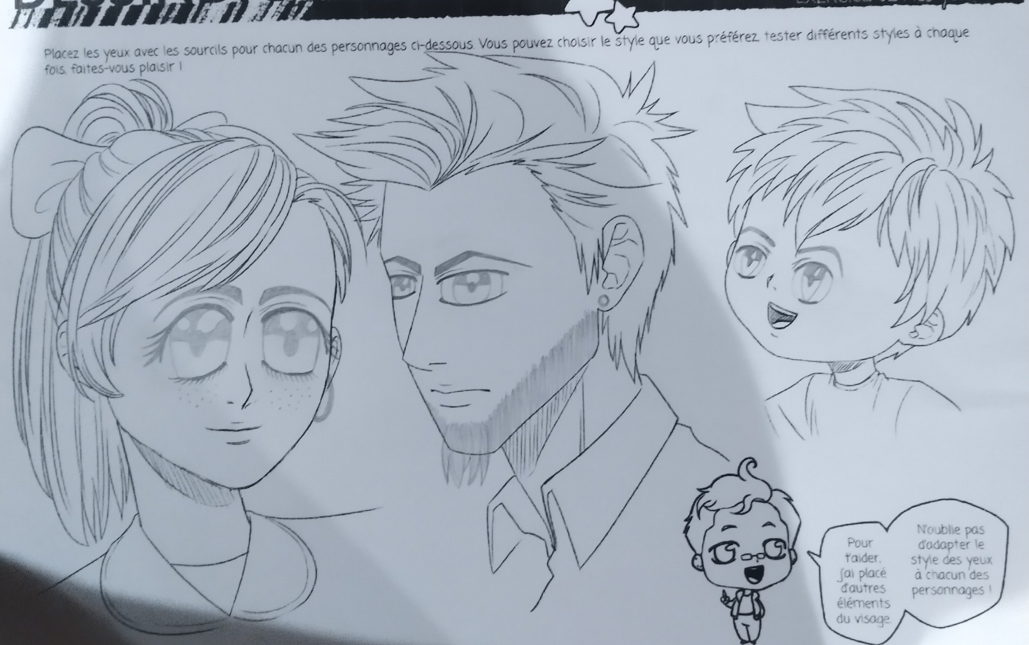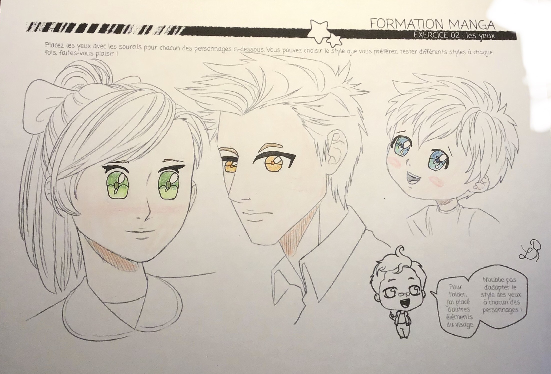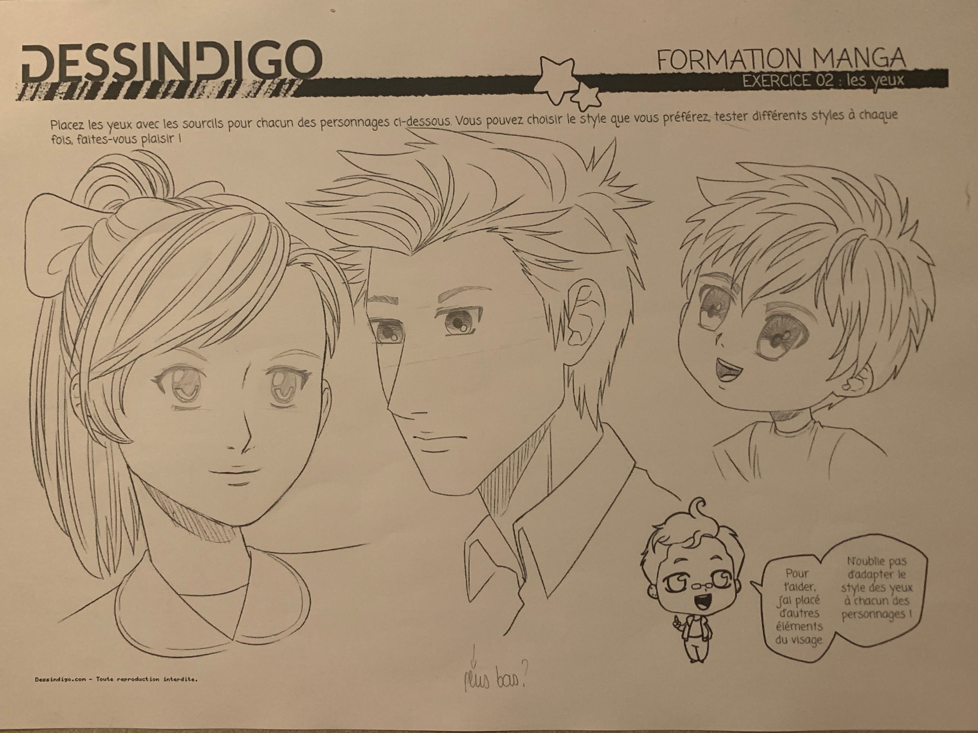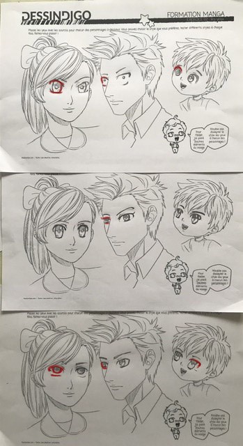 Je vais prendre tes 3 dessins, sur le premier, je vais te montrer les soucis d'angles, sur le deuxième, les soucis de placement et sur le troisième, je vais te corriger pour te replacer ça mieux. Il faudra que tu retravailles bien les yeux.