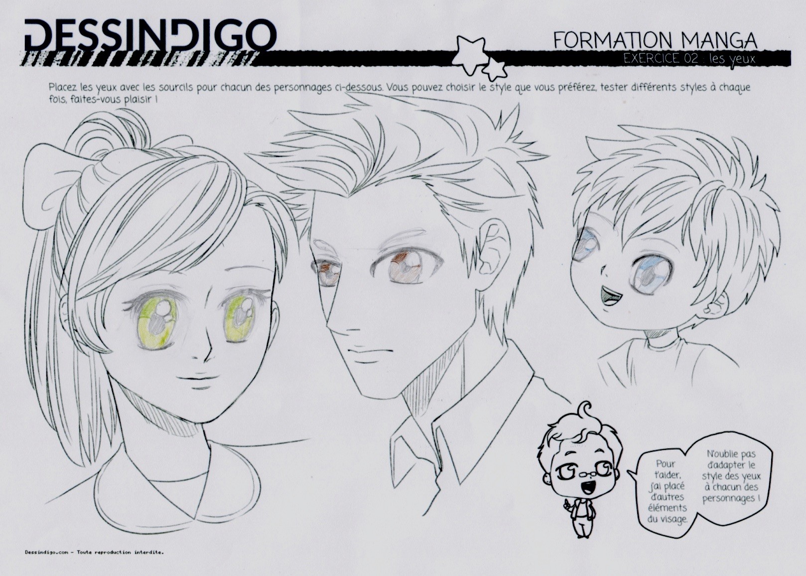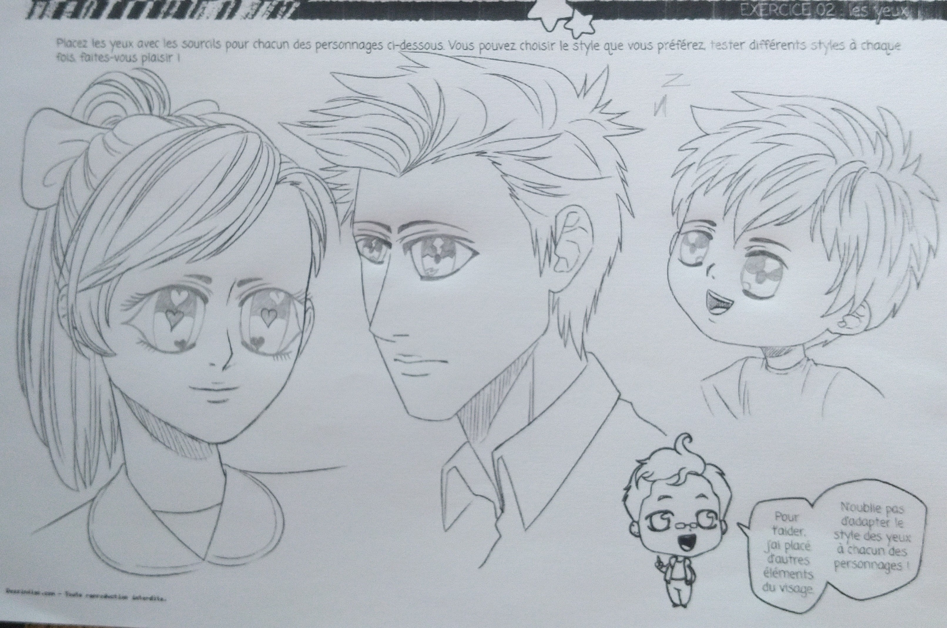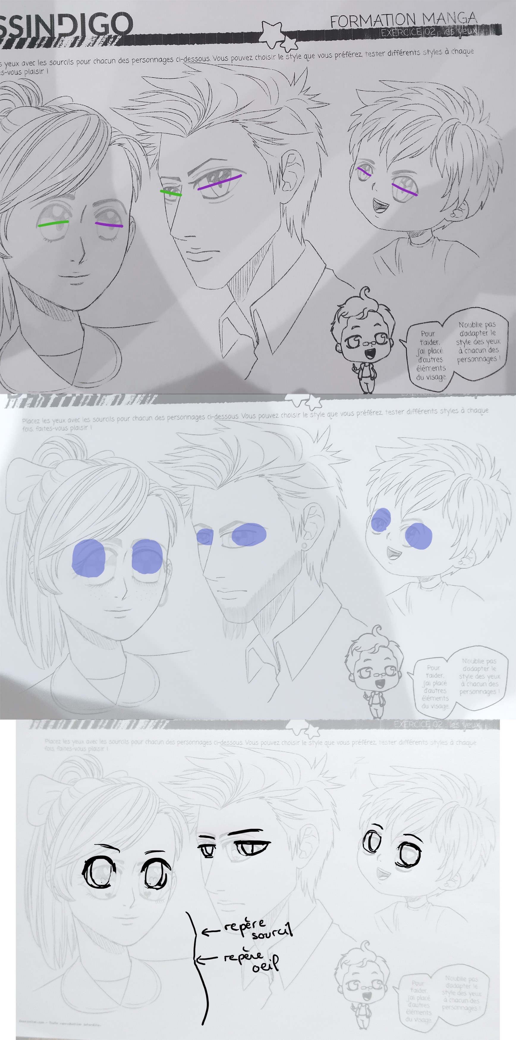 Alors reprenons dans l'ordre, déjà j'aime bien les customisations que tu as essayé pour les différents yeux. Mais attention, la customisation c'est la dernière étape. En premier, il faut bien placer et bien orienter les yeux. On comment toujours du général au particulier. Là, tes customisations sont très chouettes, mais comme les proportions et les angles des yeux ne sont pas bons, on n'y fait pas attention, c'est dommage.