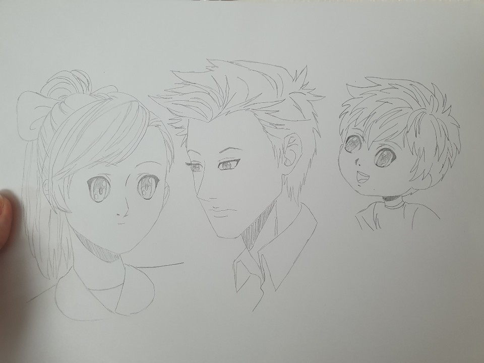 Pour l'homme, tu lui as fait un oeil (celui à droite) très grand, l'autre à gauche est situé un poil plus bas, il faudrait le remonter un peu pour l'aligner. Pour l'enfant, il a les yeux très très très écartés. En fait, l'oeil à gauche, est complètement à l'écart et incliné. Je te le corrige ^^