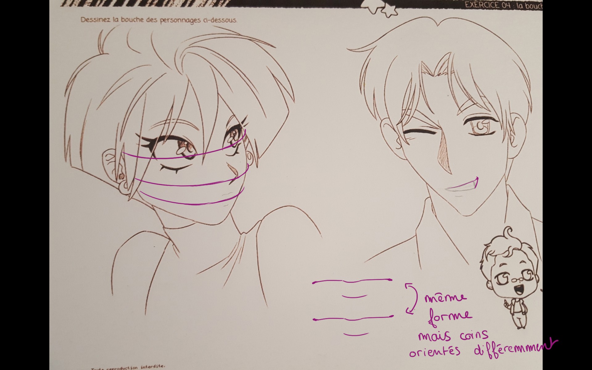 Pour la fille, je considère qu'elle ne sourit pas du tout, si sa bouche est censée être neutre elle devrait suivre un poil plus la courbe du visage (je te renvoie à la correction que j'ai mise à l'élève précédent ^^).