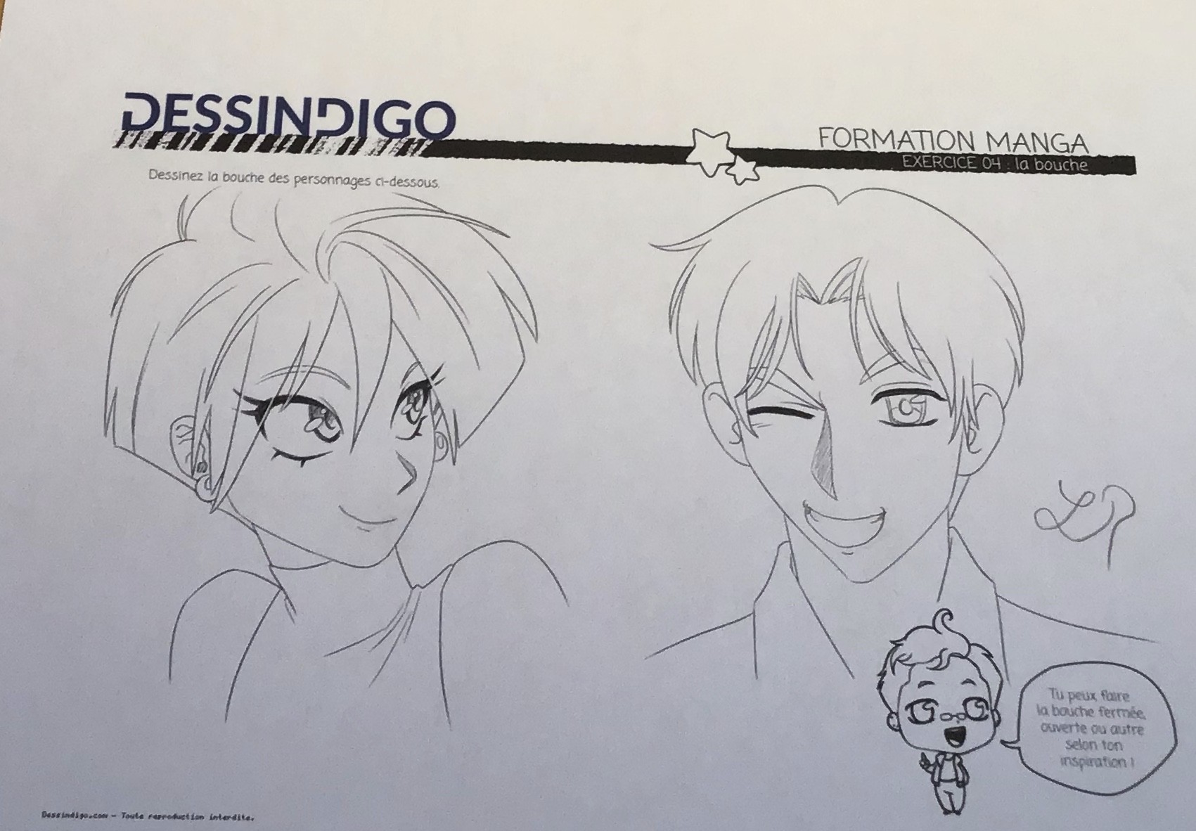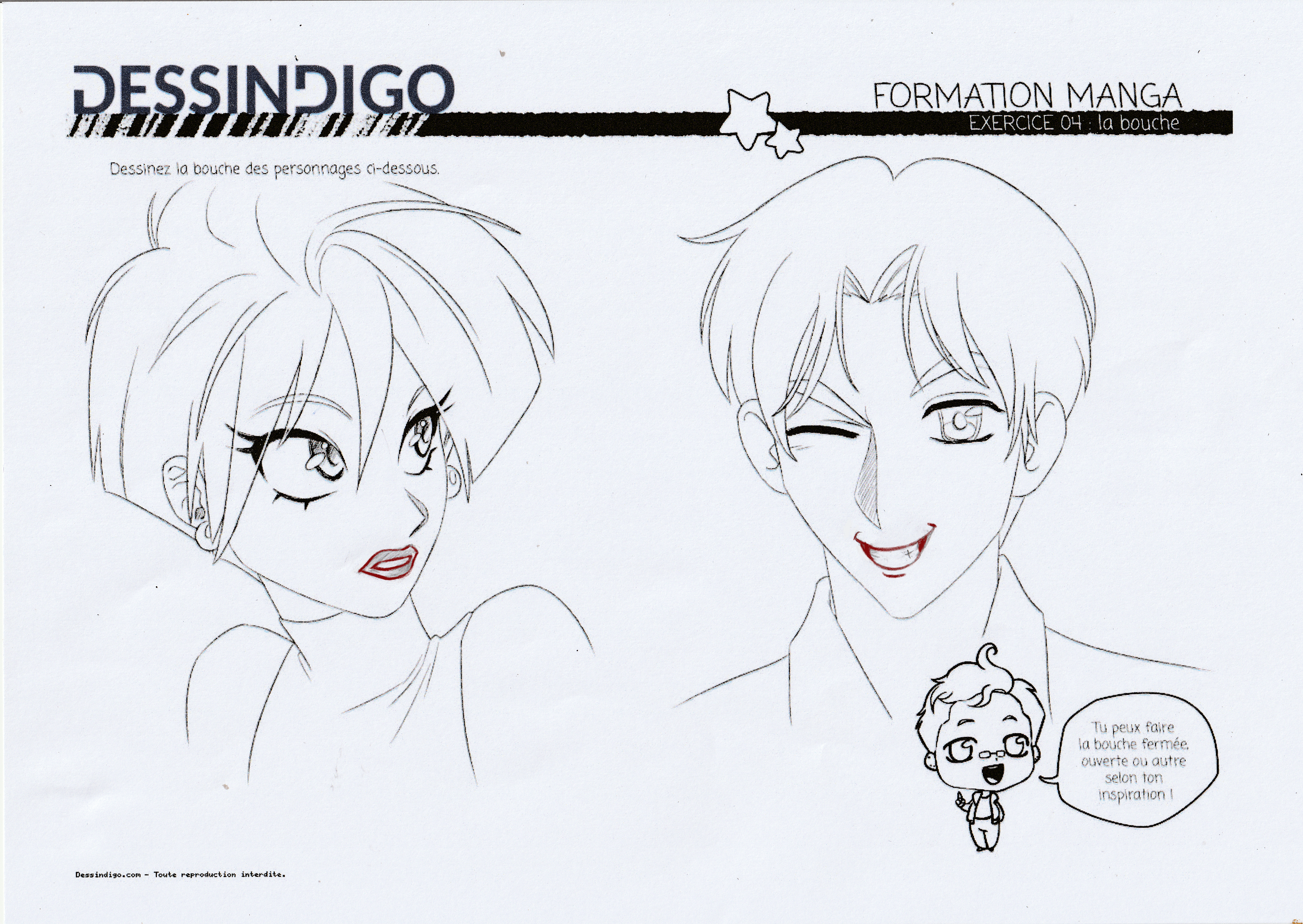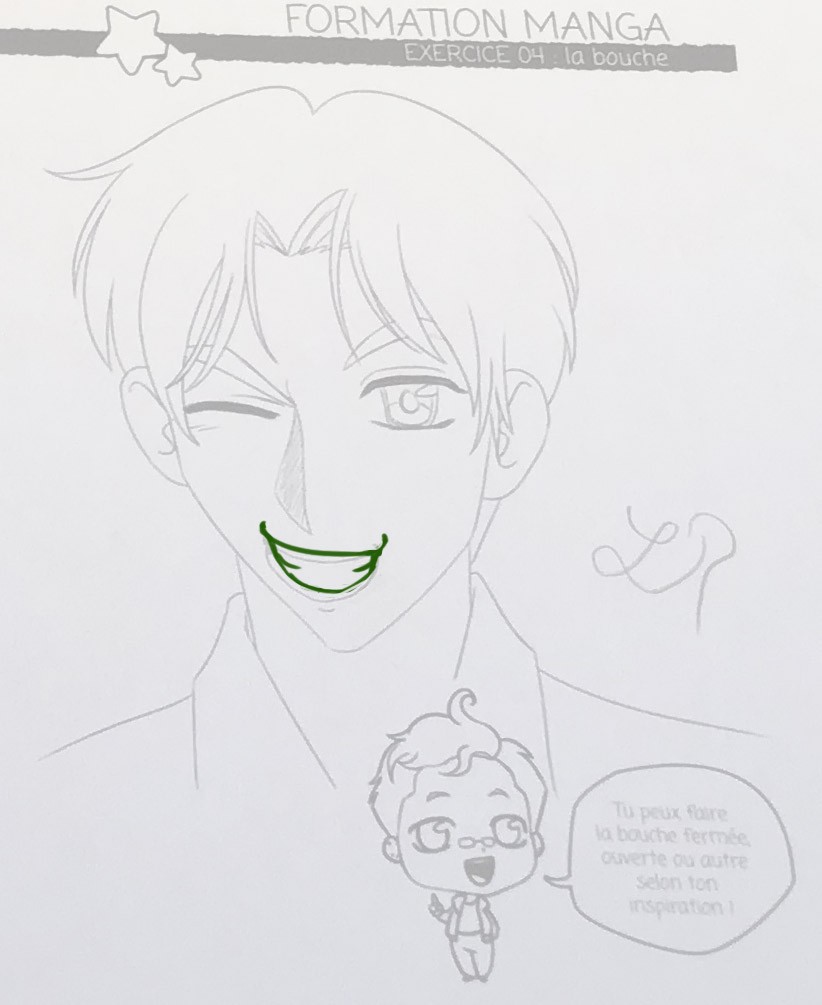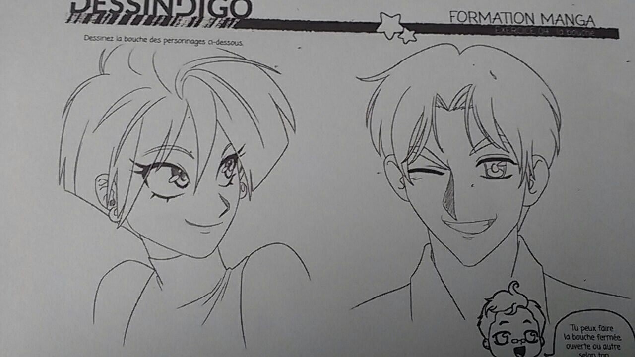 Pour le premier exercice, je te joins une correction. Ta première bouche est pas mal, mais elle ne suit pas le volume du visage (elle est en biais et comme sur une surface plate). Je t'ai fait un petit dessin rapide à côté d'une variante si tu veux pousser un peu plus le rendu ^^ Ca s'appuie comme toujours sur le réel, donc n'hésite pas à te regarder dans un miroir pour comprendre le pourquoi du comment :)