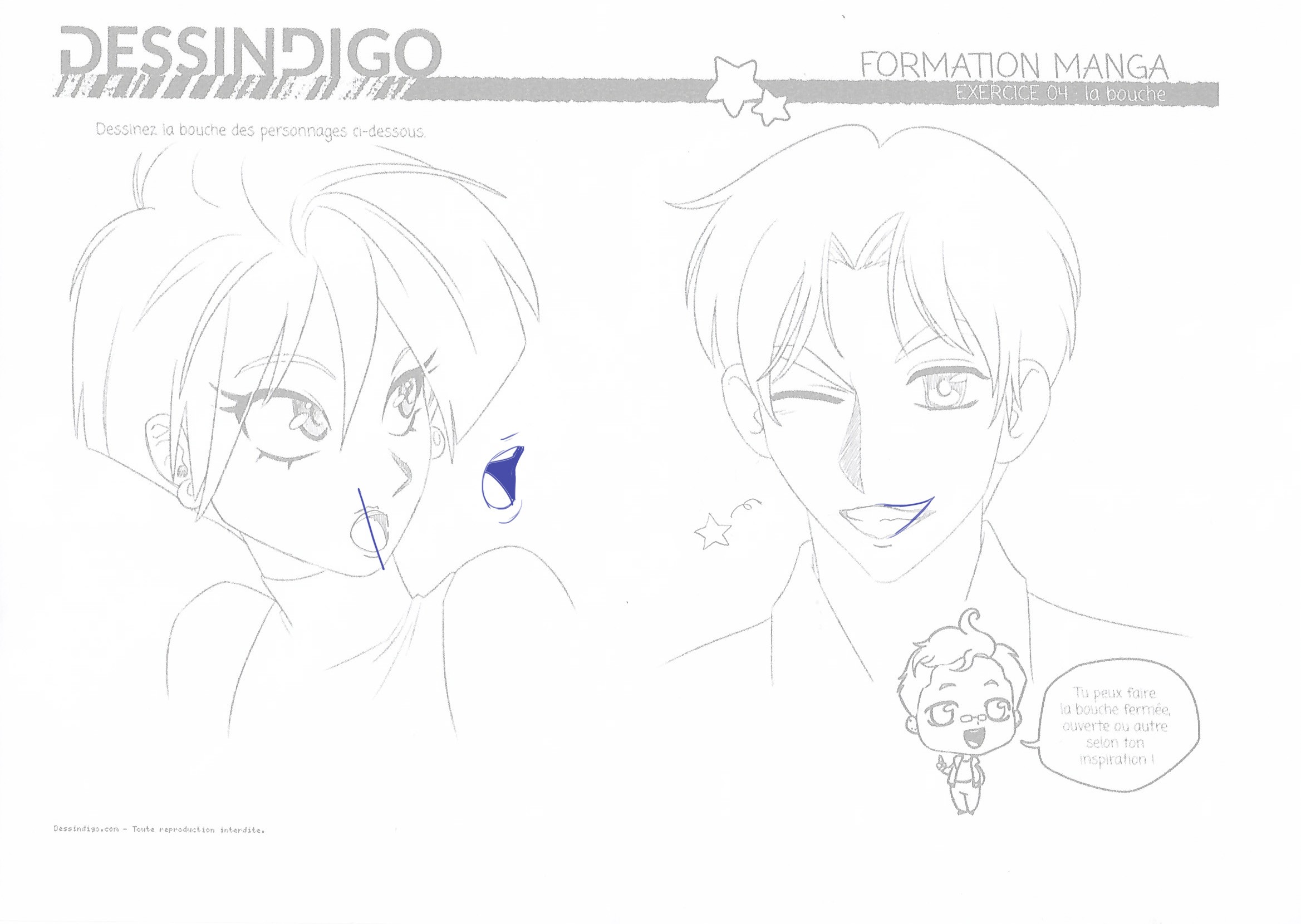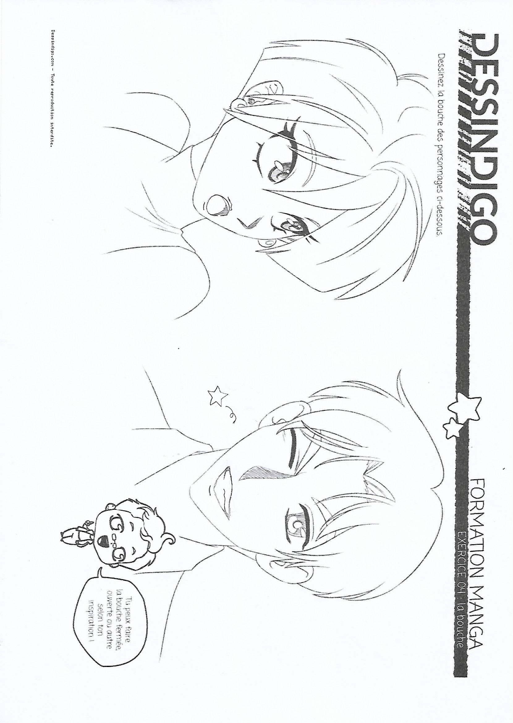 Du coup je te joins une petite correction rapide, attention à la construction du reste du visage aussi. Le placement des éléments, leur taille et leur style sont importants. C'est l'ensemble qui créera un visage manga. Par exemple sur le visage en bas à droite, les oreilles sont beaucoup, beaucoup trop hautes.