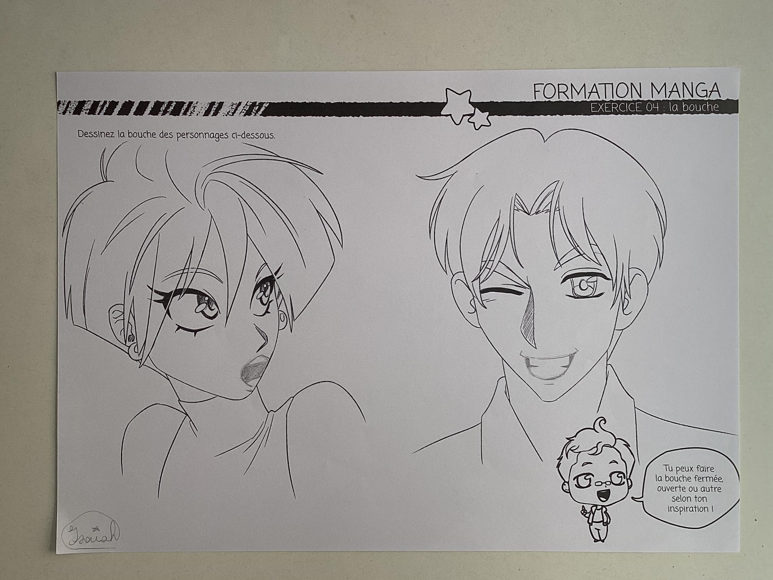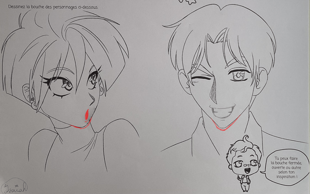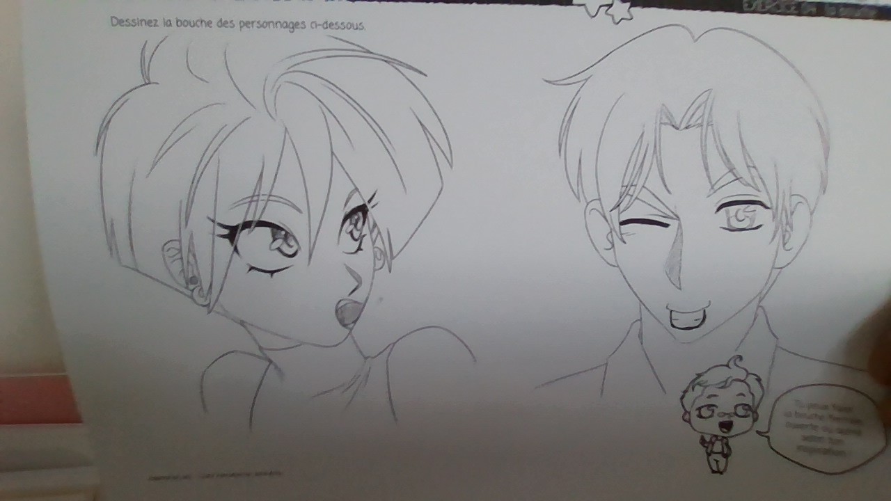 La bouche du garçon est très bien faite, en plus de lui donner ce caractère espiègle qu'elle projette. De mon côté, je te donne une petite correction pour la fille : dans le manga, on dessine généralement la bouche de surprise avec une sorte de petite goutte, surtout quand il s'agit de personnages féminins. Garde aussi à l'esprit que lorsque l'expression demande une ouverture de la bouche, il est nécessaire de baisser le menton en conséquence. C'est un petit conseil, pas une correction, haha !