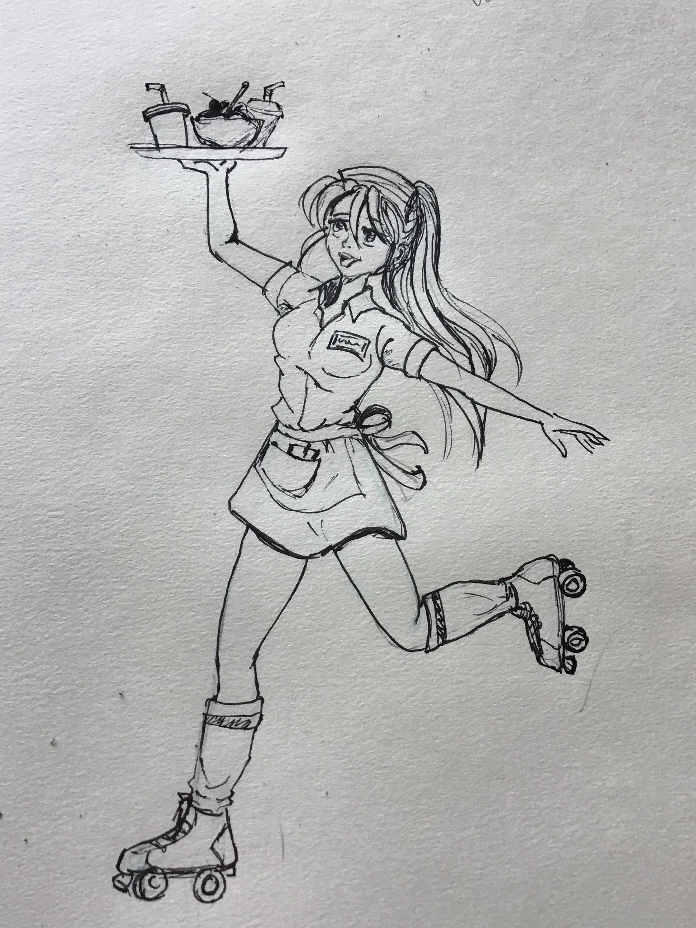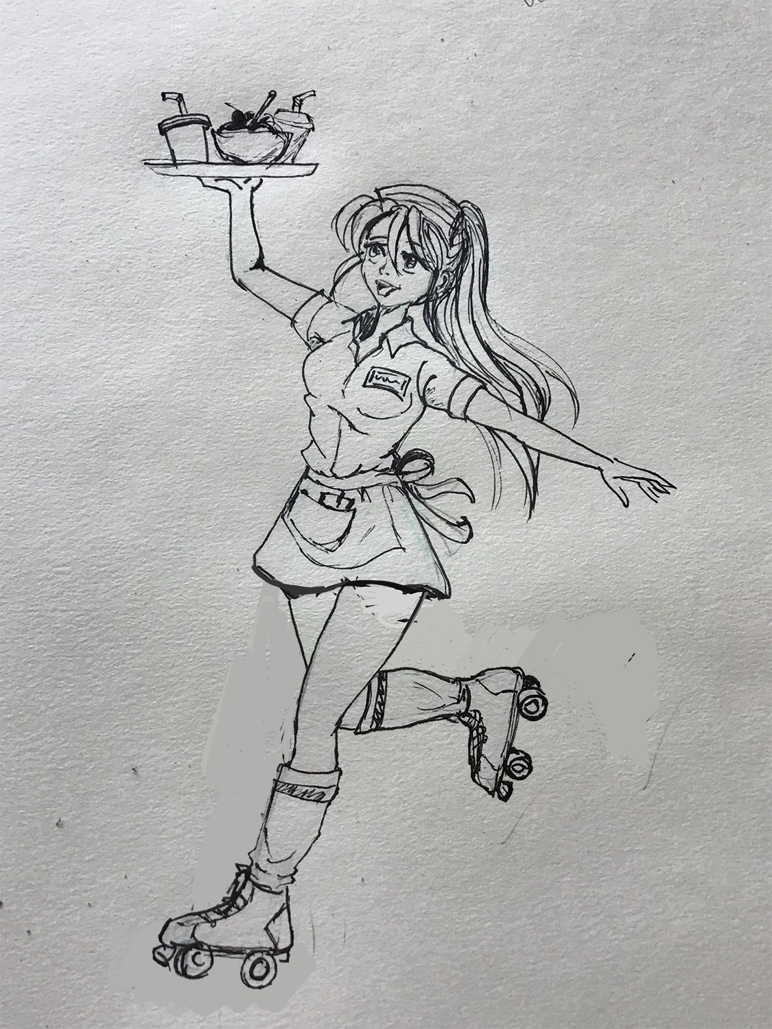 C'est très chouette, j'aime beaucoup l'expression de son visage et sa pose, mais j'ai un petit bémol. Elle semble en train de se déplacer, si tu as déjà fait du patin à roulette ou du roller, du as dû remarquer que ça se passe un peu comme du patin à glace ou plus simplement, de la course. Ça signifie que si une jambe avance, le bras du même côté recule. Je te montre un exemple ici : https://www.letelegramme.fr/ar/imgproxy.php/images/2017/06/14/anaelle-sanson-a-ete-jusqu-au-bout-de-ses-forces-de-la-nuit_3478741.jpg?article=11555406&aaaammjj=11555406