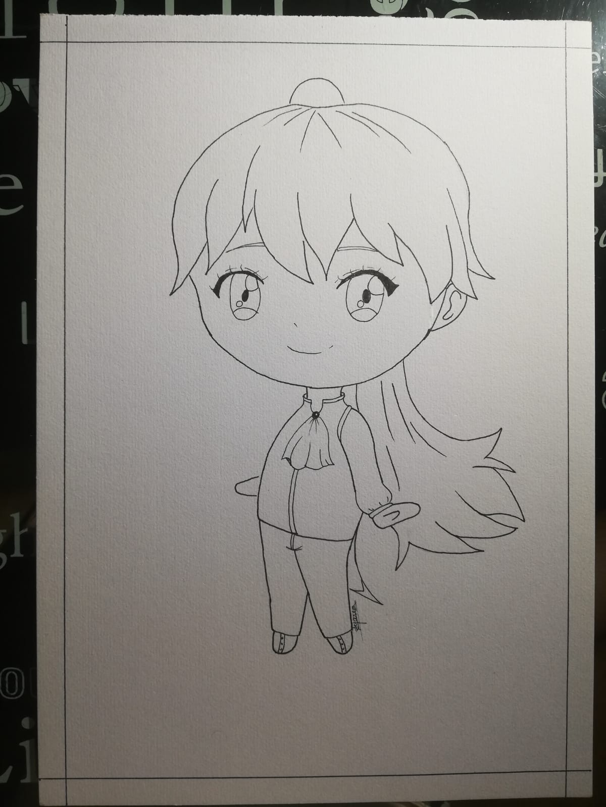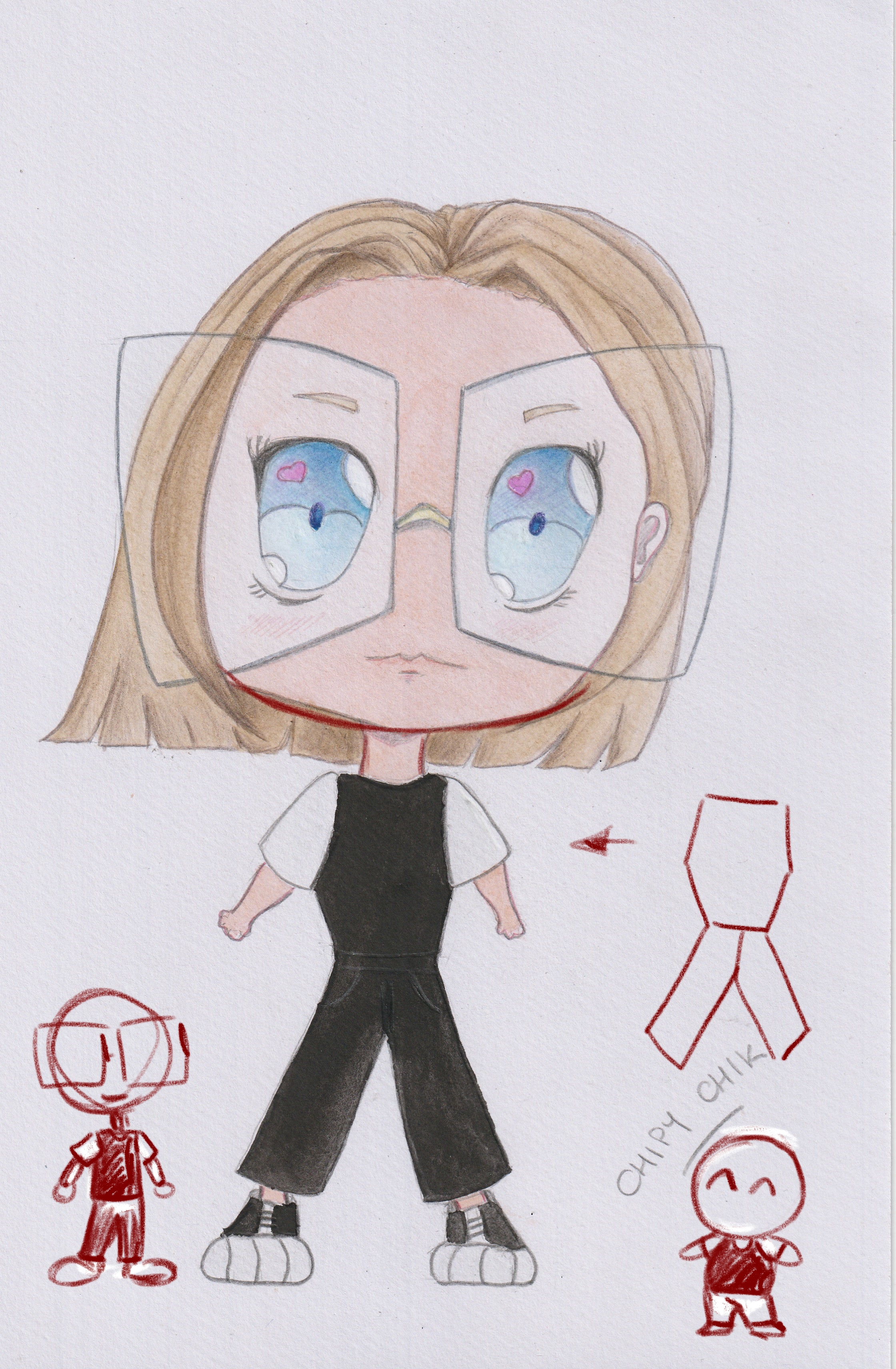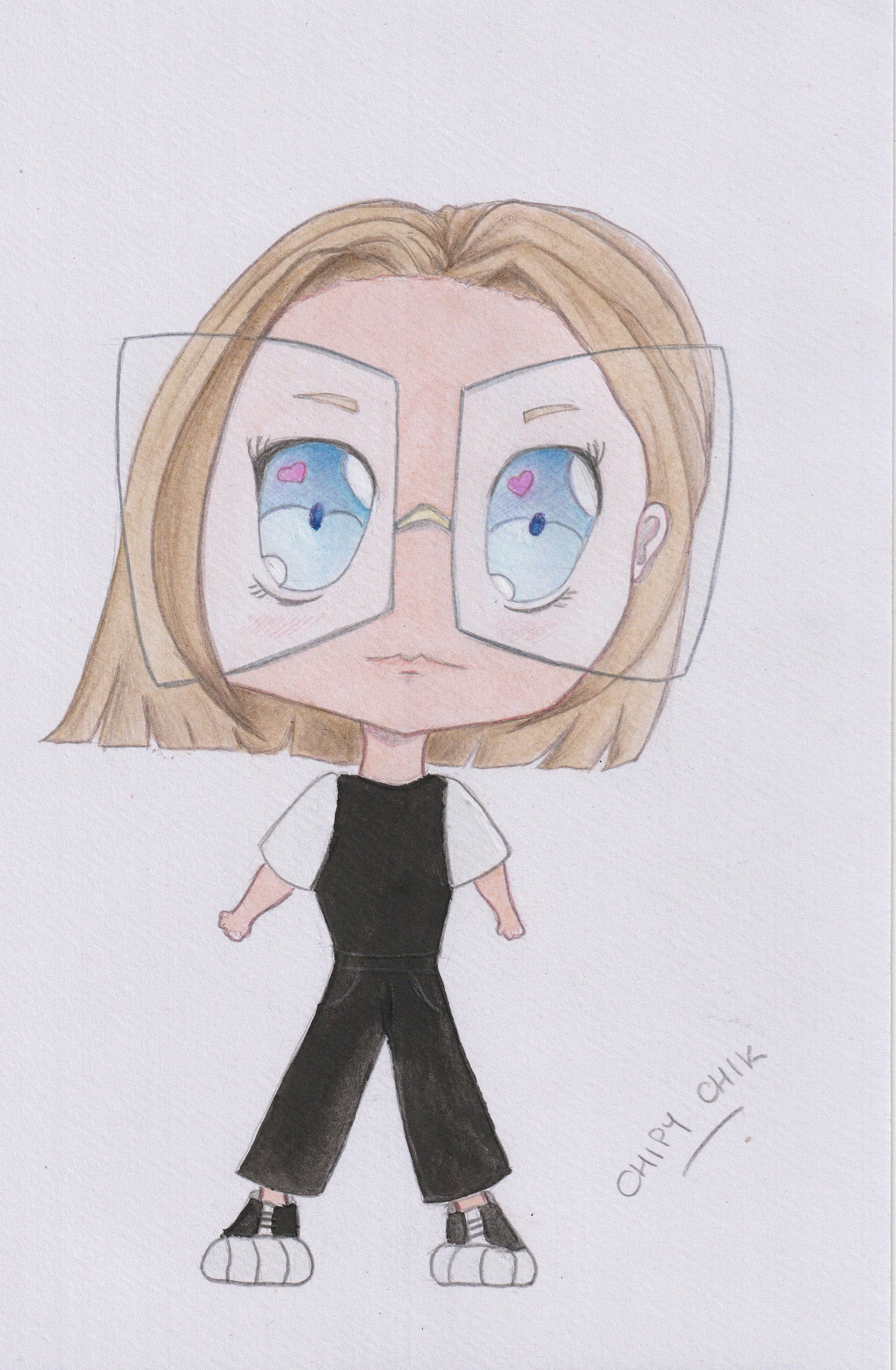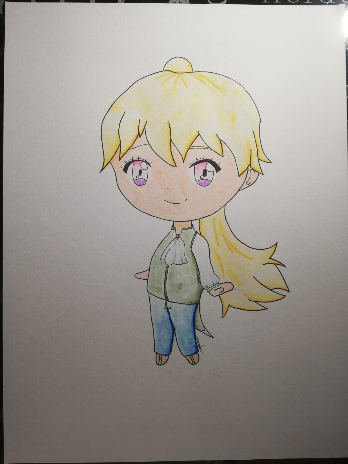 Well, the skin color of the chibi is very special I admit, and it's really not easy to keep spreading the paint without letting it dry, or leaving "stains". I already struggle normally with shadows but here with the colors, I feel it's even worse, I don't really like what I did with the pencil in the character's hair. For the black outline of the eyes, I did it in watercolor which makes the lines thicker...
