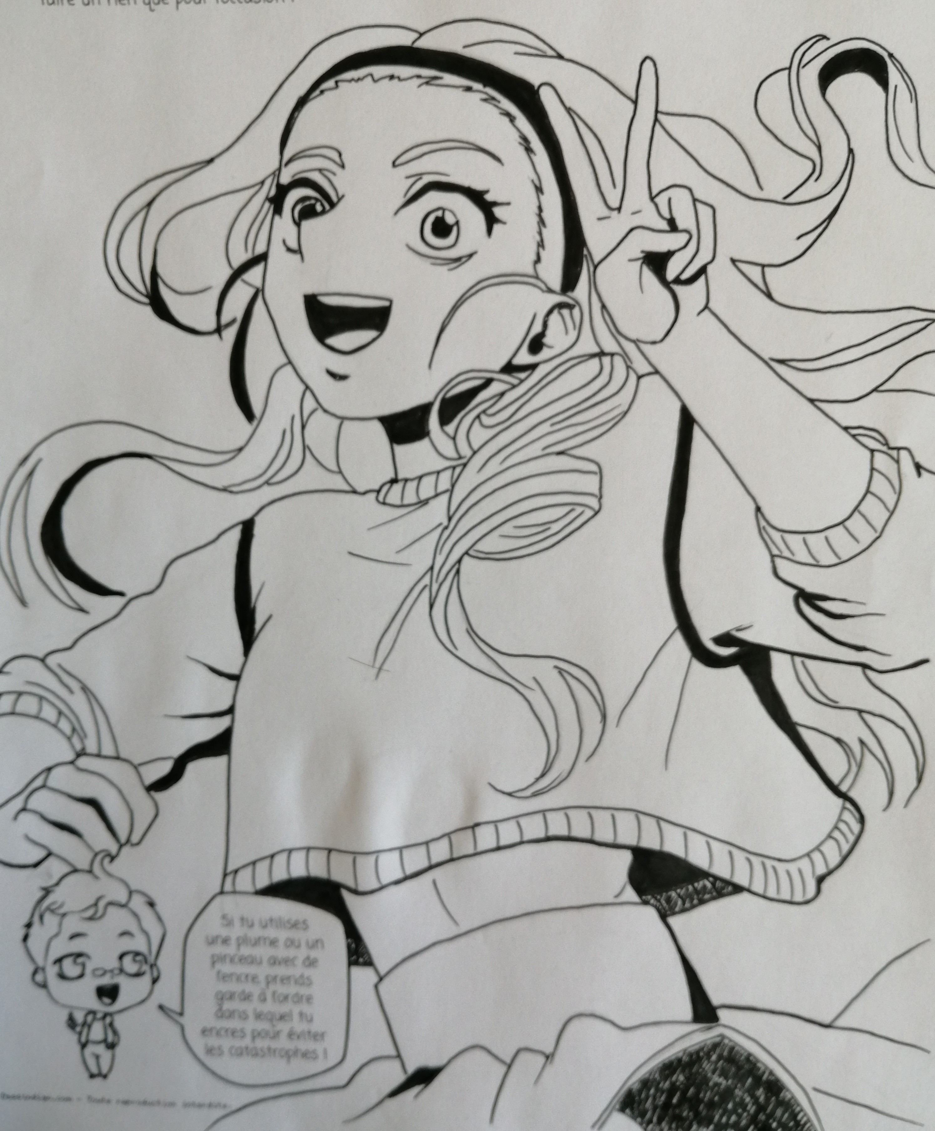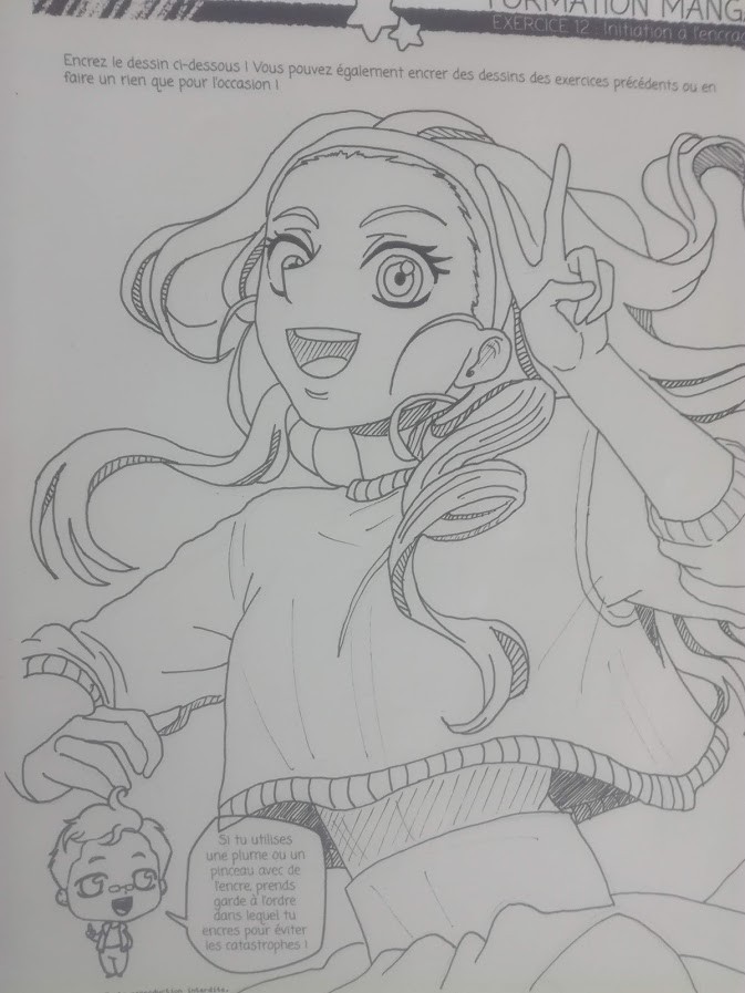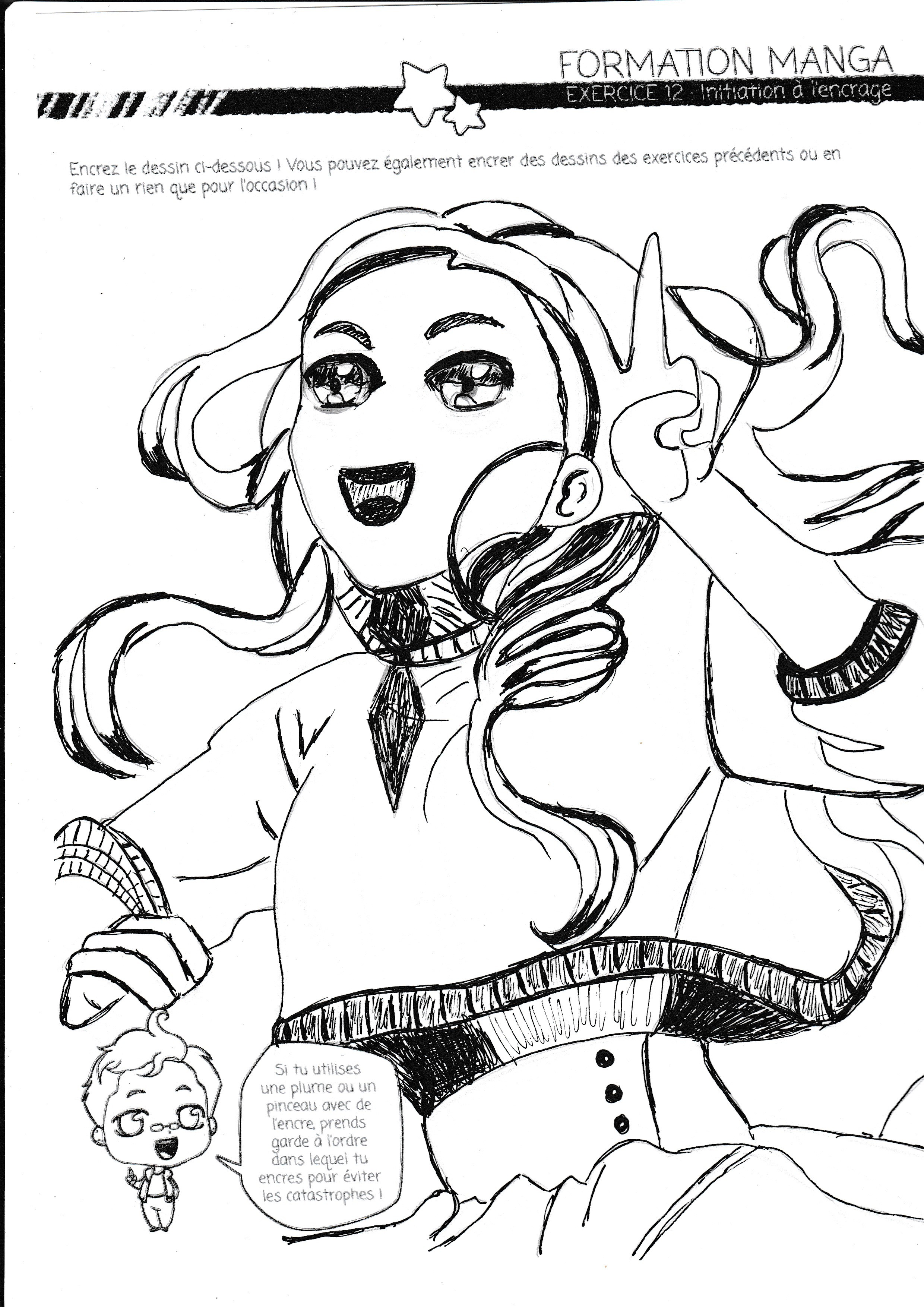 Si tu ne suis pas ce que tu as fait en-dessous, du coup, c'est problématique. N'hésite pas à t'entrainer, ça prend un peu de temps avant qu'on se sente à l'aise et qu'on arrive à faire des jolis traits. Prends ton temps, n'essaye pas d'aller trop vite et suis bien ton dessin en-dessous. Tu vas probablement bouger certaines choses malgré toi (sur les cheveux par exemple), parce que tu es partie sur une courbe légèrement différente qui décale un peu la mèche, etc. Mais globalement, le but du jeu c'est de bien suivre le croquis de base ^^